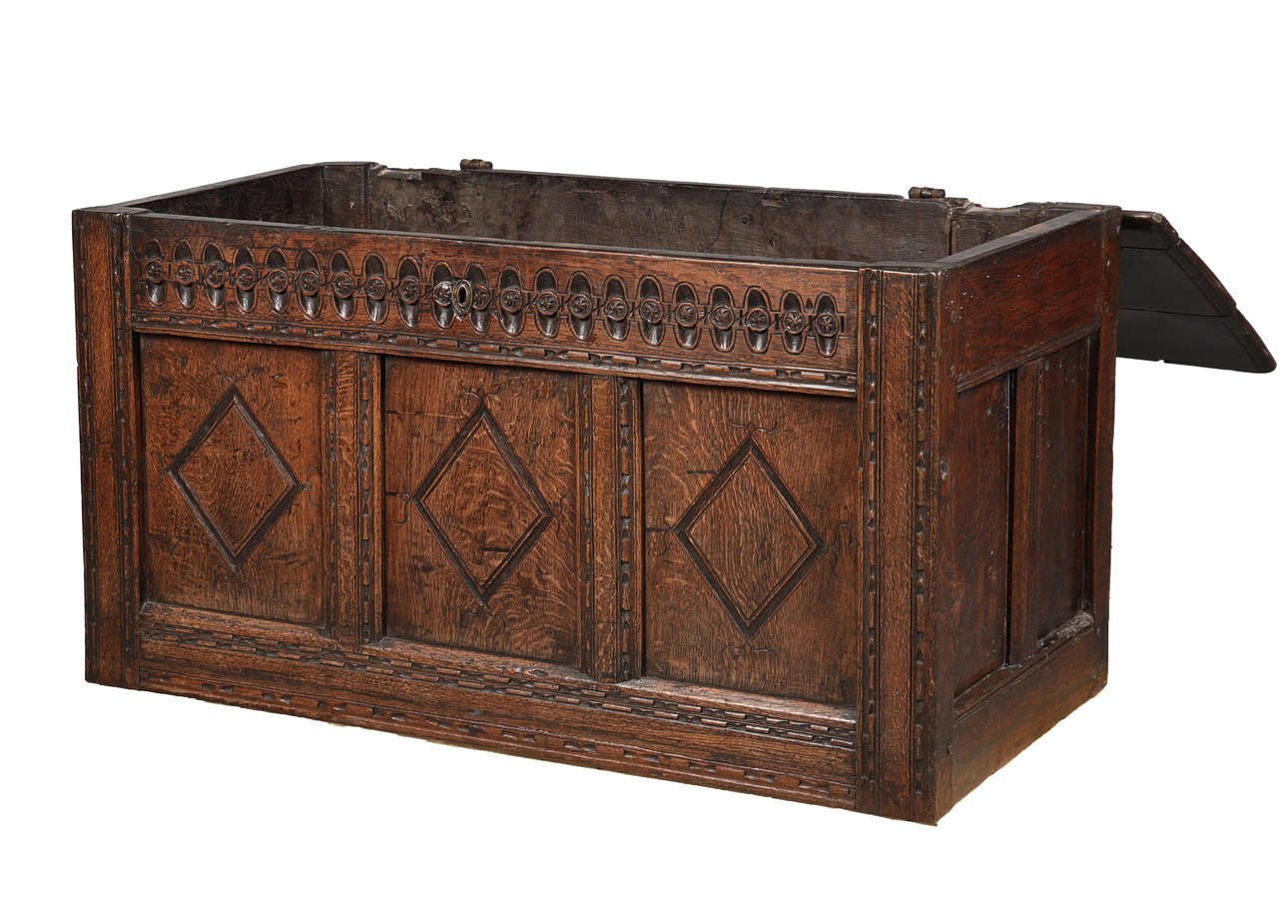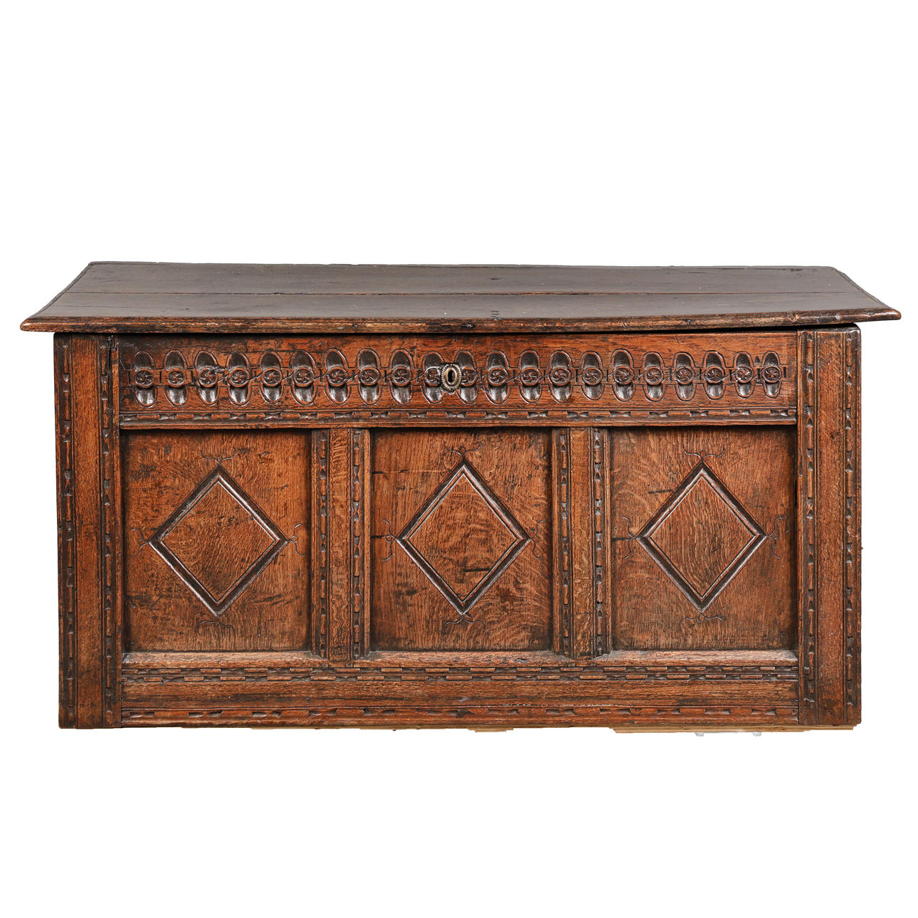 Having a rectangular top with a ovolo moulded edge above a guilloche frieze and three diamond lozenge panels, 122cm wide 62cm high 55cm deep.