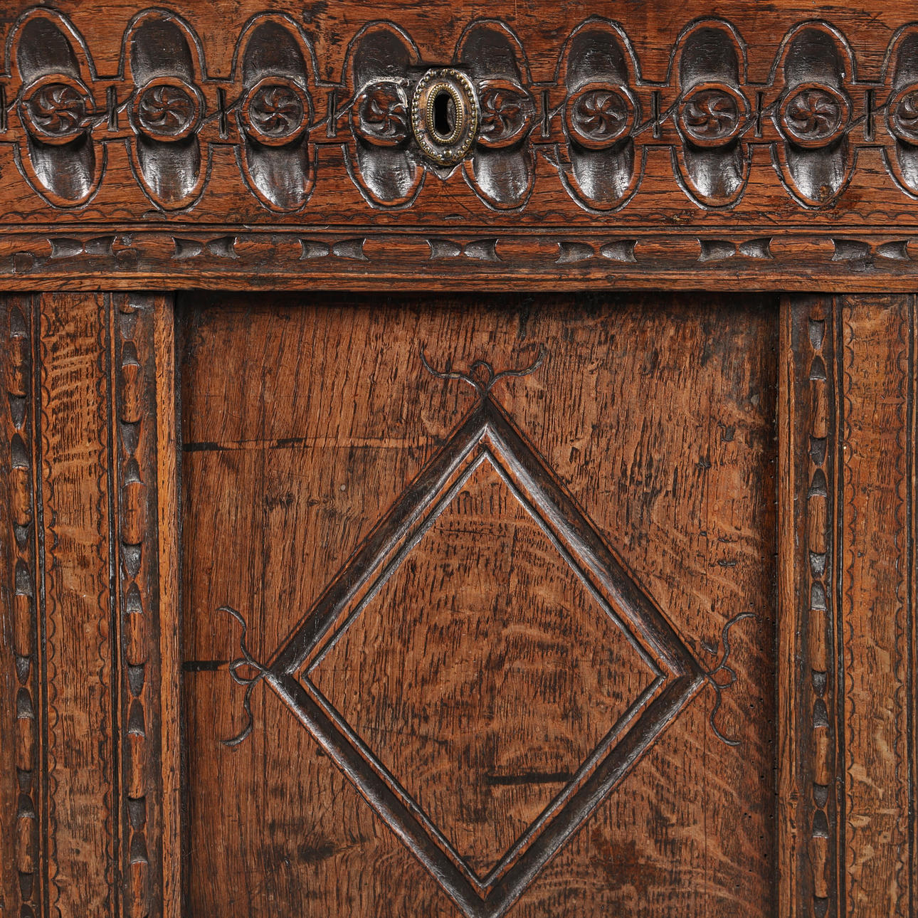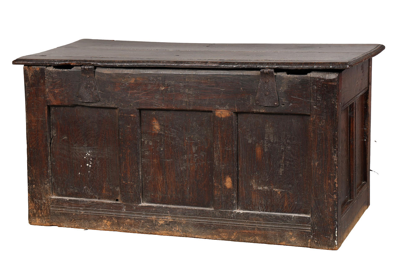 4696828. A 17TH CENTURY CARVED OAK COFFER.