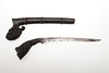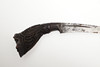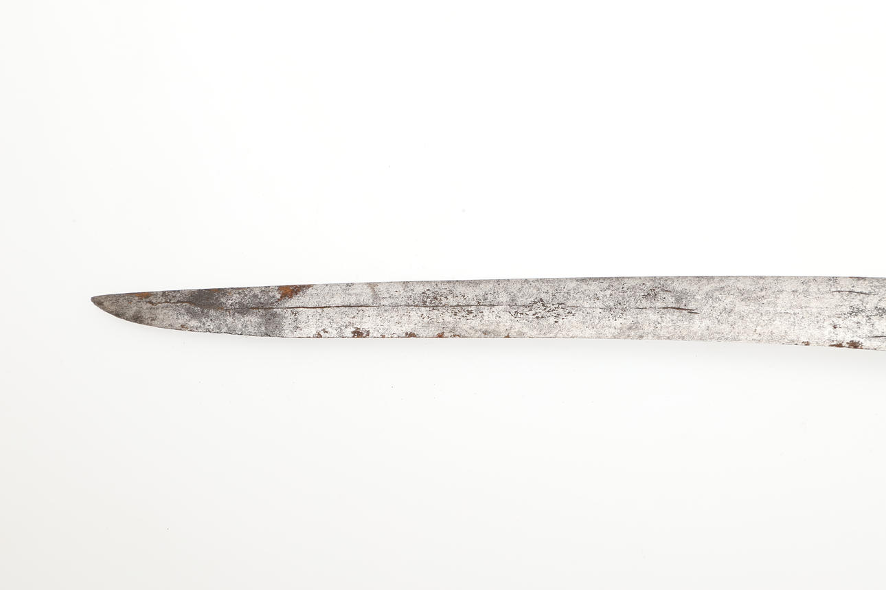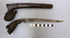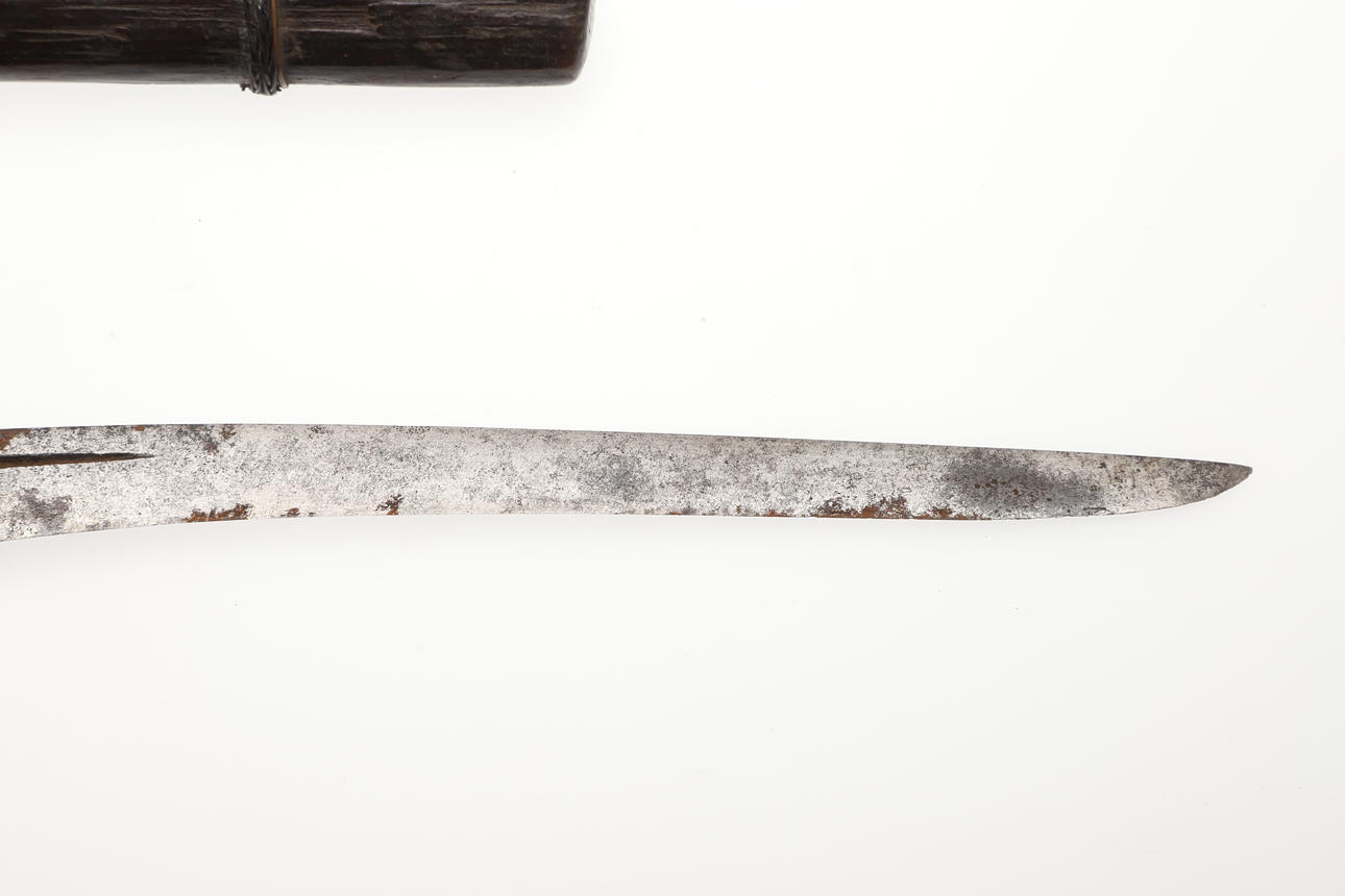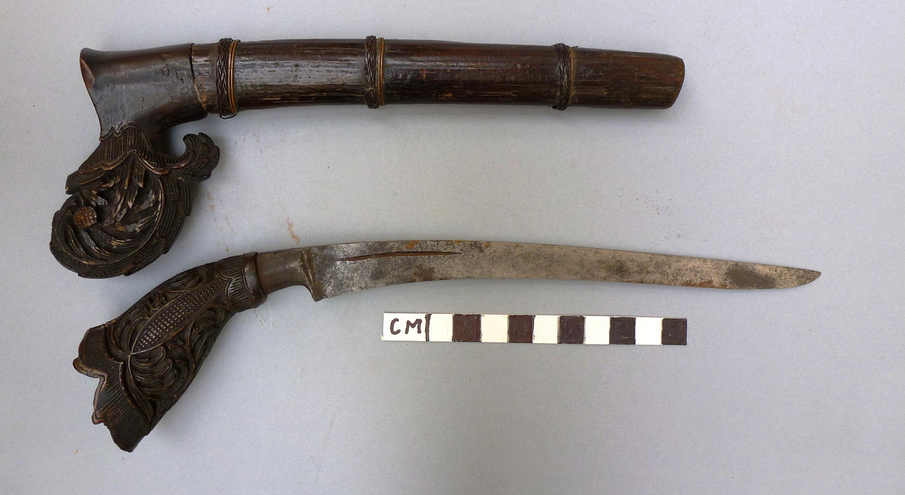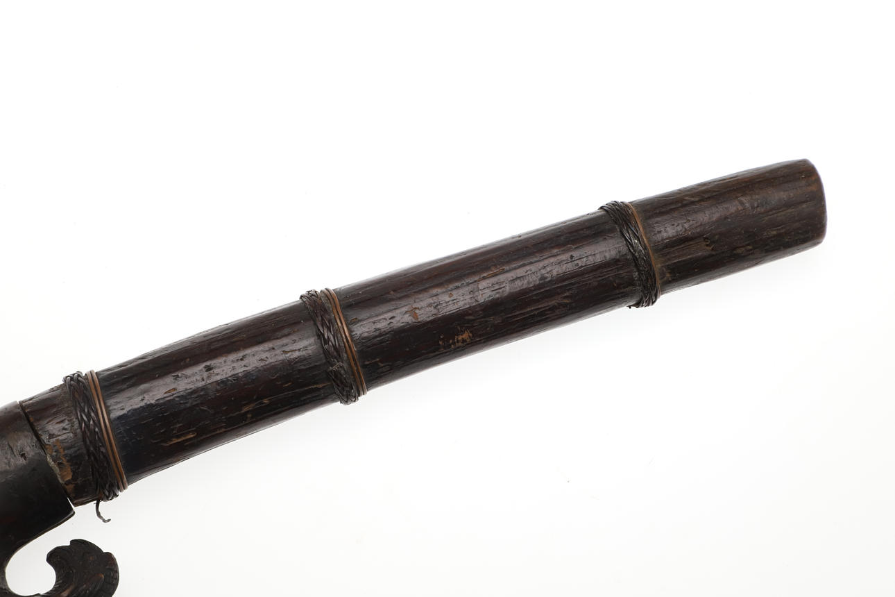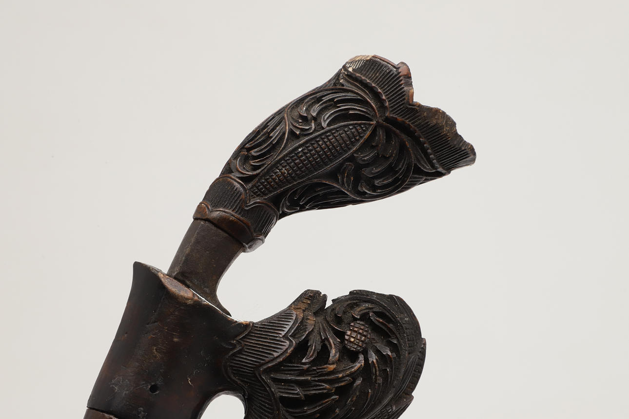 With a 20 cm curved pointed blade with serpentine cutting edge and short fuller. On an elaborately carved wooden hilt with scrolling foliate patterns. The scabbard with similar offset carving, and bound two-part body. 29 cm.