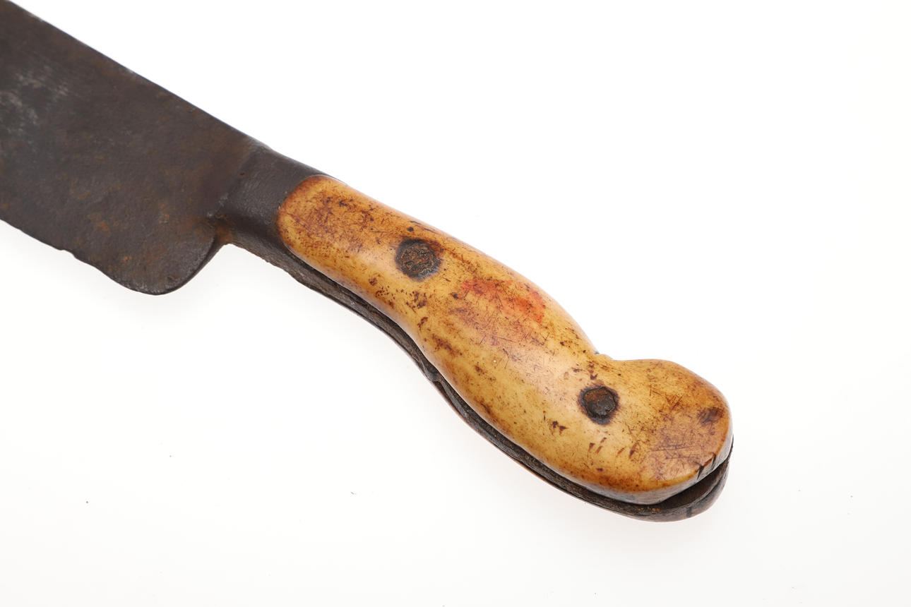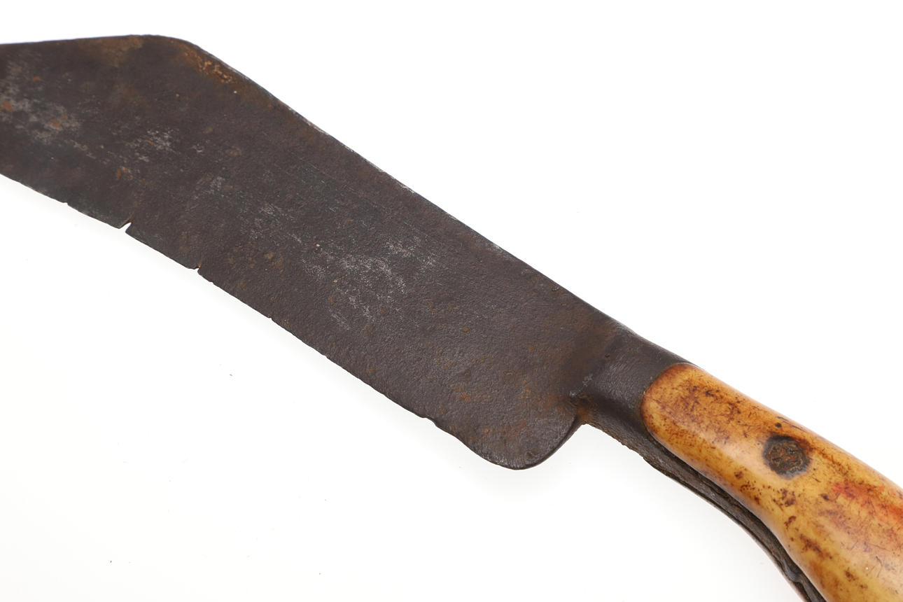 Having an 18 cm broad blade with pointed end and slightly curved blade, the shaped grip mounted with bone scales. 28 cm.