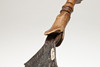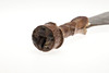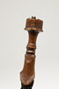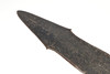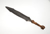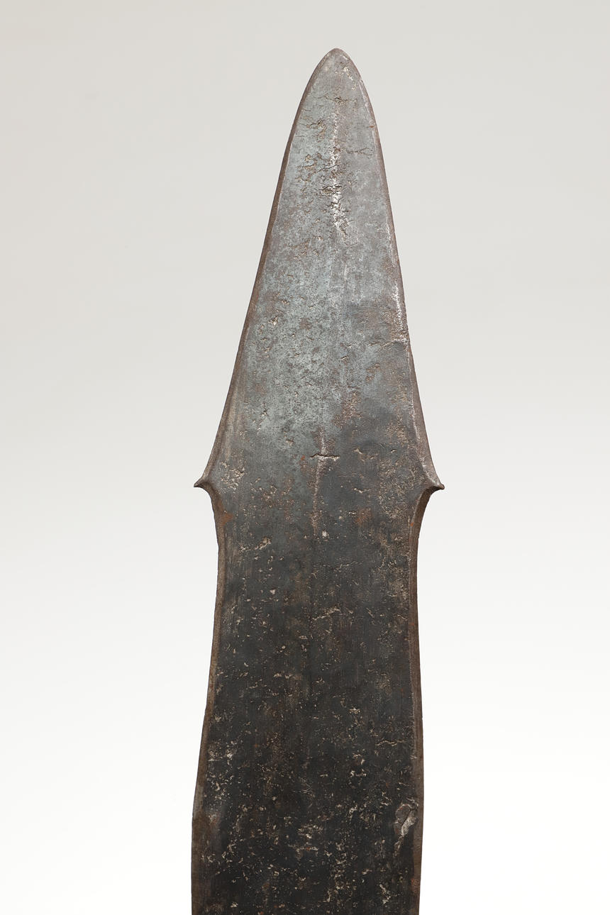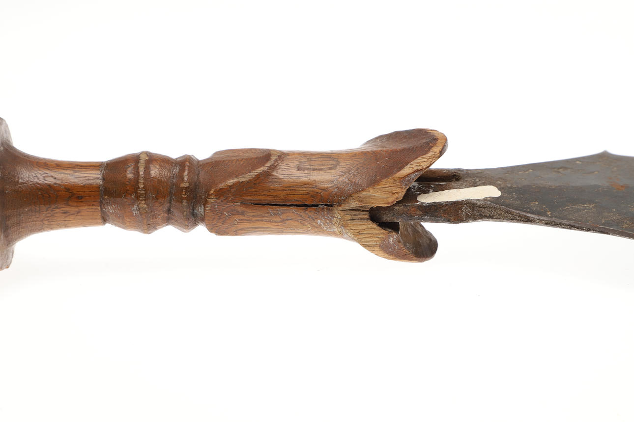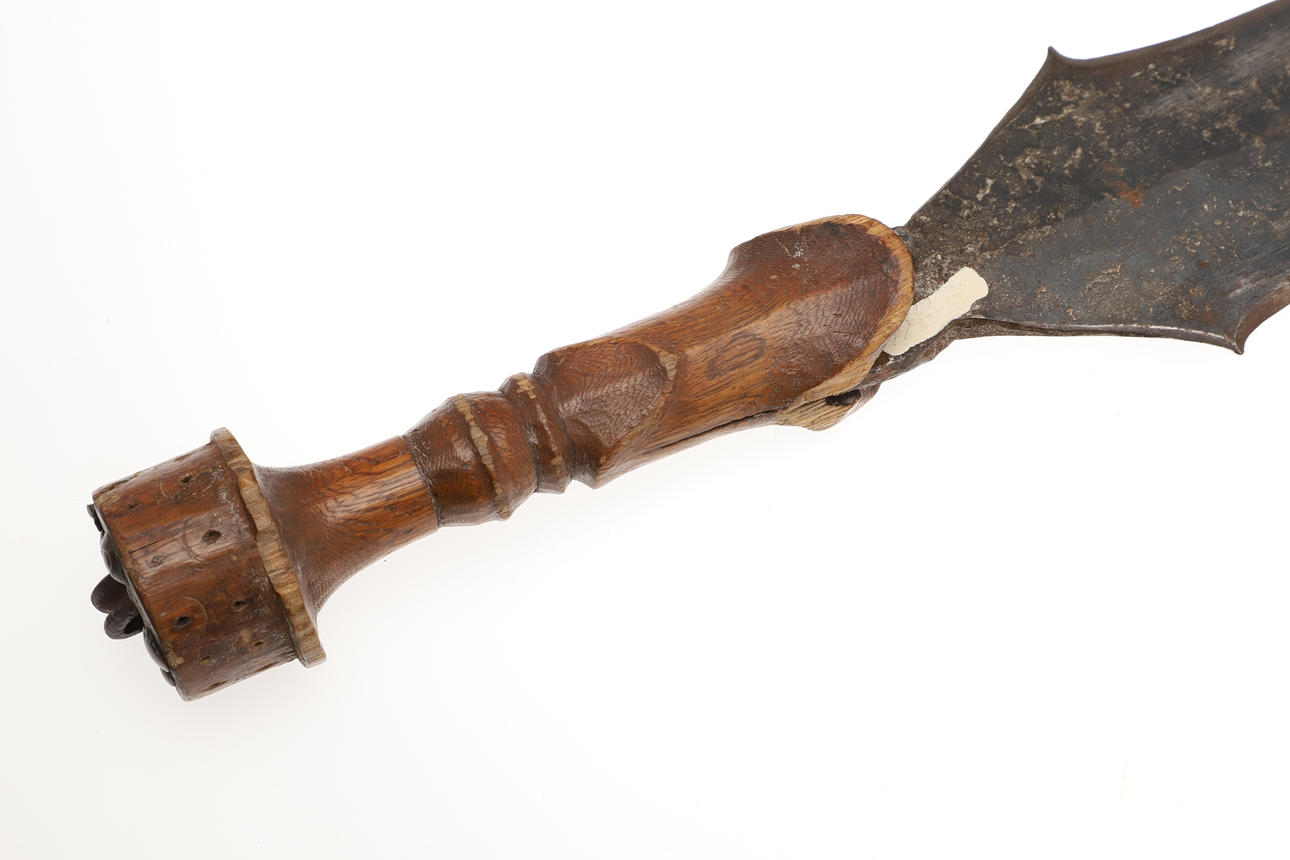 The 44 cm shaped blade with a central spine and pointed tip, sharpened to all edges. On a short wooden grip with nail decoration to the end. 57 cm.