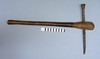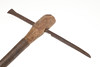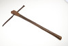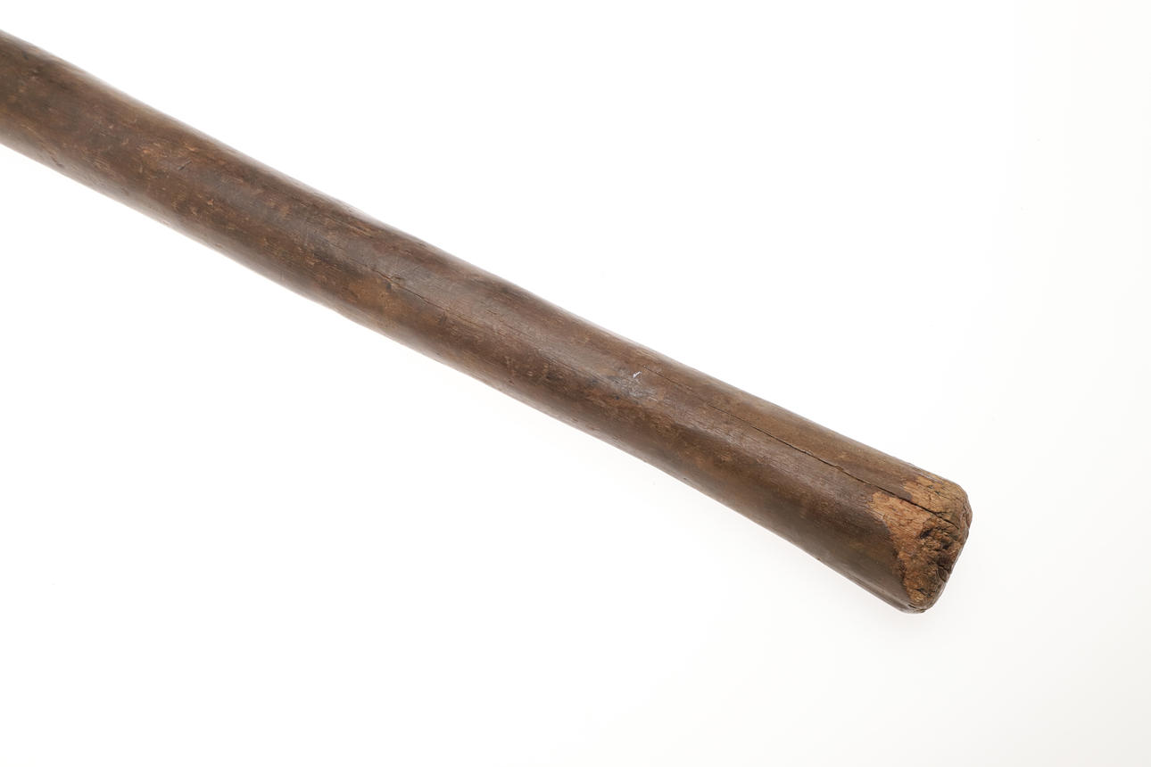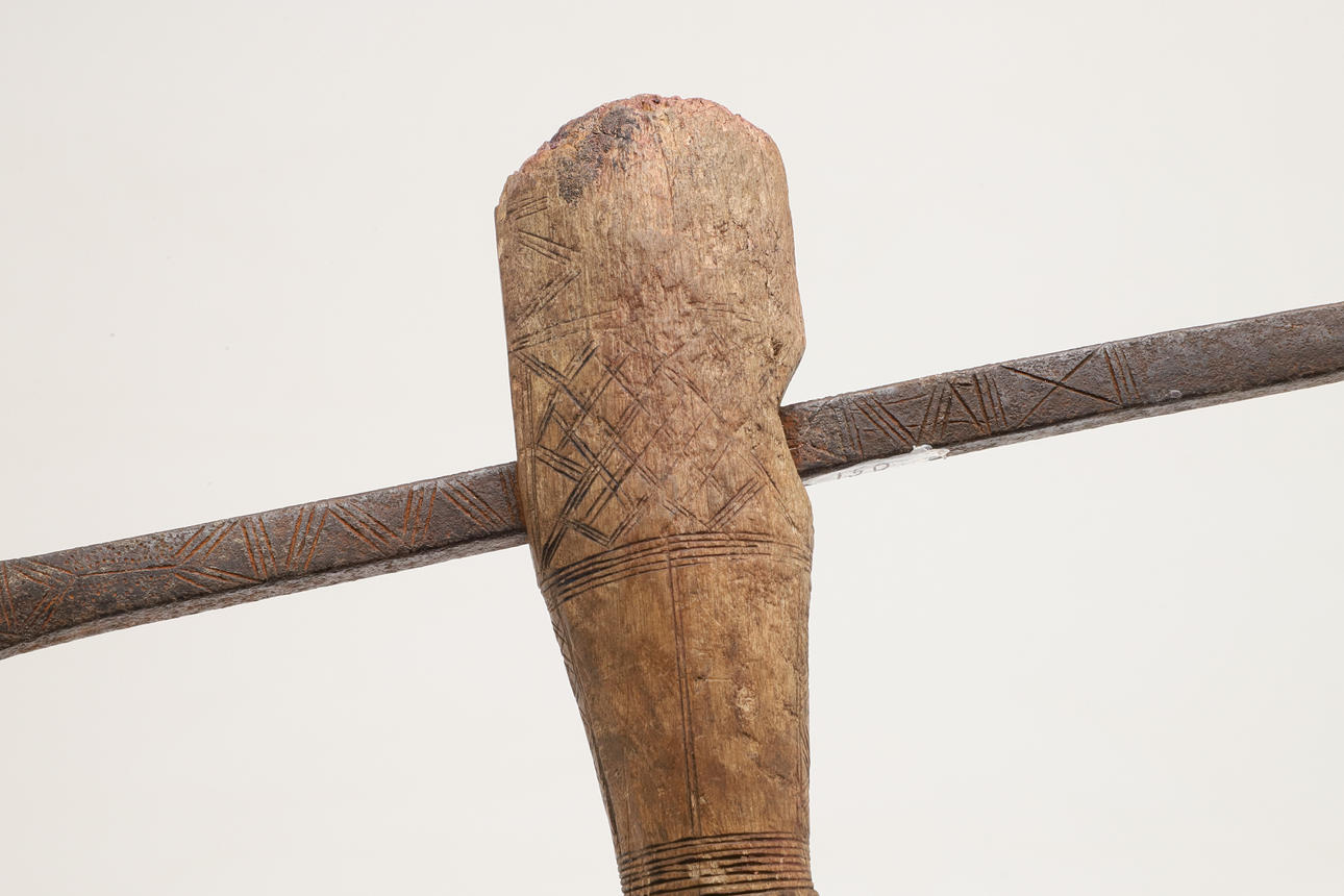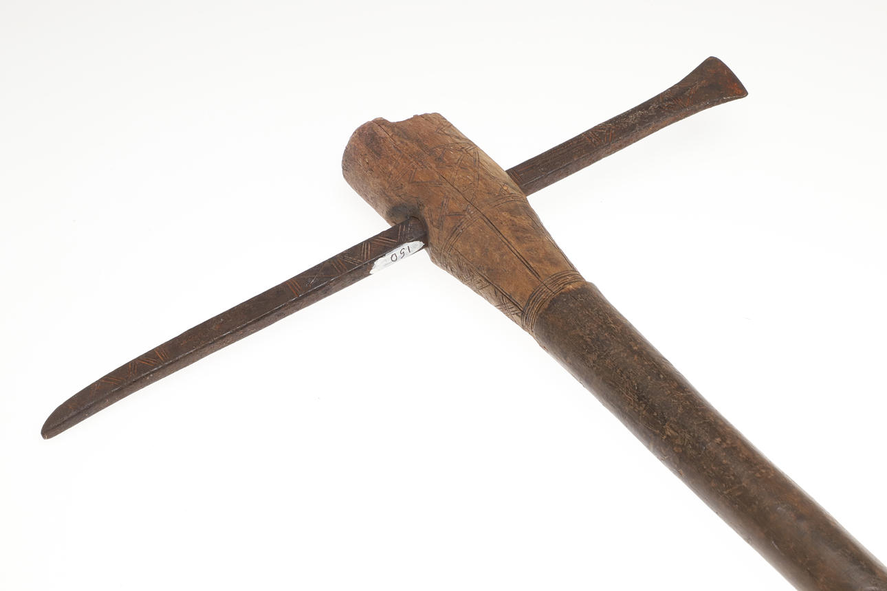 With a 36 cm spike type blade with flared 'axe' to one end and point to the other, decorated with incised geometric decoration. On a wooden haft. 63 x 37 cm.