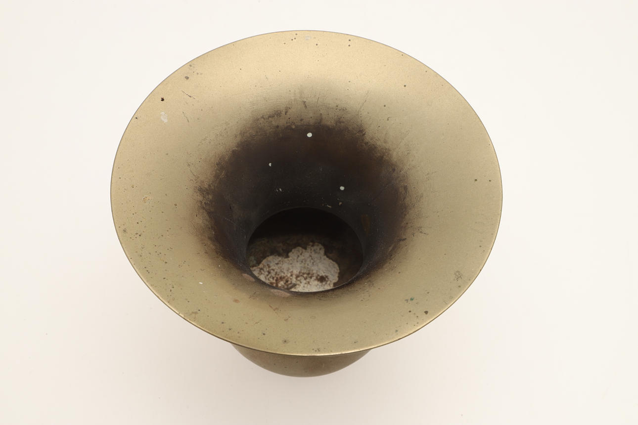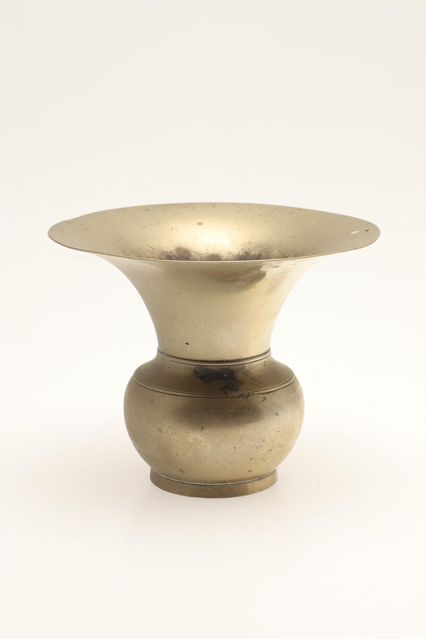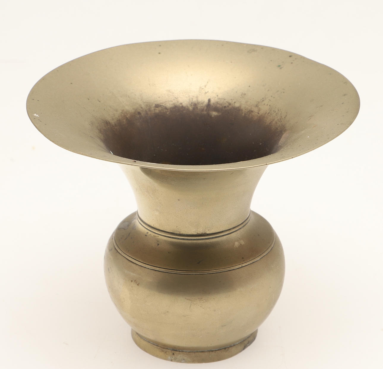 A brass spittoon of short vase form with flared rim, baluster body and short foot. 9.5 cm high 12 cm wide.
