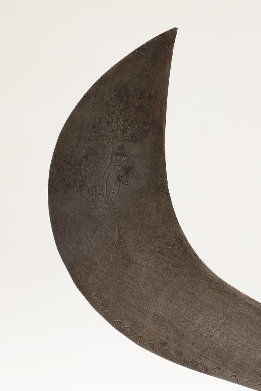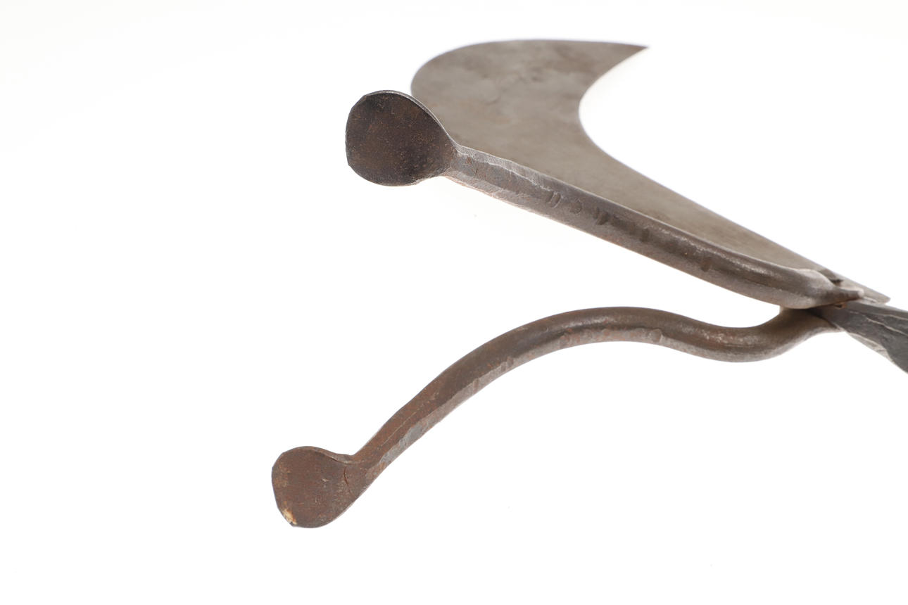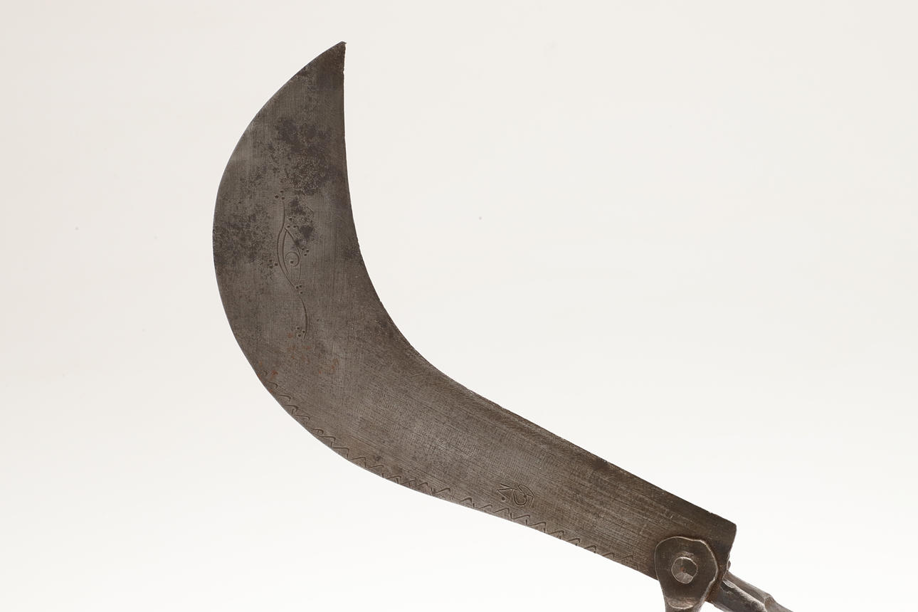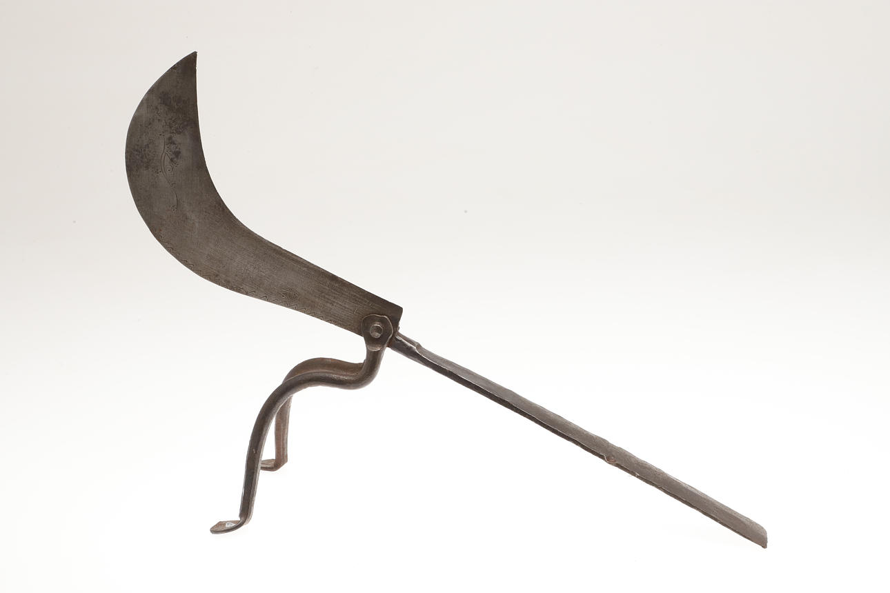 A steel cutting device with a hooked blade with sharpened point engraved with an eye of the Buddha to both sides and possible makers mark, on a splayed support and two short curved legs. 33.5 cm high, 46 cm wide.