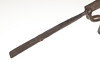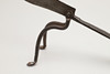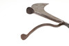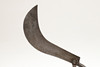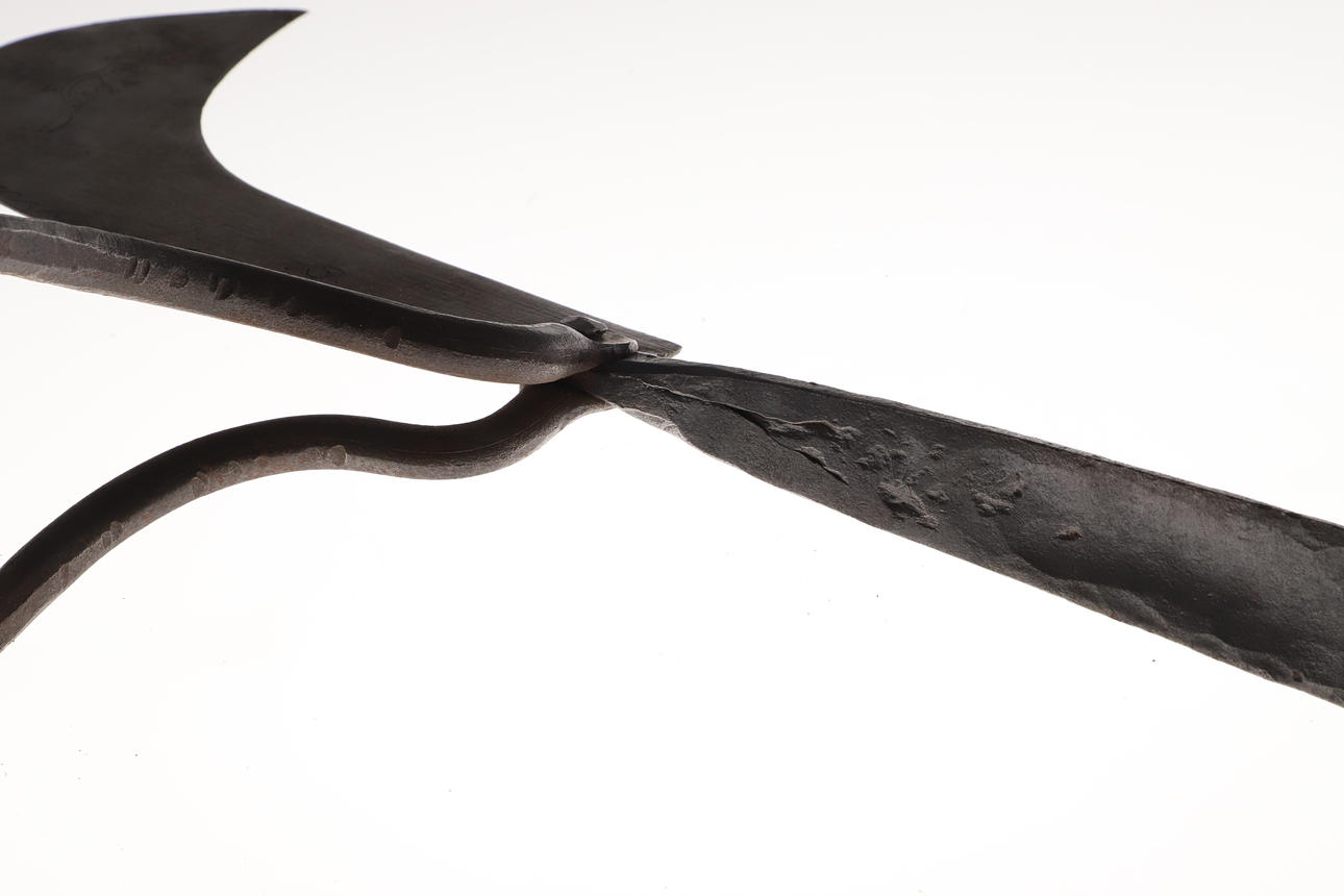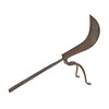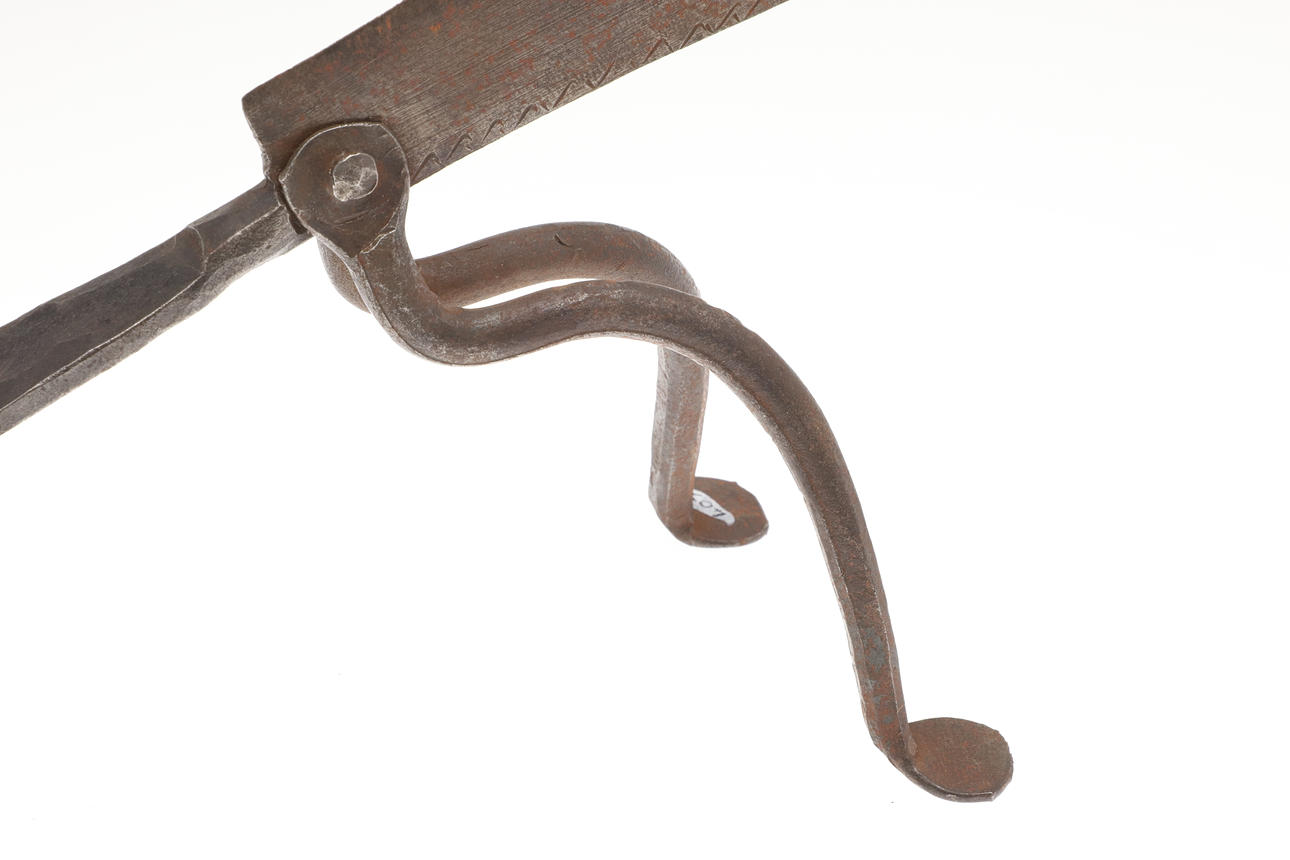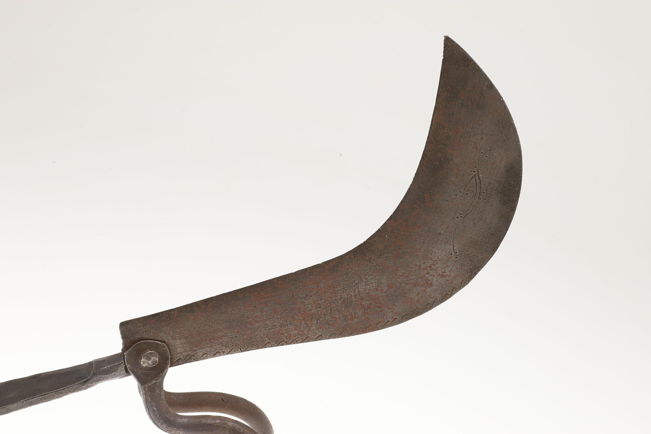 A steel cutting device with a hooked blade with sharpened point engraved with an eye of the Buddha to both sides and possible makers mark, on a splayed support and two short curved legs. 33.5 cm high, 46 cm wide.