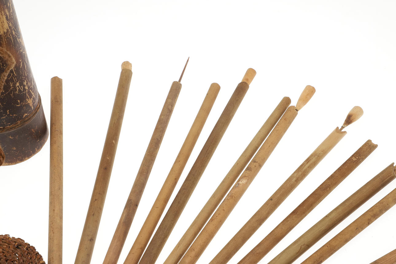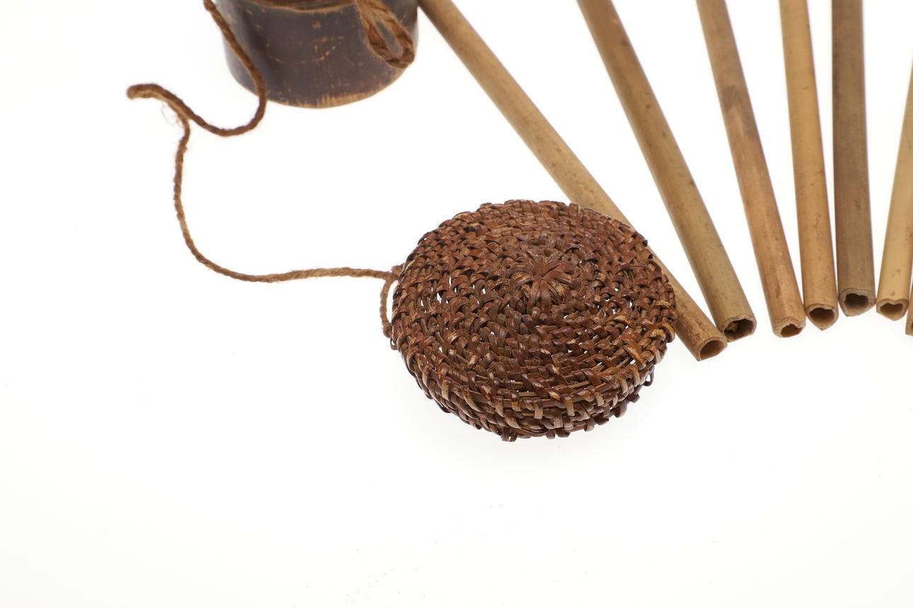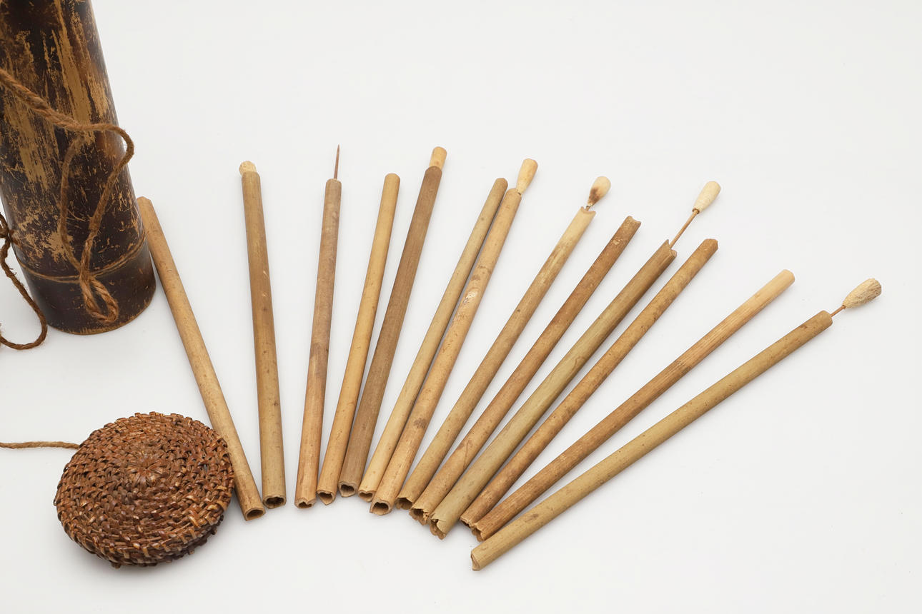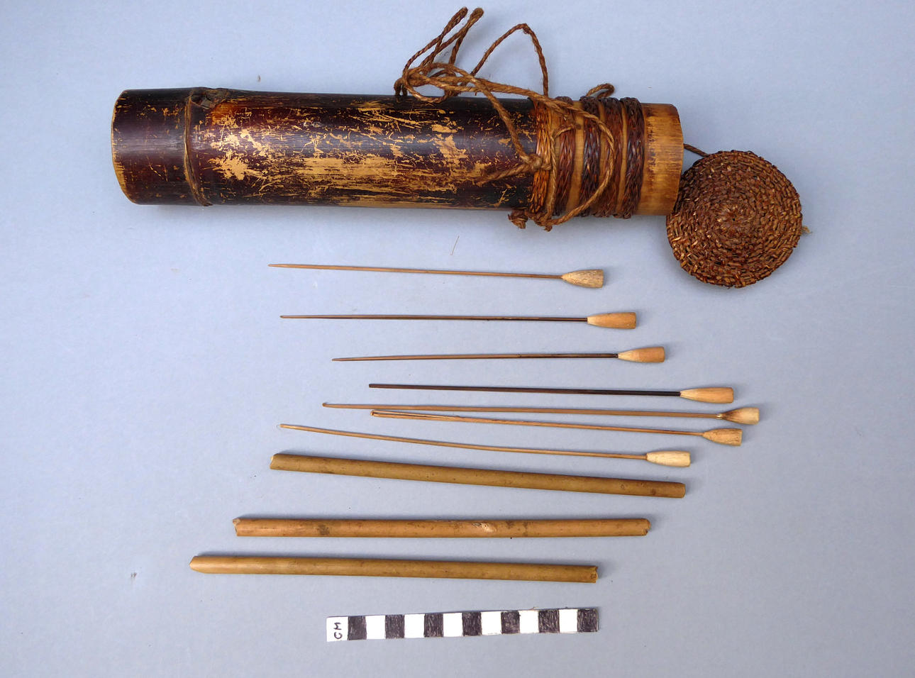A bamboo blowpipe dart container with a cover of woven rattan. Containing seven darts in reed sheaths and six empty sheaths. With woven rattan bindings to the body. 29 cm.