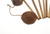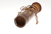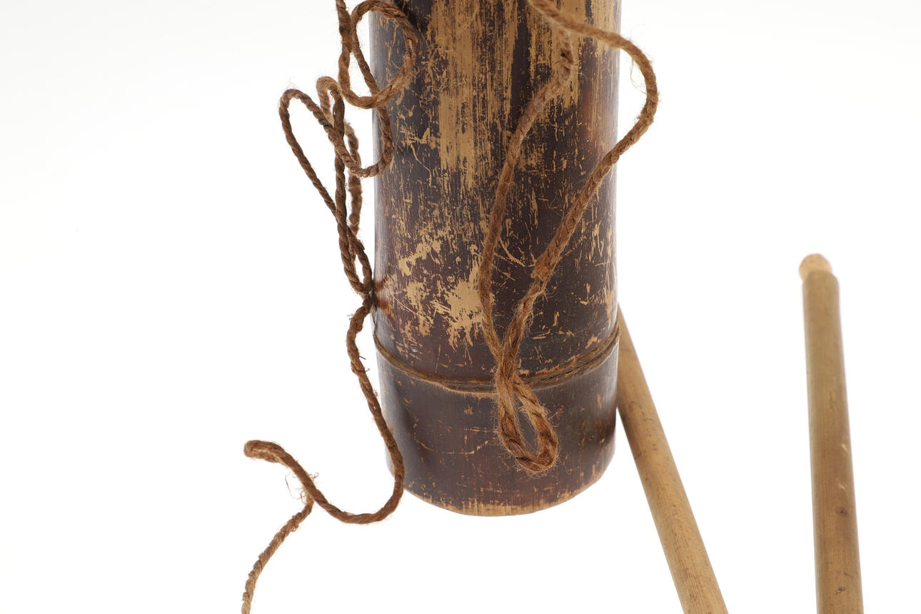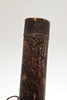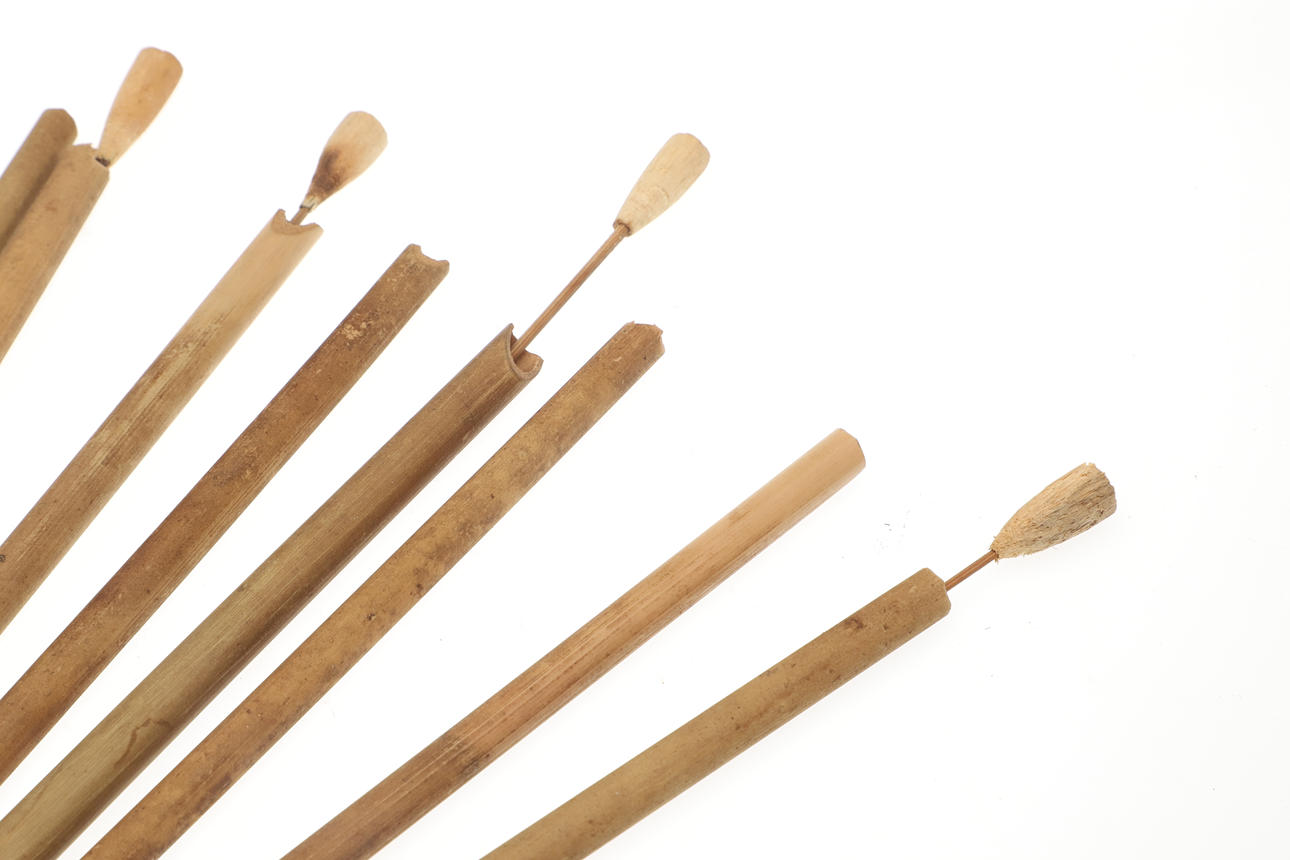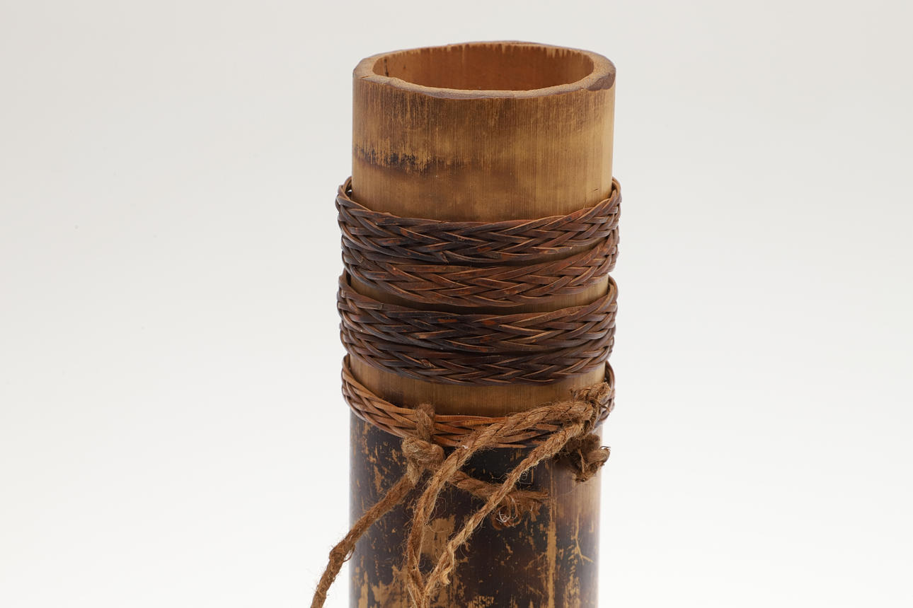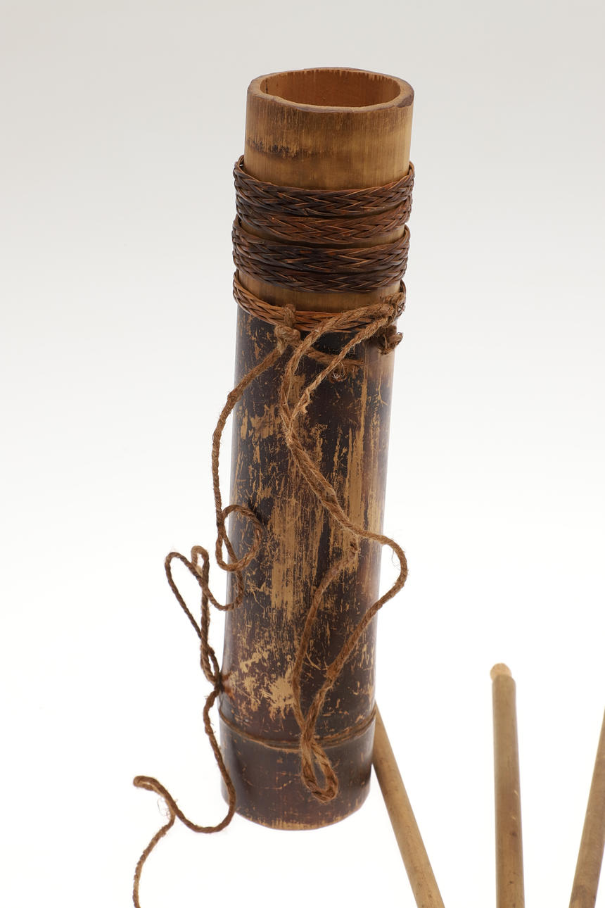 A bamboo blowpipe dart container with a cover of woven rattan. Containing seven darts in reed sheaths and six empty sheaths. With woven rattan bindings to the body. 29 cm.