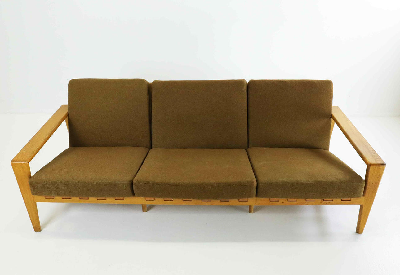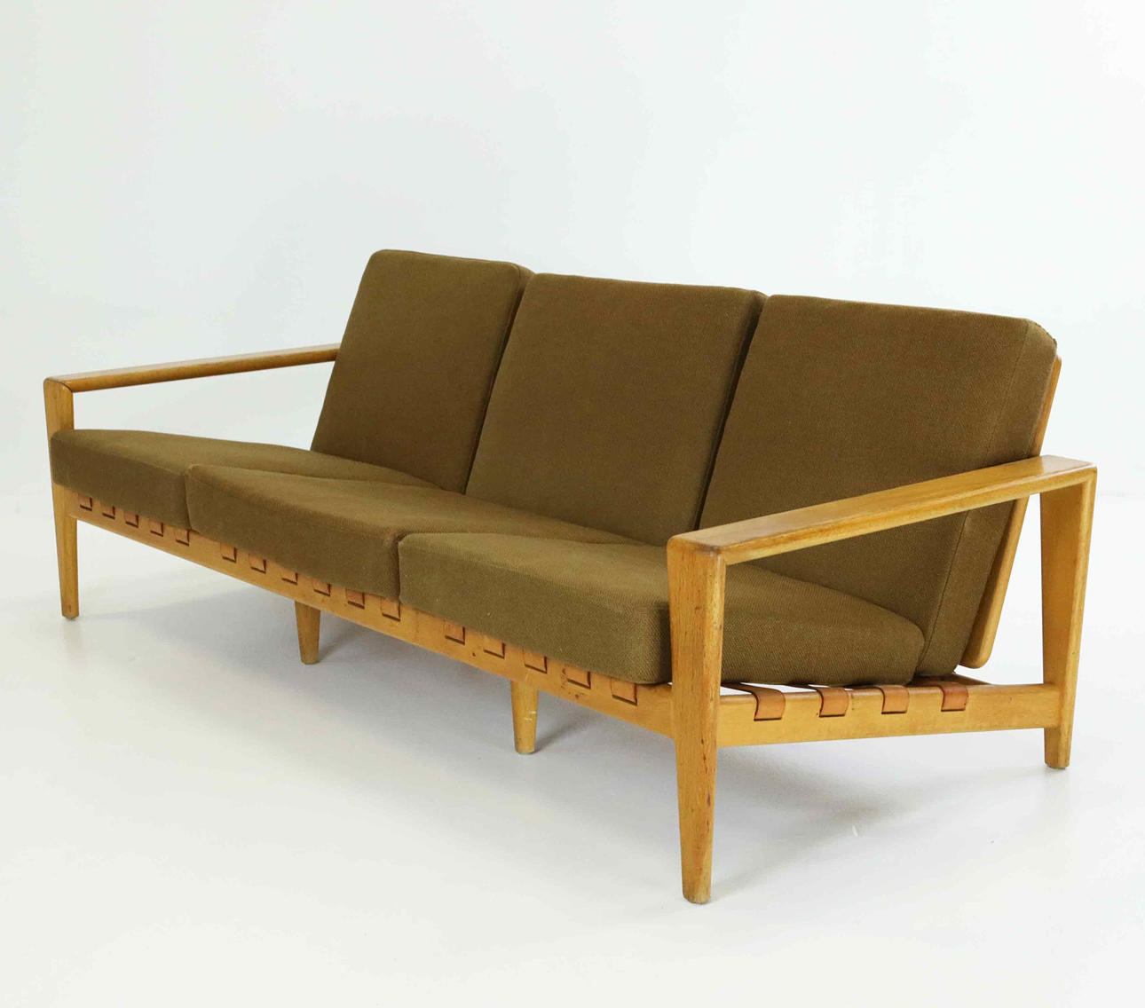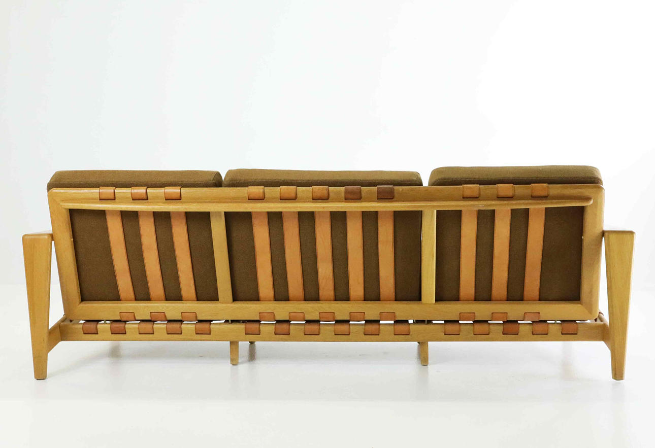 Three-seat sofa with oak frame and leather straps.