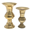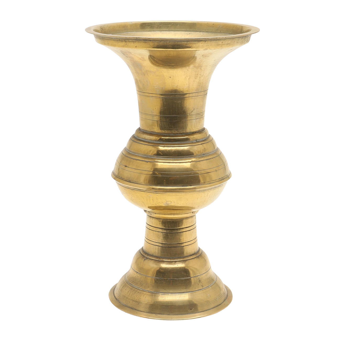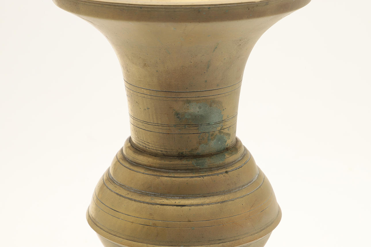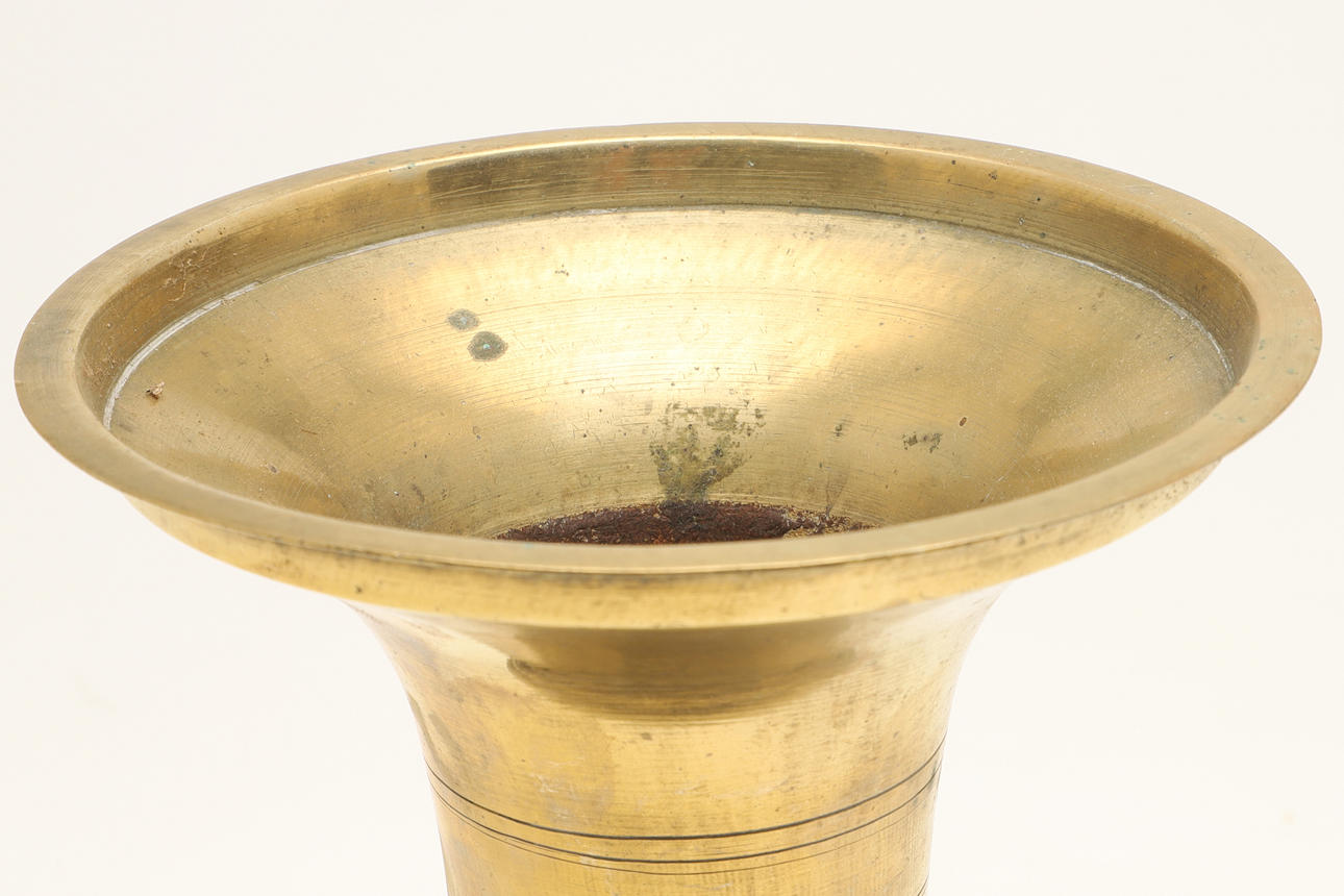 A brass spittoon of tall vase form with flared rim, baluster body and spreading foot. 28 cm high, 17 cm wide. And another similar 23 cm high, 15.5cm wide.