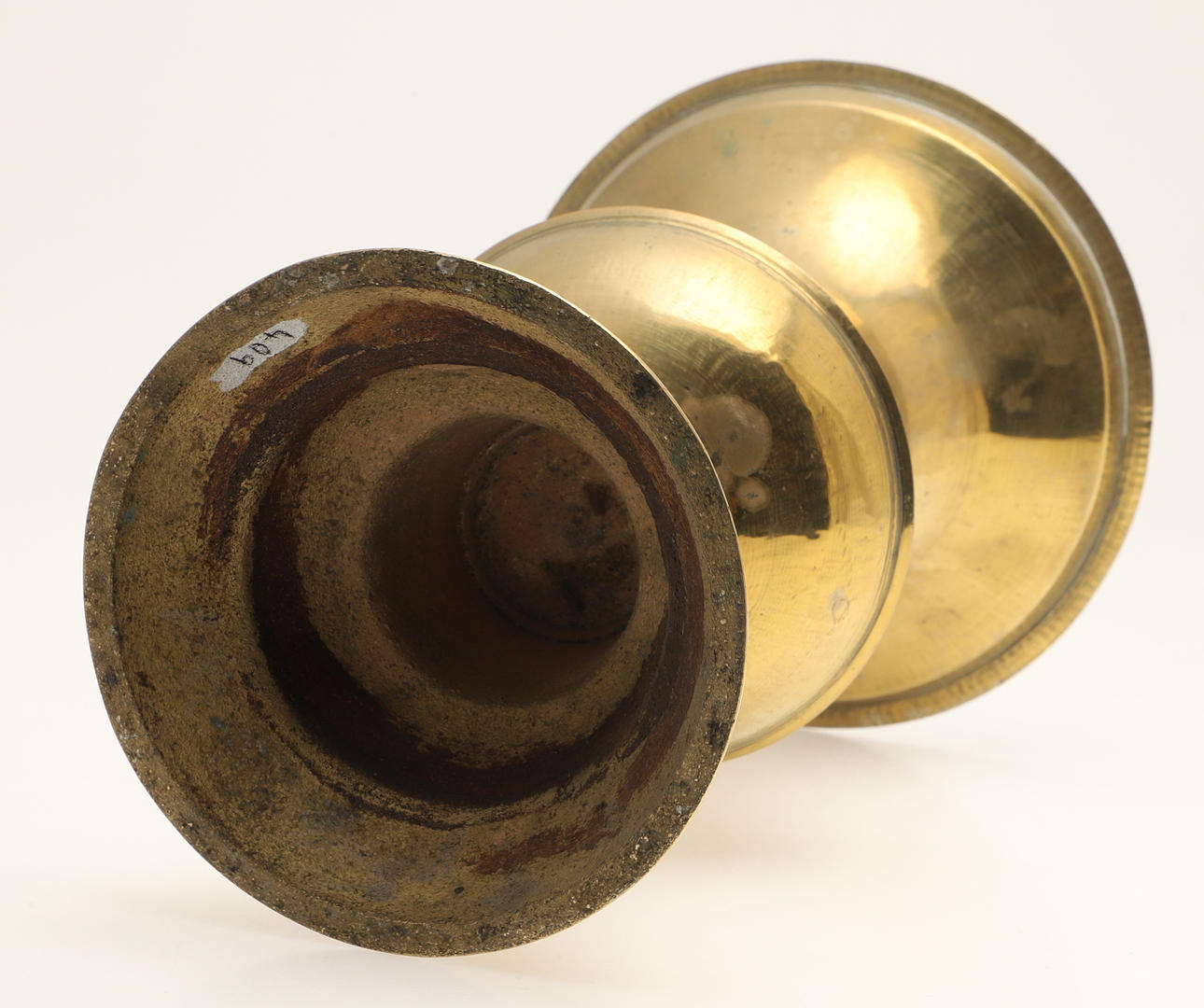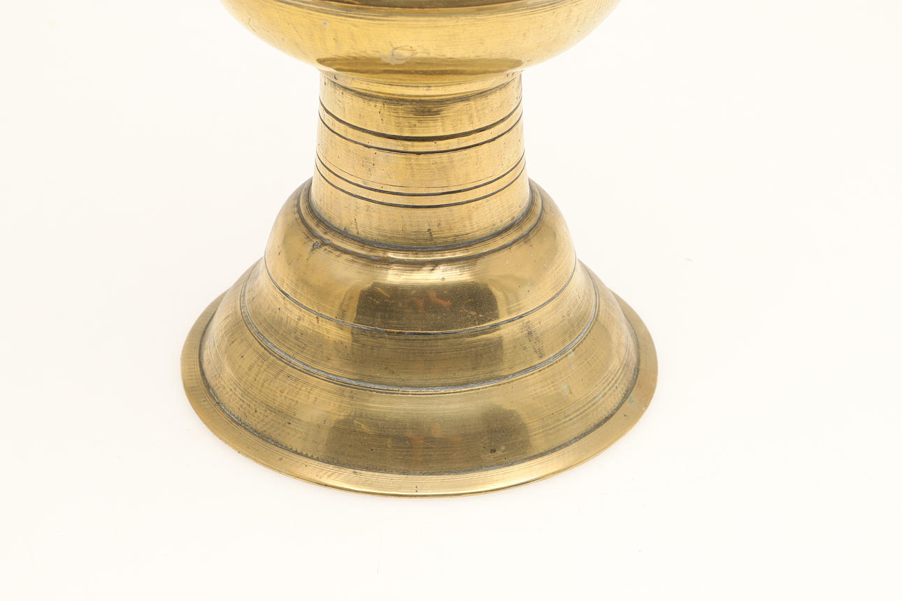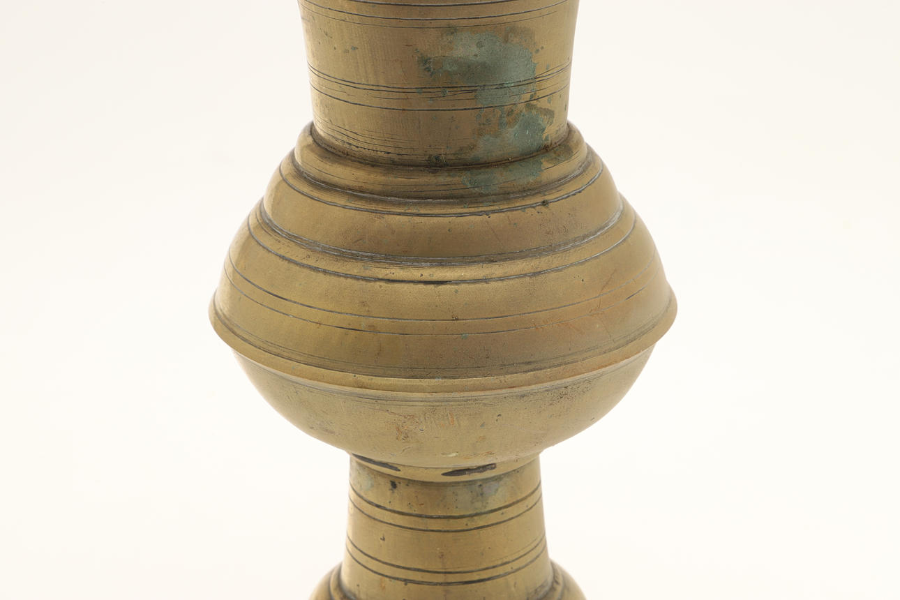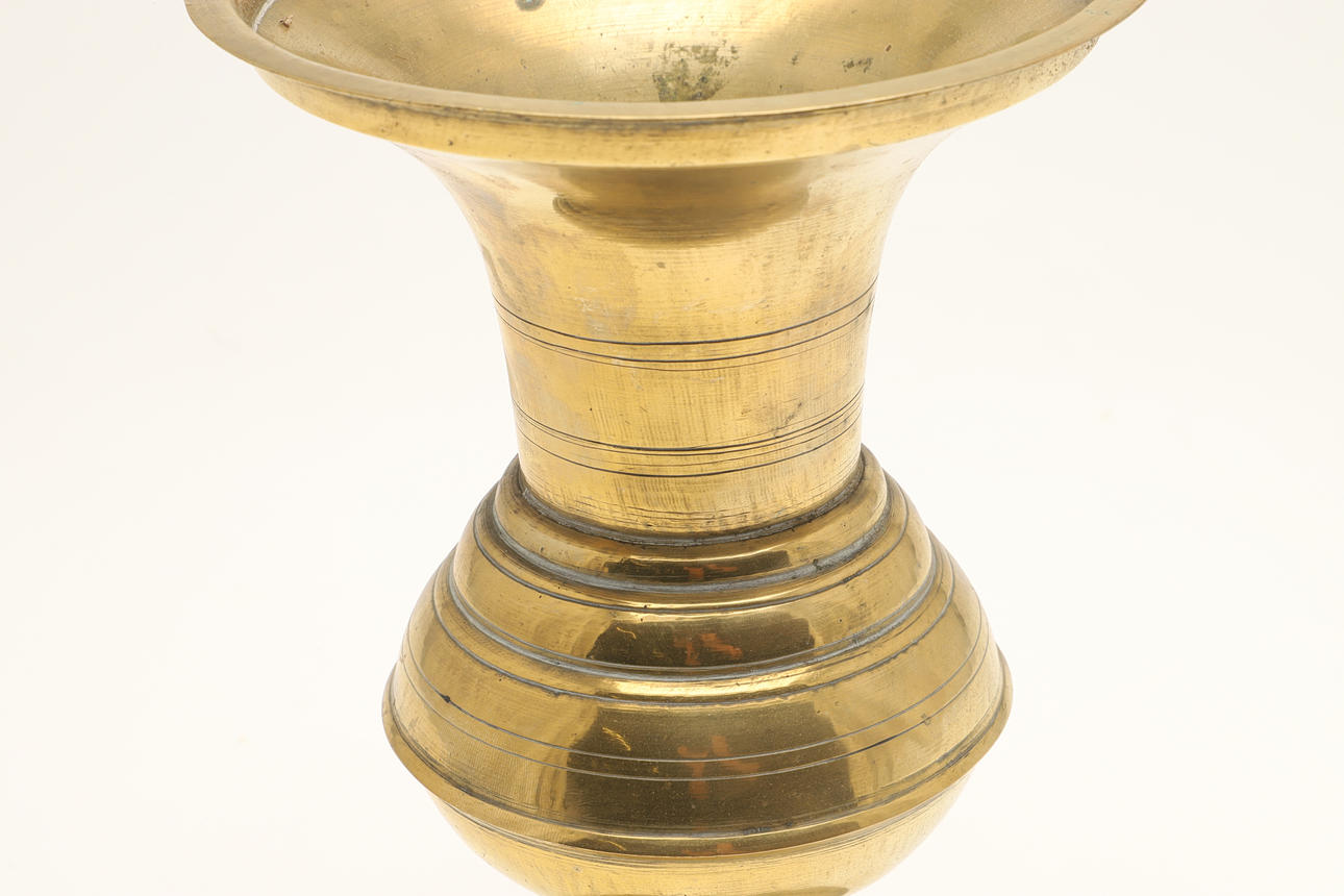 A brass spittoon of tall vase form with flared rim, baluster body and spreading foot. 28 cm high, 17 cm wide. And another similar 23 cm high, 15.5cm wide.