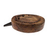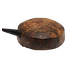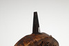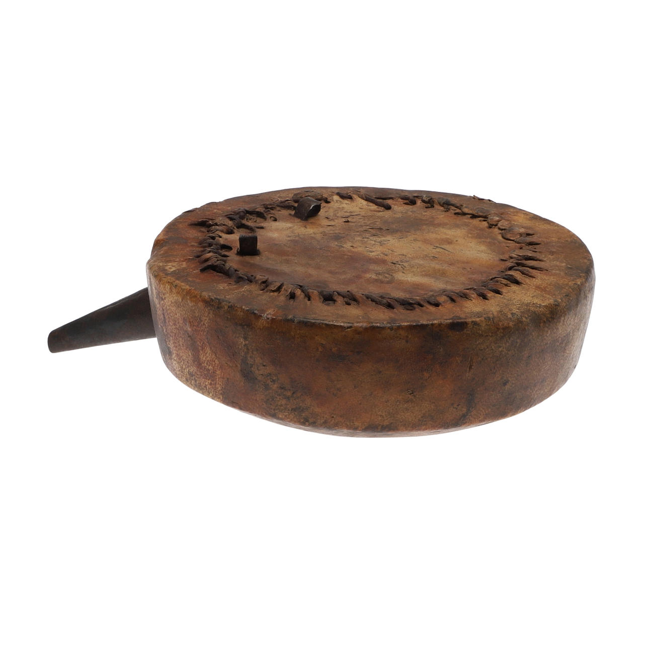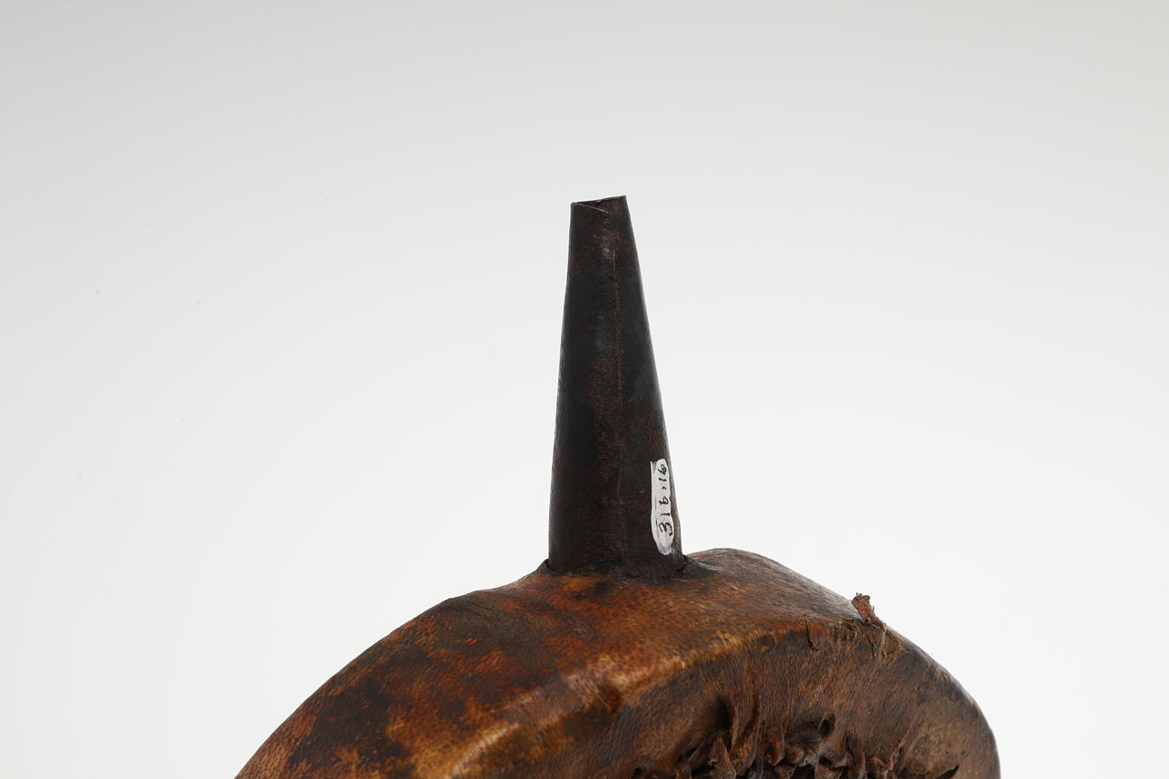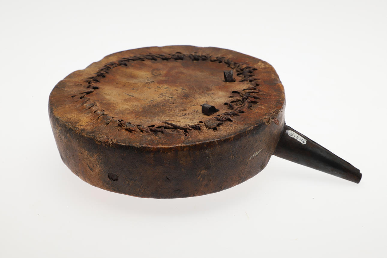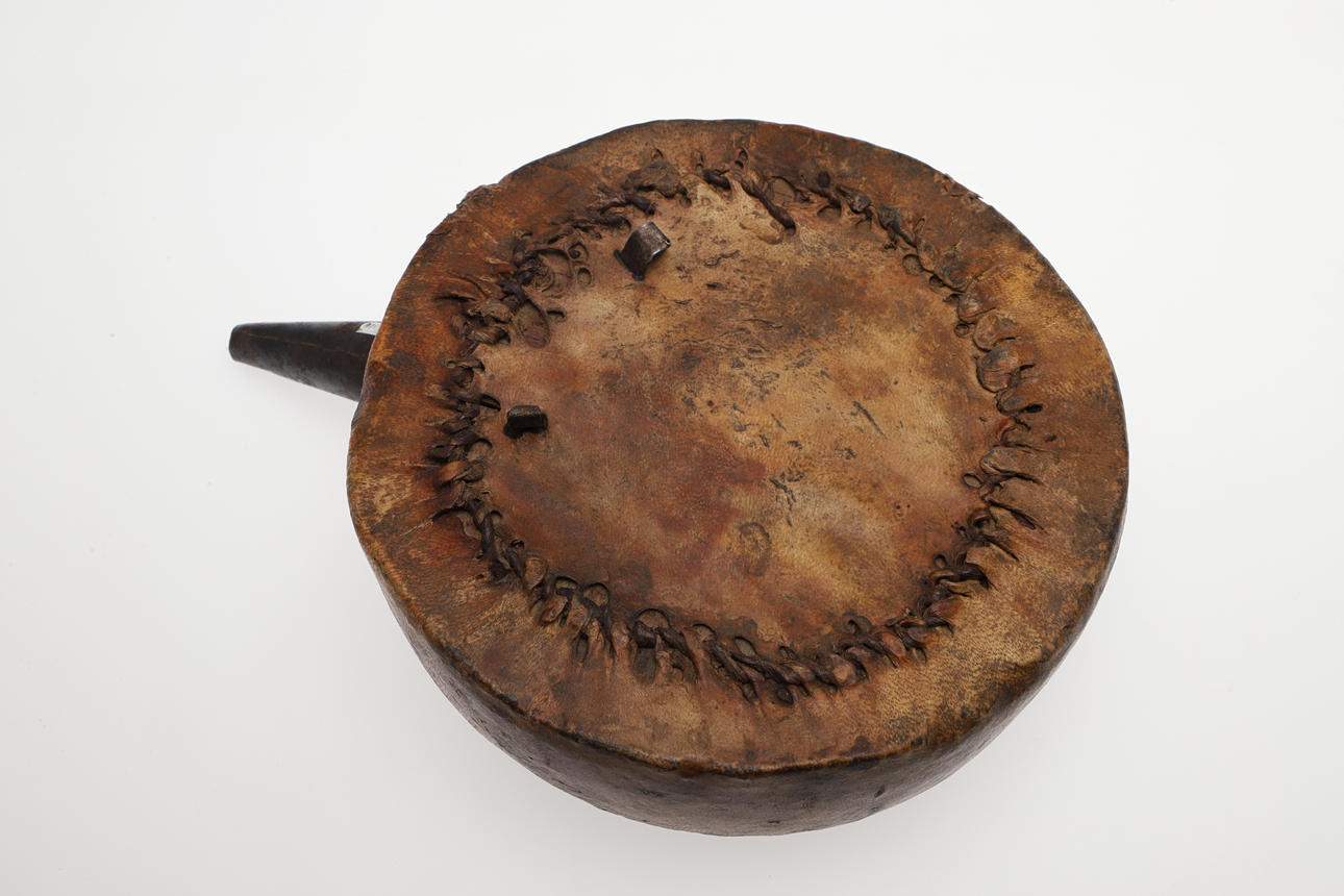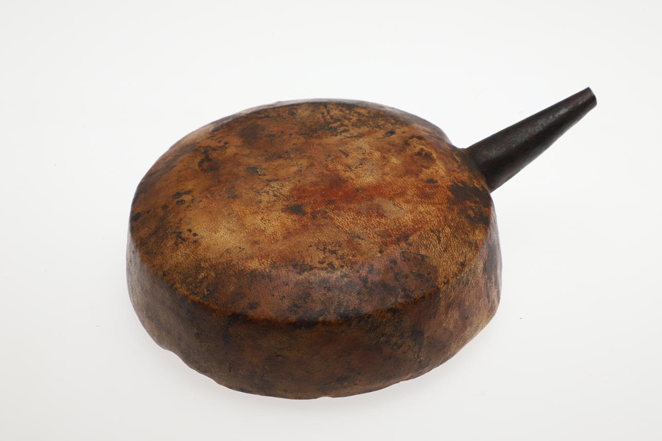 A powder flask with a wooden carcass covered in parchment like skin with 6 cm iron spout. 17 cm wide.