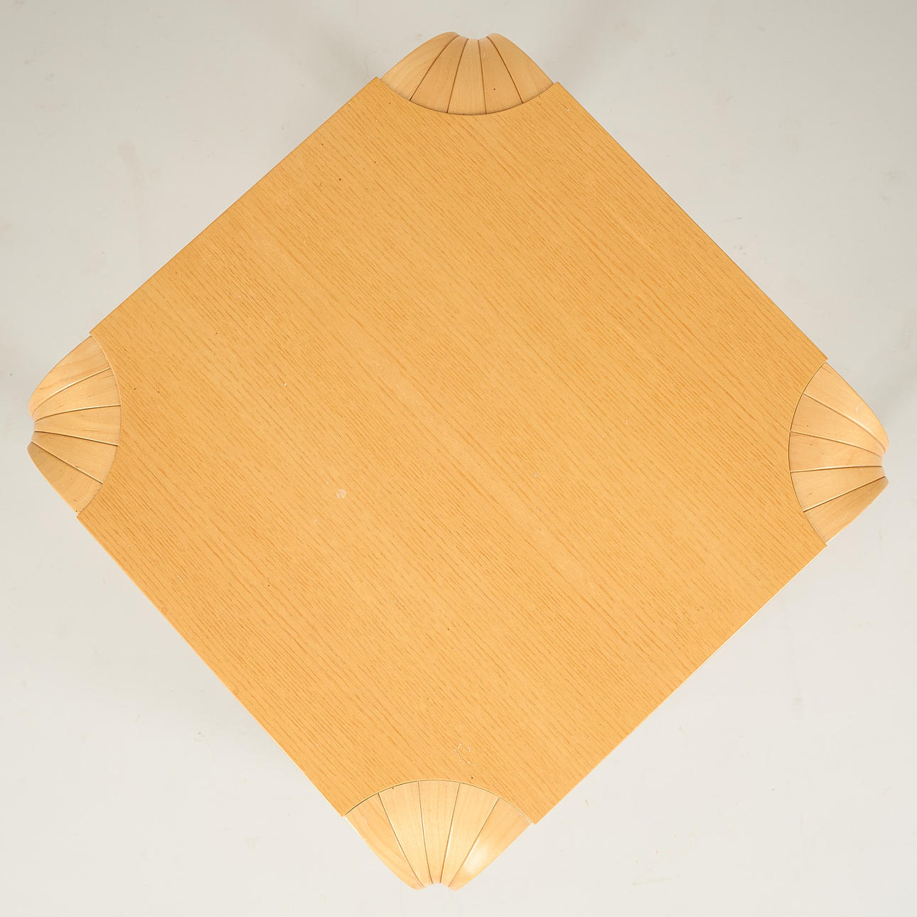 Table top lacquered ash, fan-shaped legs in lacquered birch, 70 x 70 cm, height 56 cm. Manufacturer's label.