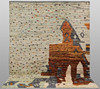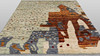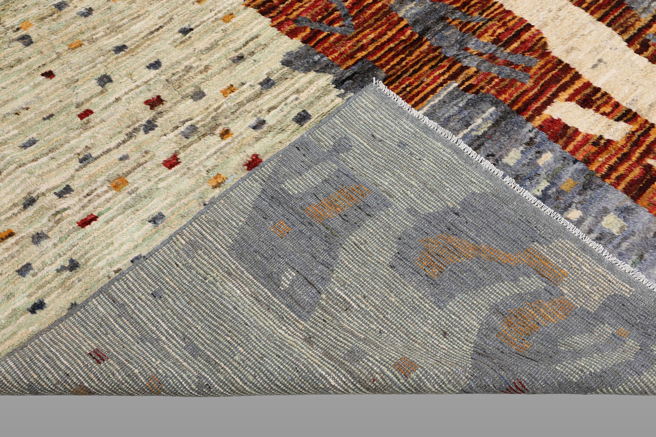 Morocco design with light base color and small geometric elements in muted red, yellow and gray tones scattered over the surface. The carpet has a larger abstract motif in orange, gray and brown. The forelock is made of wool and the warp is of cotton.