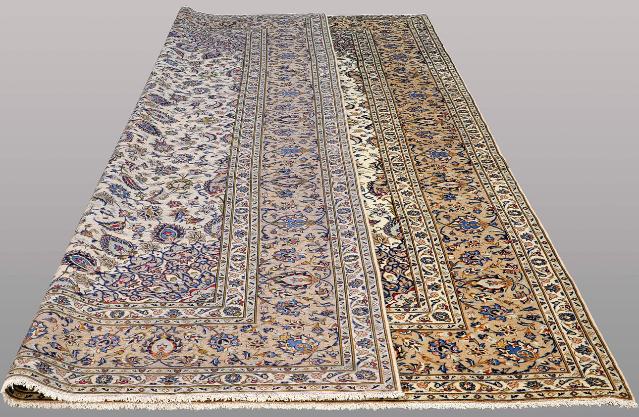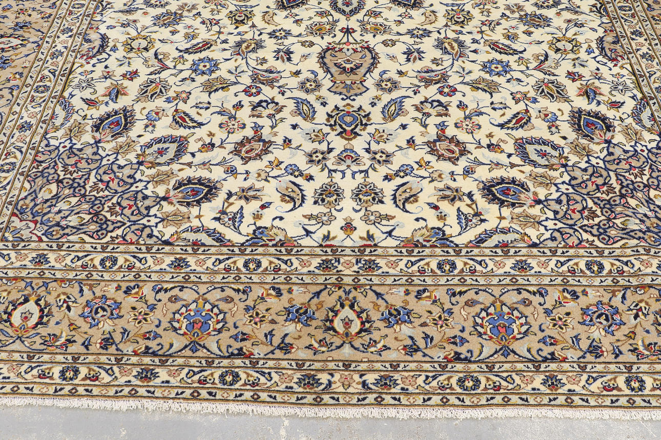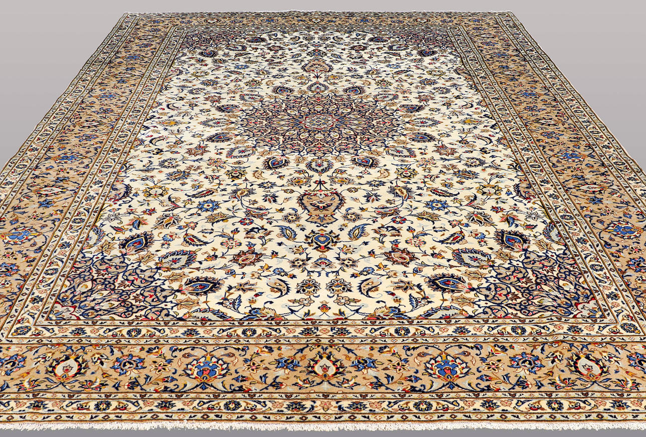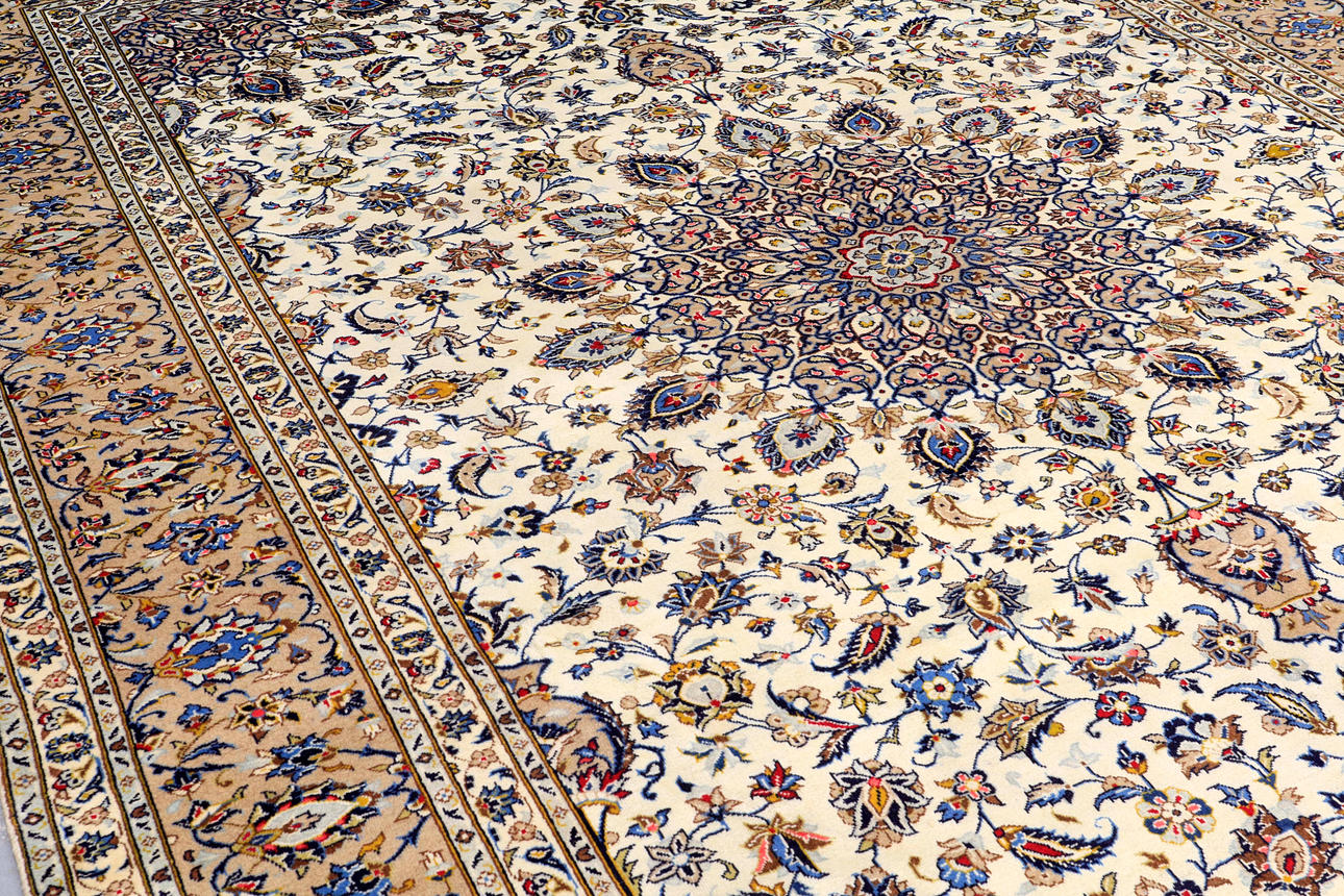 Sealed Keshan with light bottom color and a detailed medallion in dark blue, red and beige tones. The center field is decorated with stylized plant decor, palmettes and arabesques, and is framed by a wide border with similar motifs. The forelock is made of wool and the warp is of cotton.