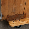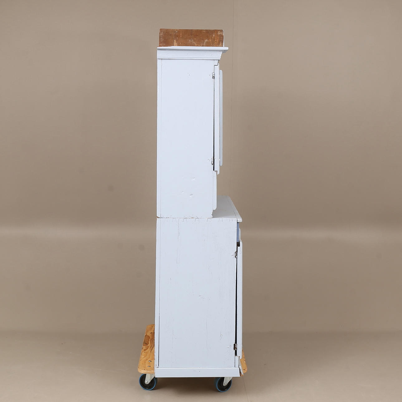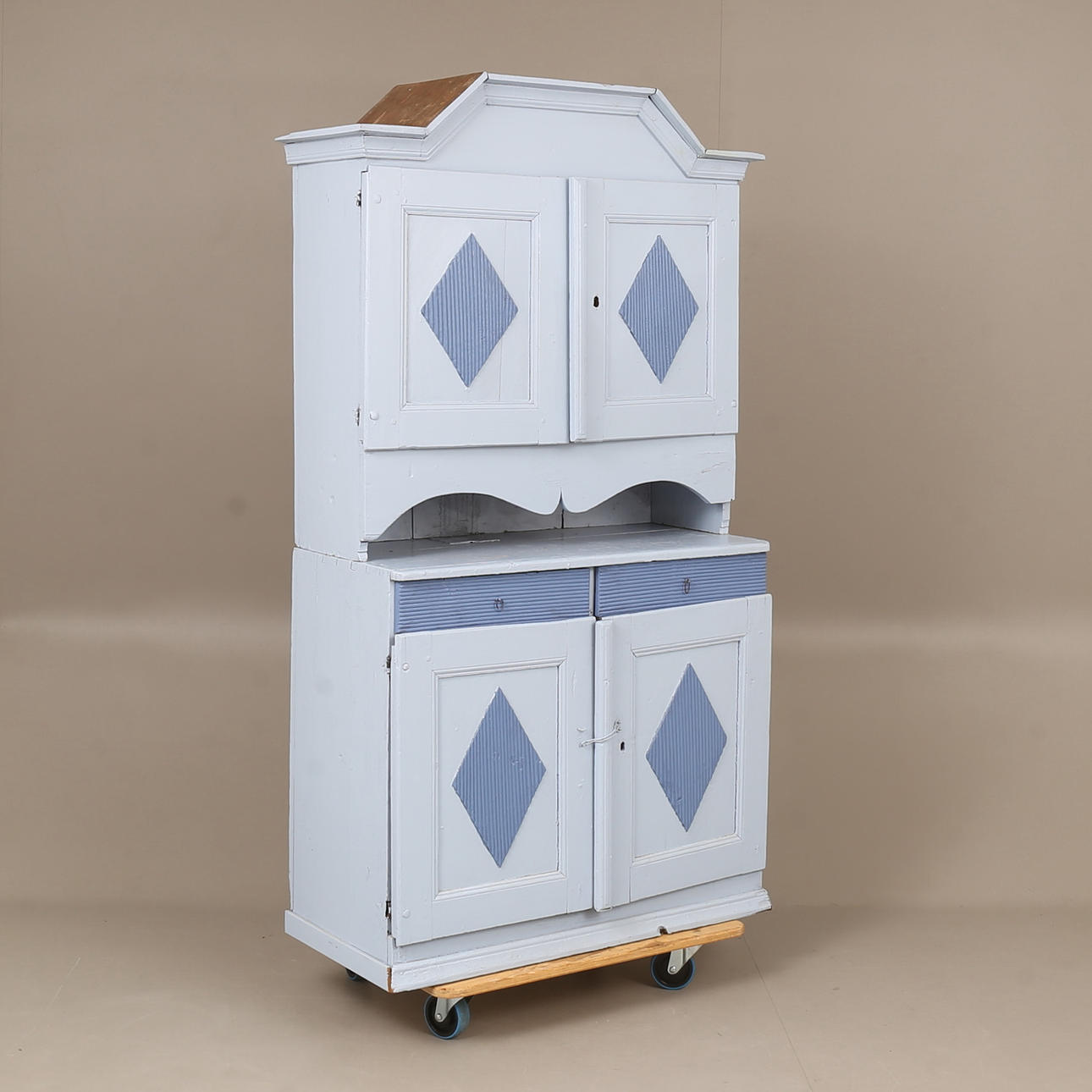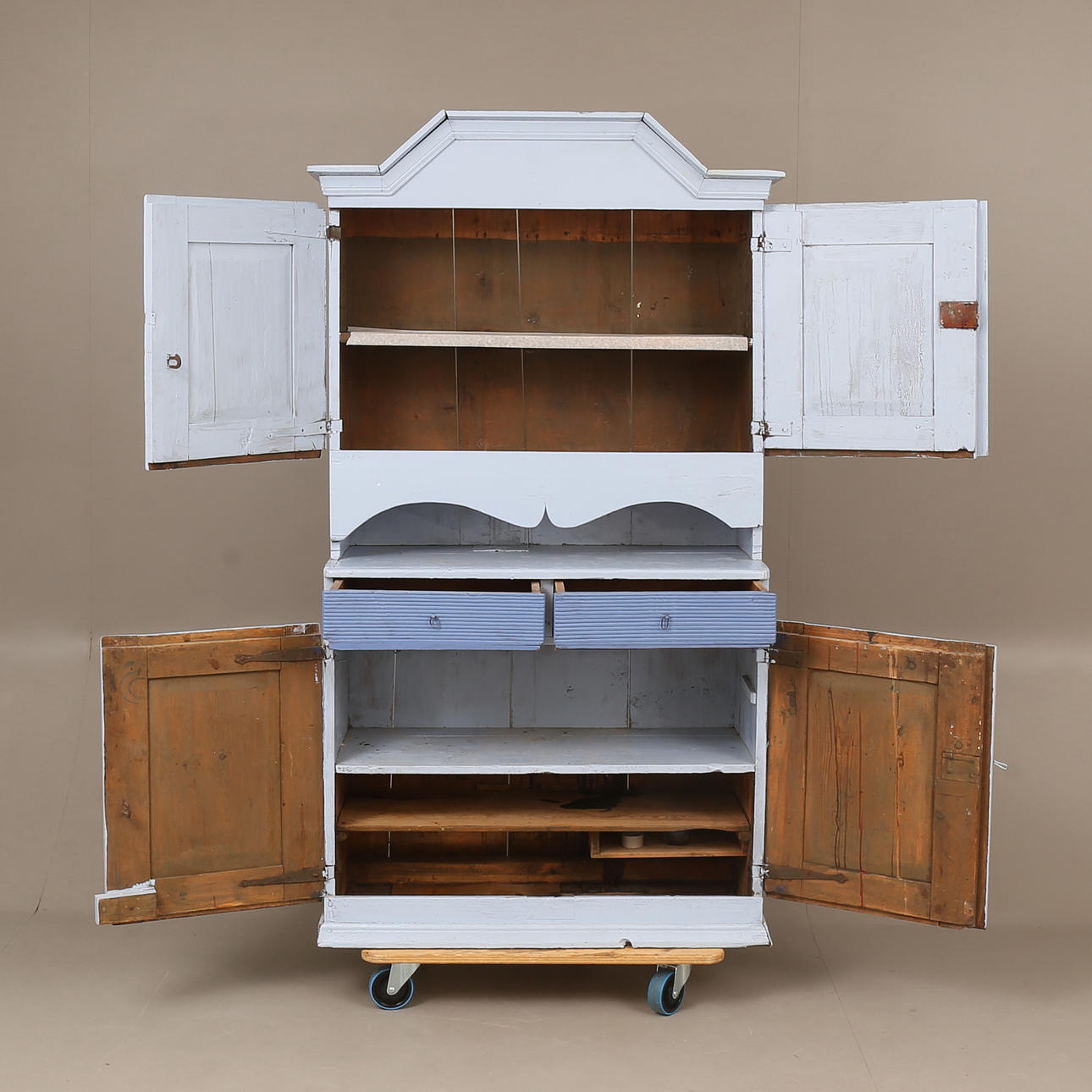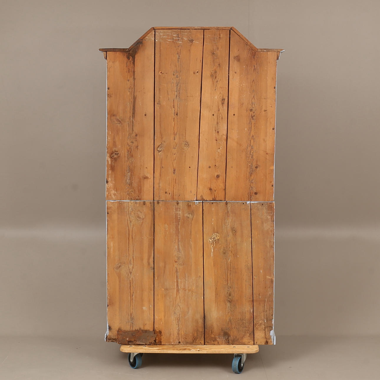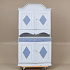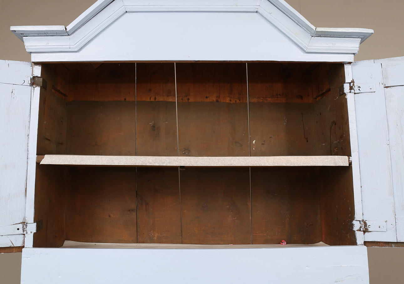 Heavy use wear. Damage, later painting. Renovated and completed. Shelf is missing at the top.