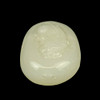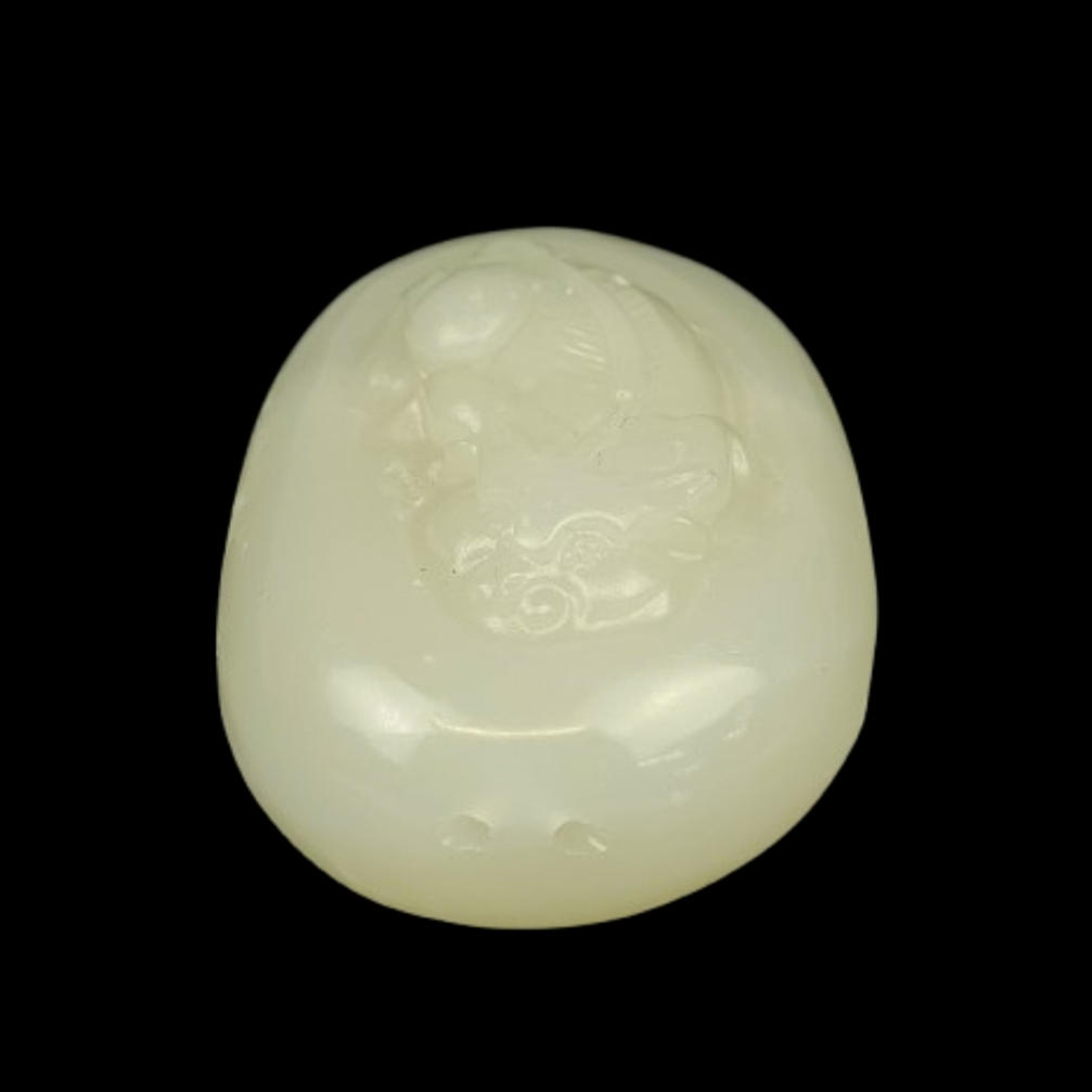 A Chinese carved mutton fat jade / hardstone pebble featuring a mythical animal. Two small holes drilled at the top for hanging as an amulet. 7.5 x 4.5 x 4 cms.