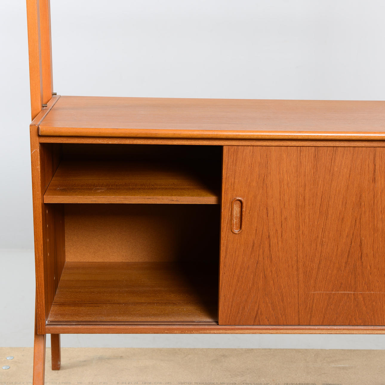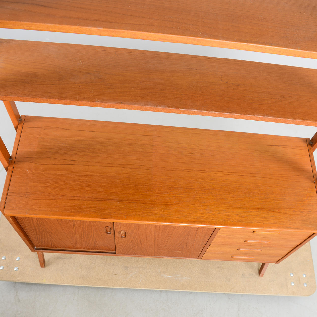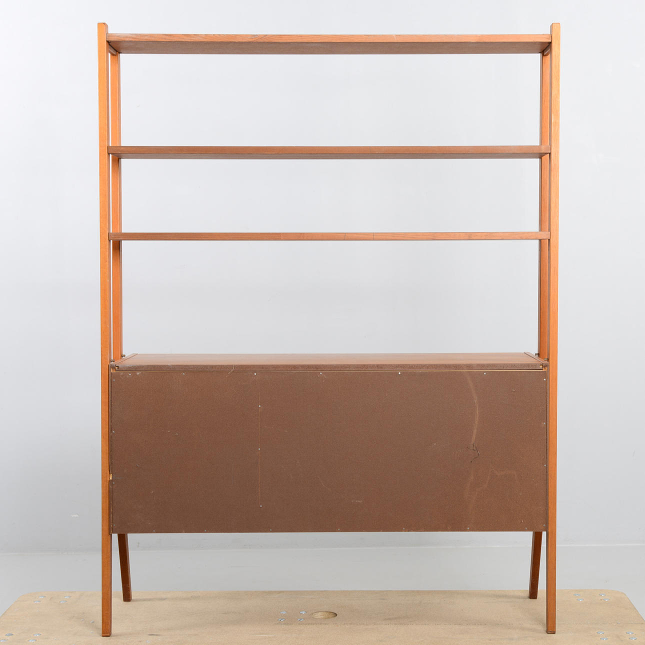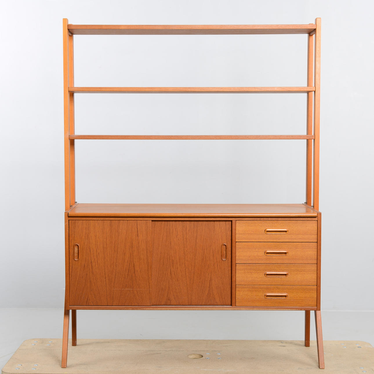 Veneered with teak. Three shelves. Two sliding doors with rear shelves. Four pull-out drawers. Retractable writing disc. Length 119 cm. Depth 44 cm. Height 160 cm.