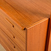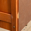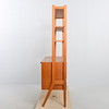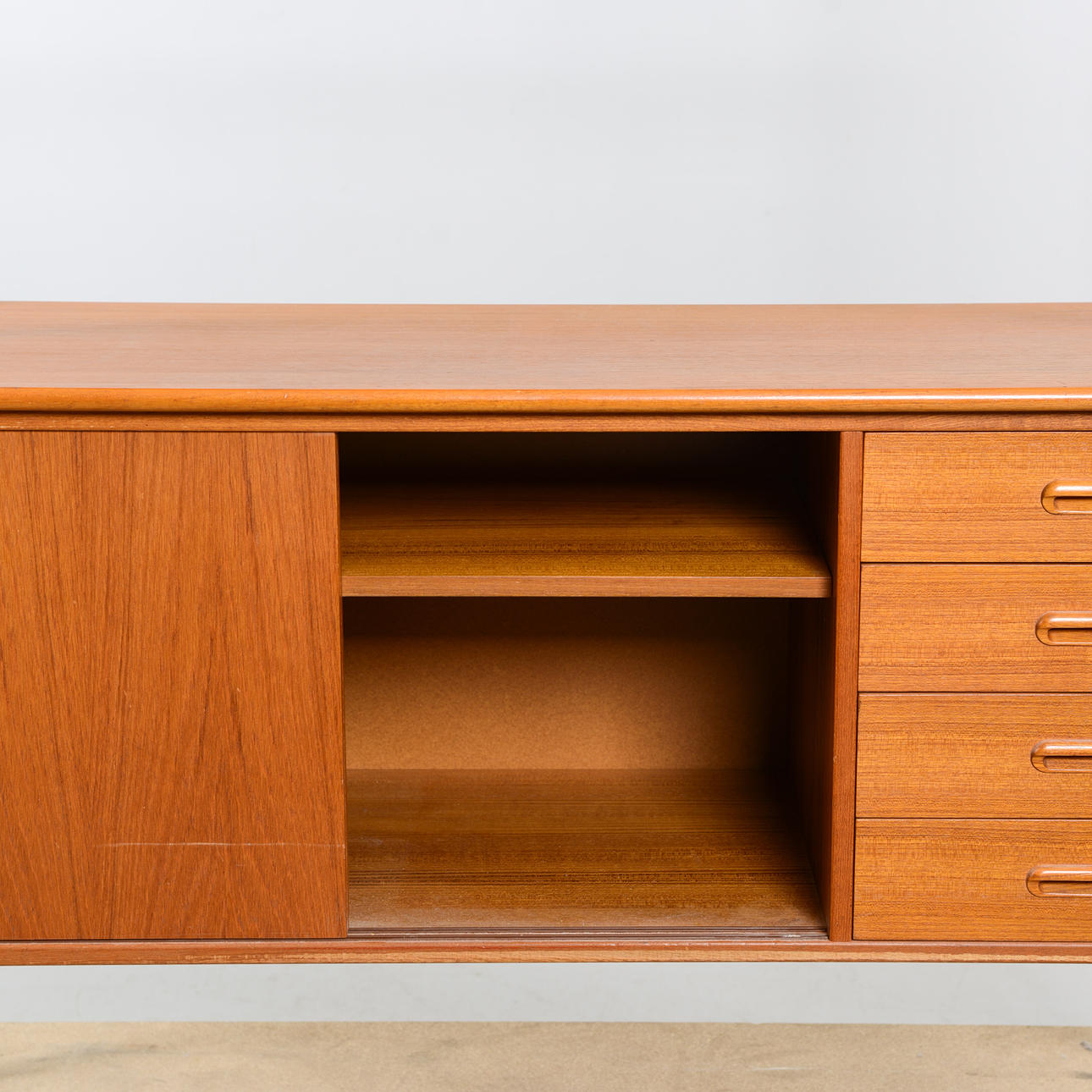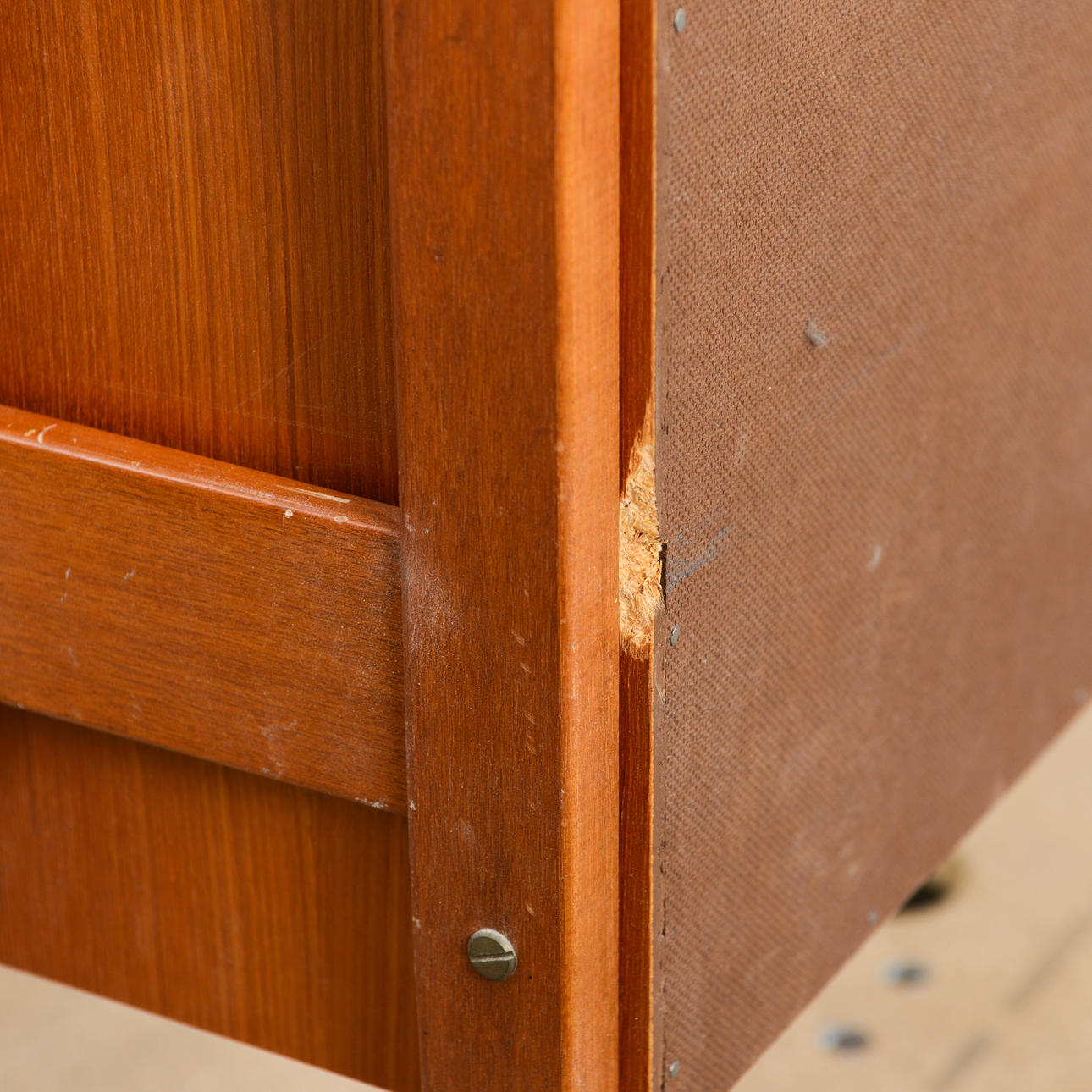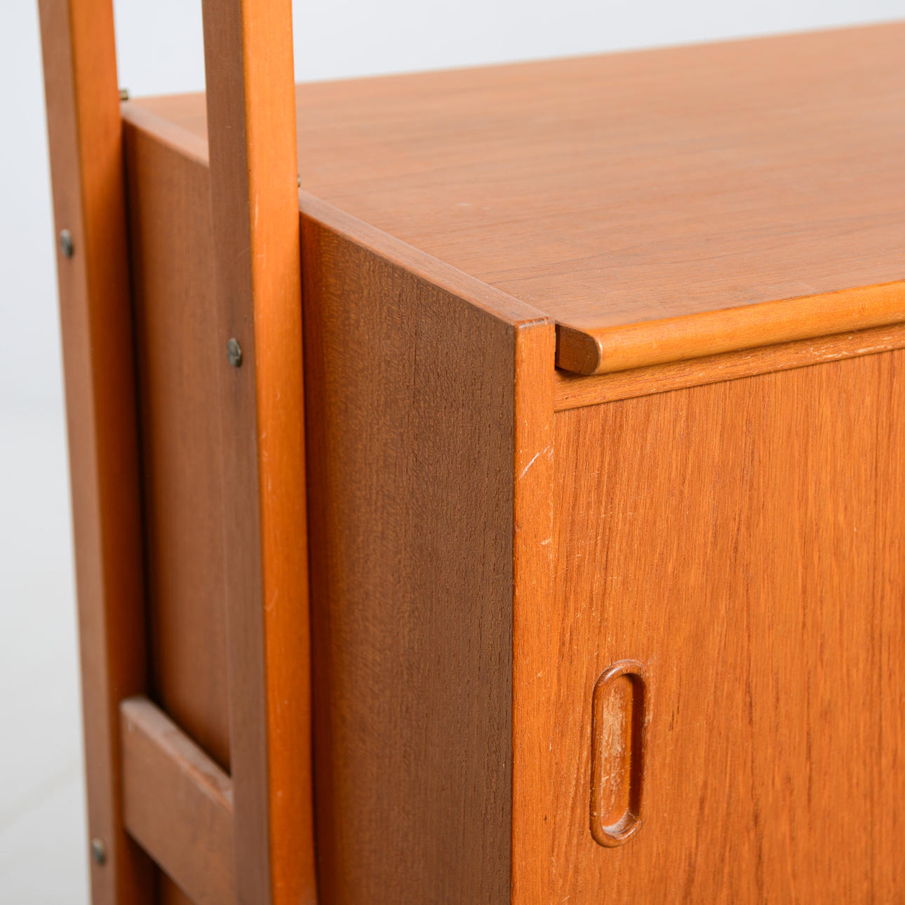 Veneered with teak. Three shelves. Two sliding doors with rear shelves. Four pull-out drawers. Retractable writing disc. Length 119 cm. Depth 44 cm. Height 160 cm.