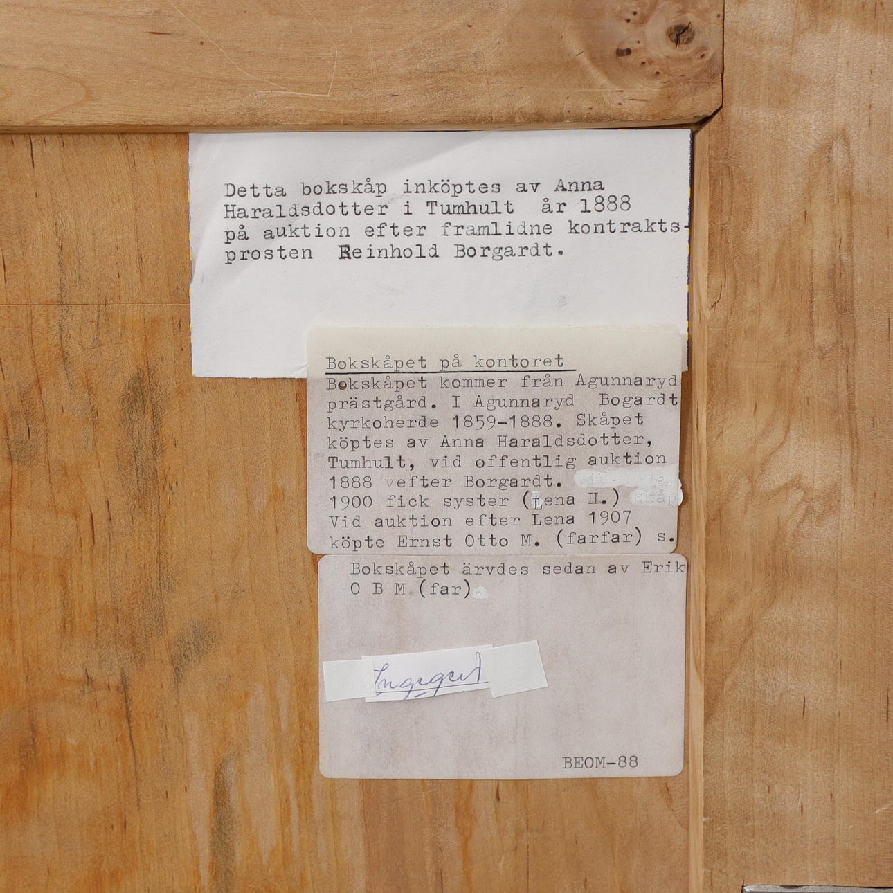 Marked with notes inside: This bookcase was bought by Anna Haraldsdotter in Tumhult in 1888 at auction after the late contract writer Reinhold Borgardt.