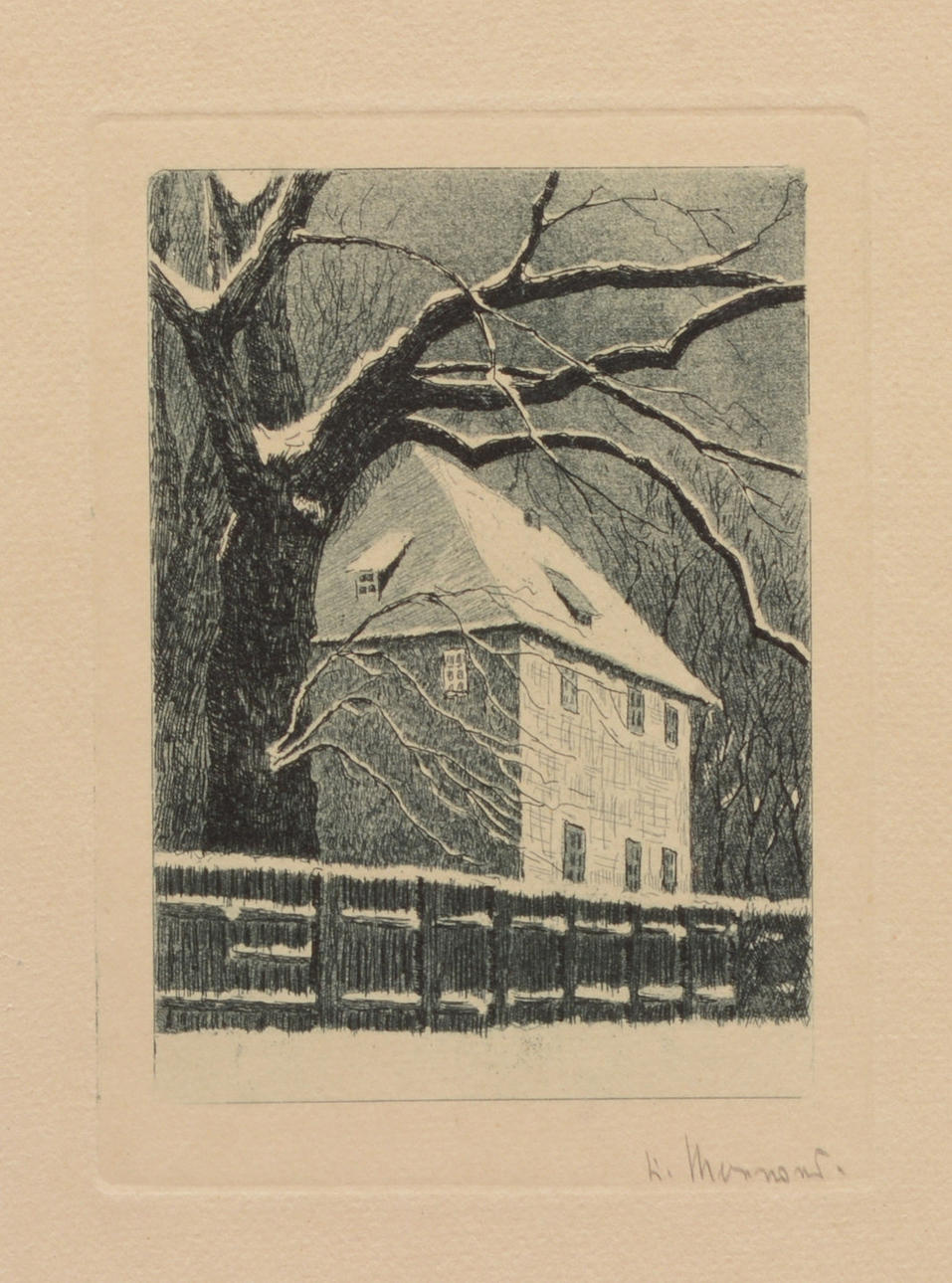OIDENTIFIERAD KONSTNÄR. House in winter. etching.