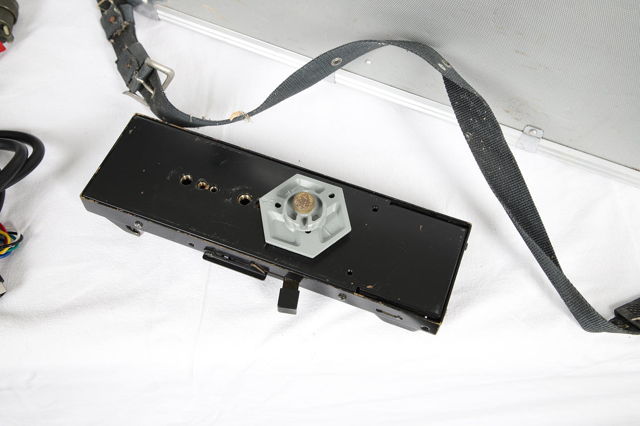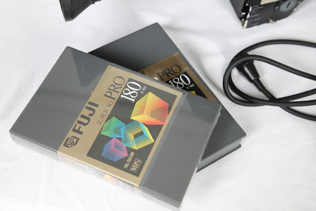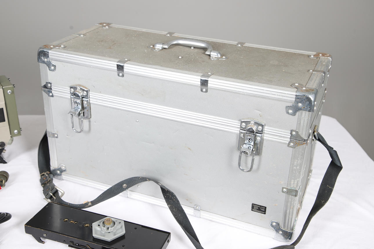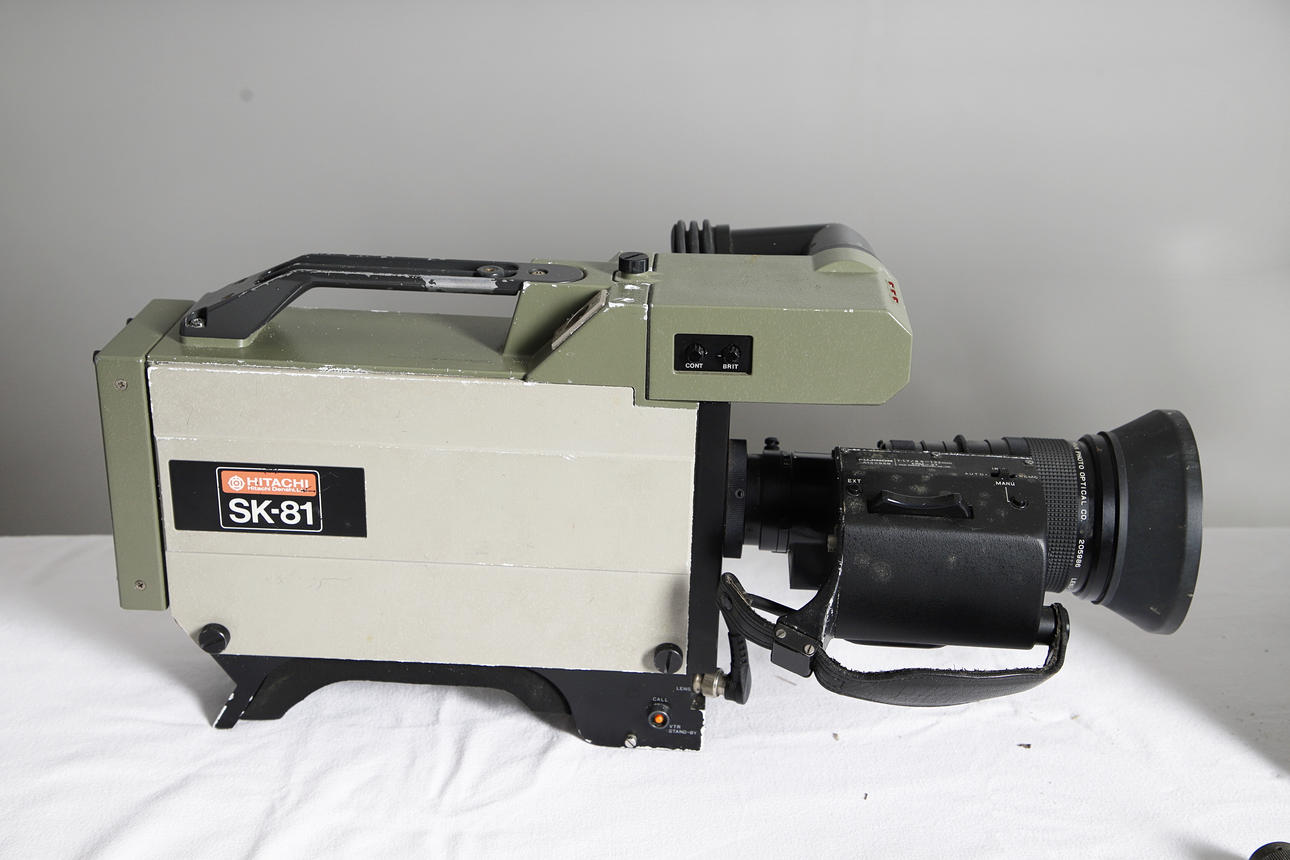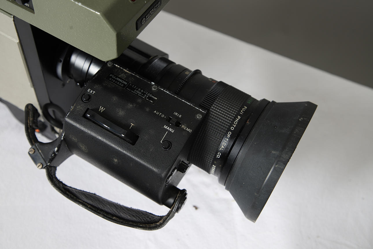 A vintage Hitachi SK-81 television camera, with a Fujinon TV lens (1.7/9.5-133), in a fitted case with accessories. Case 62cms across, 36cms high.