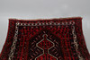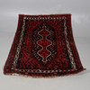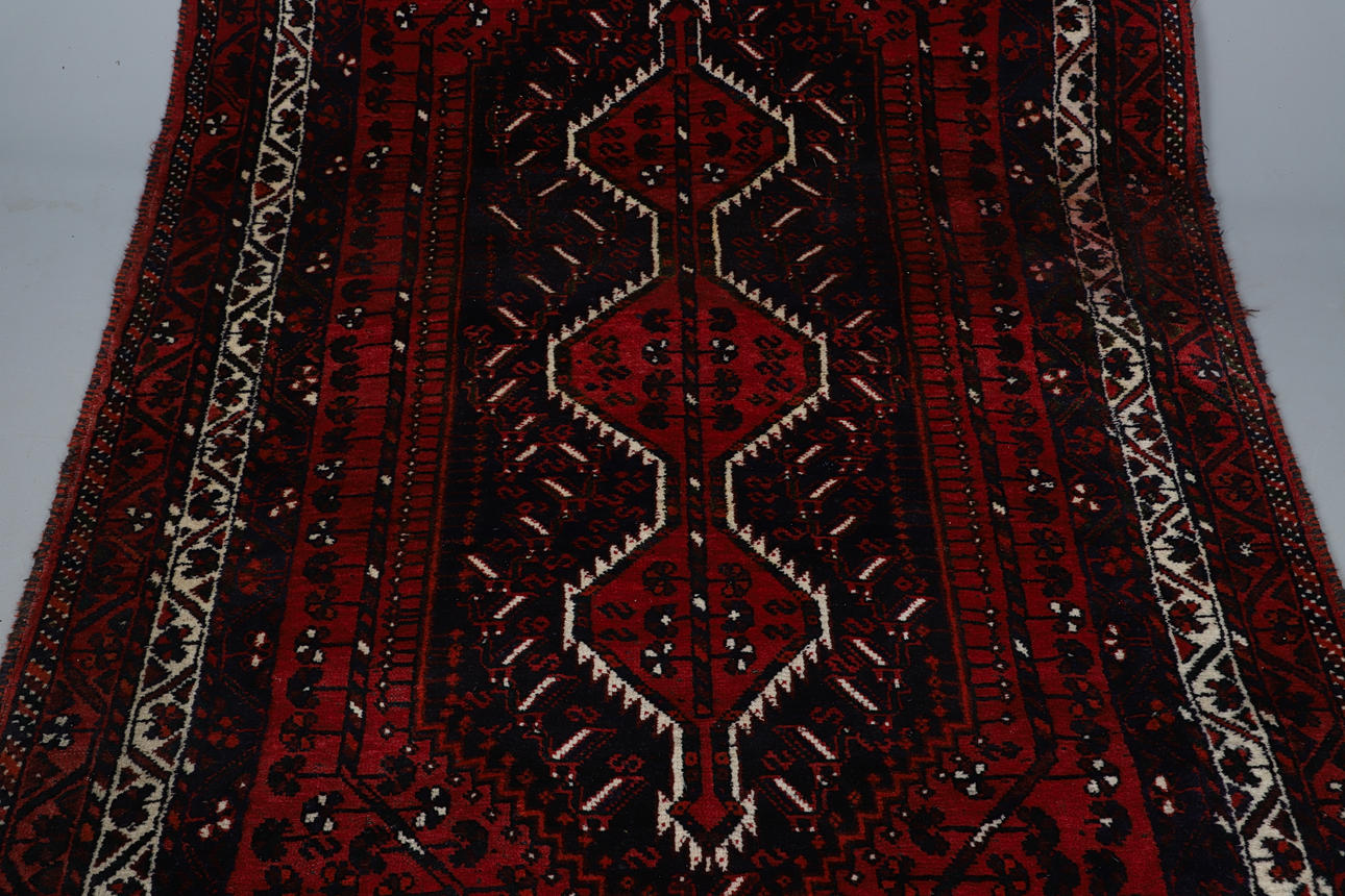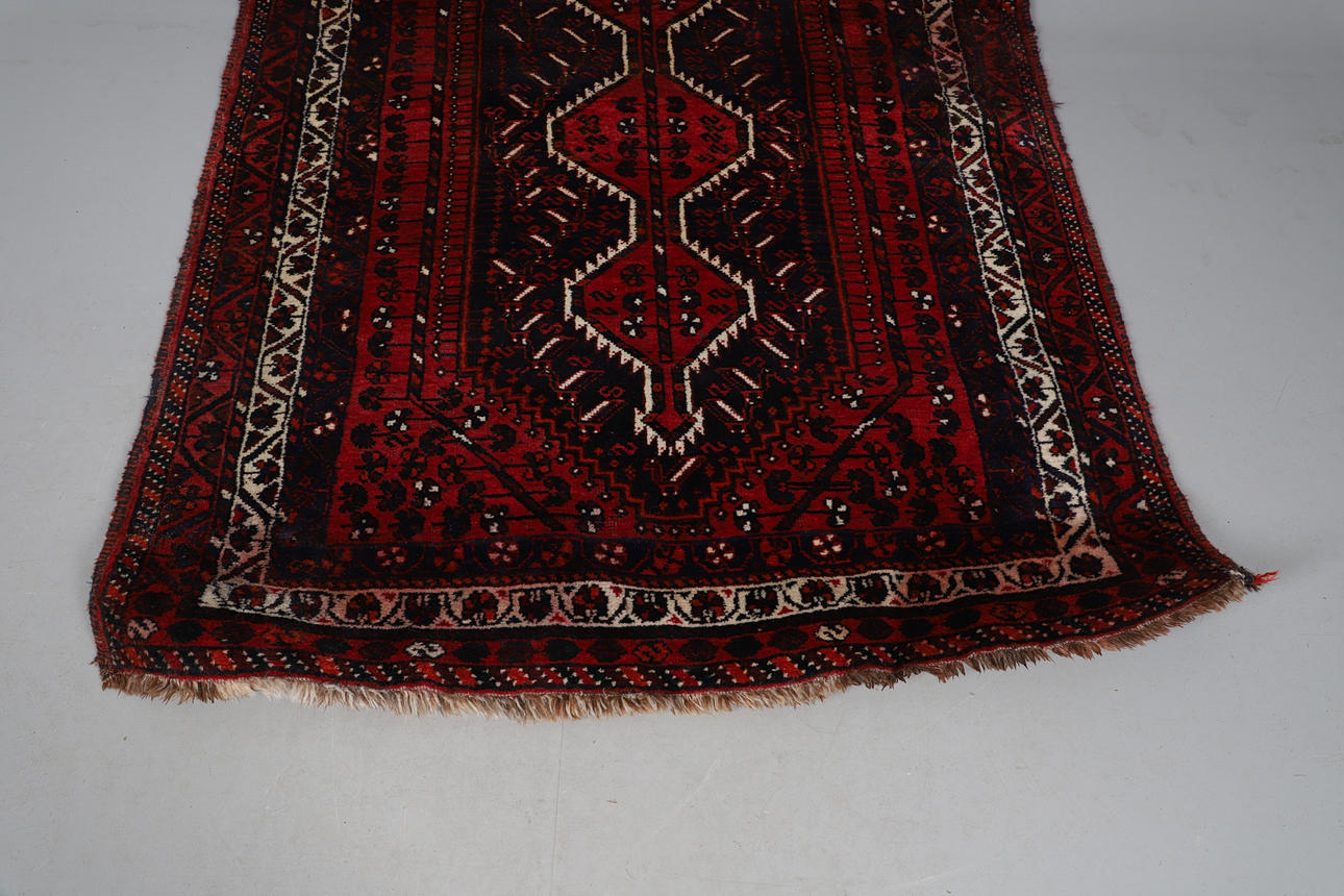 The brick red field with an indigo lozenge containing three linked stepped medallions framed by ivory borders of carnations and vines, 192 x 150cm.
