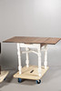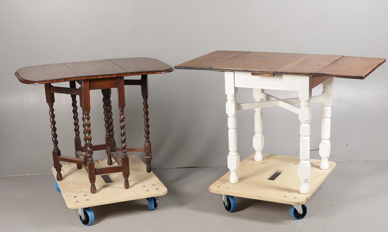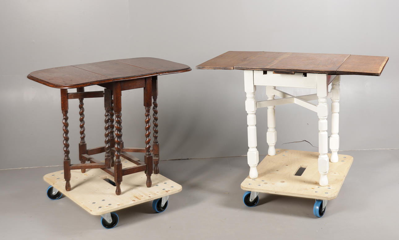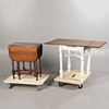AN OAK DRAWER LEAF TABLE TOGETHER WITH A DROP LEAF TABLE (2).