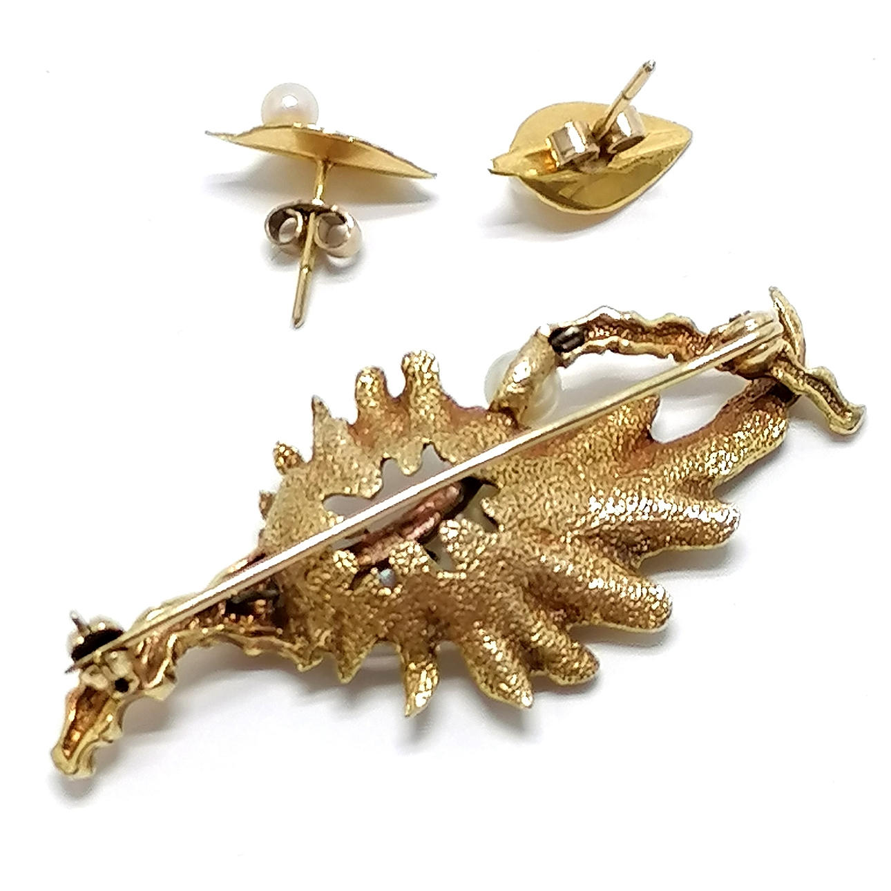 9ct hallmarked gold leaf brooch set with pearl - 4.8cm t/w 9ct hallmarked gold matched earrings - total weight (lot) 7.2g.