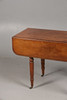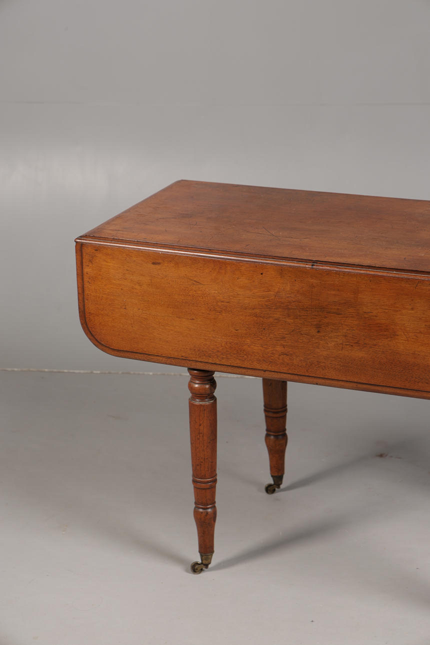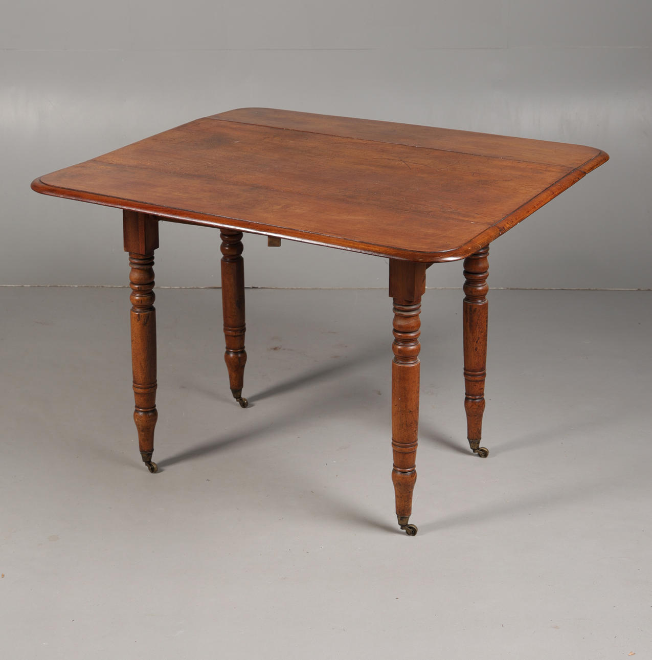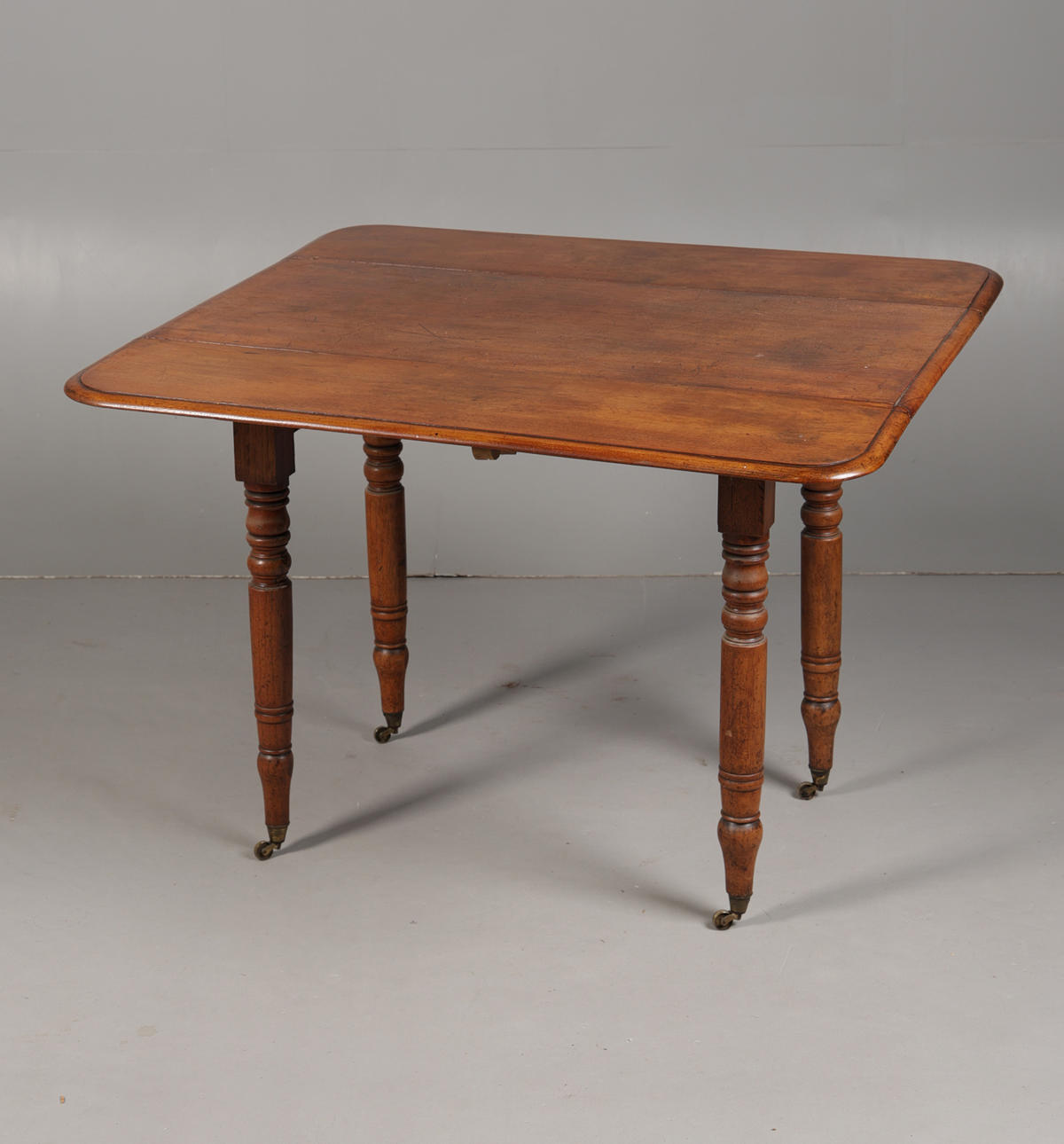 The rectangular drop leaf top raised on ring turned legs and brass castors, 98cm wide, 70cm high, 88cm deep including leaves.