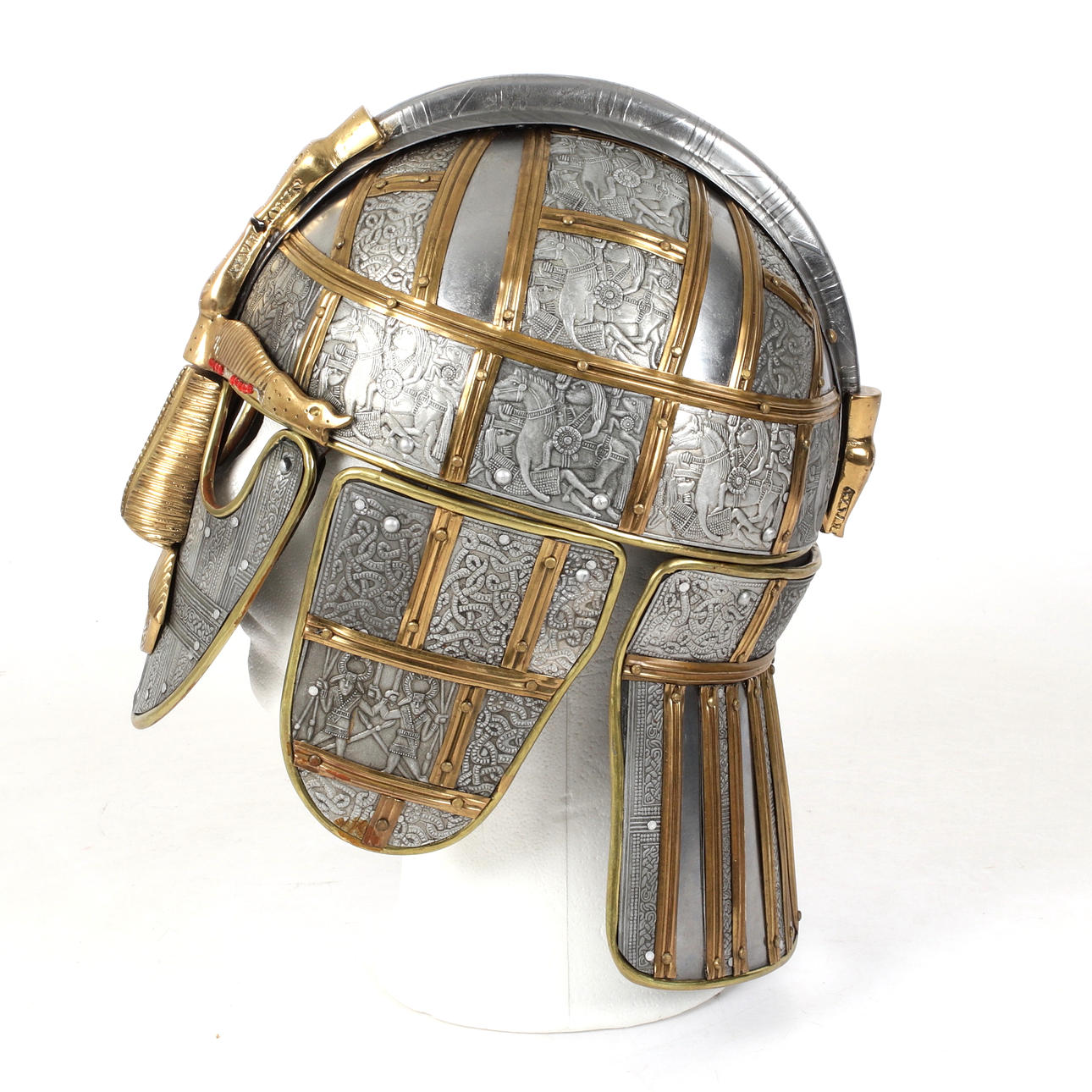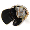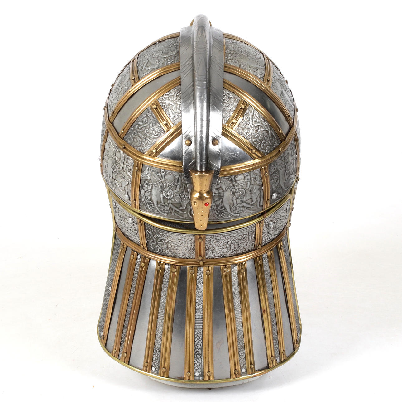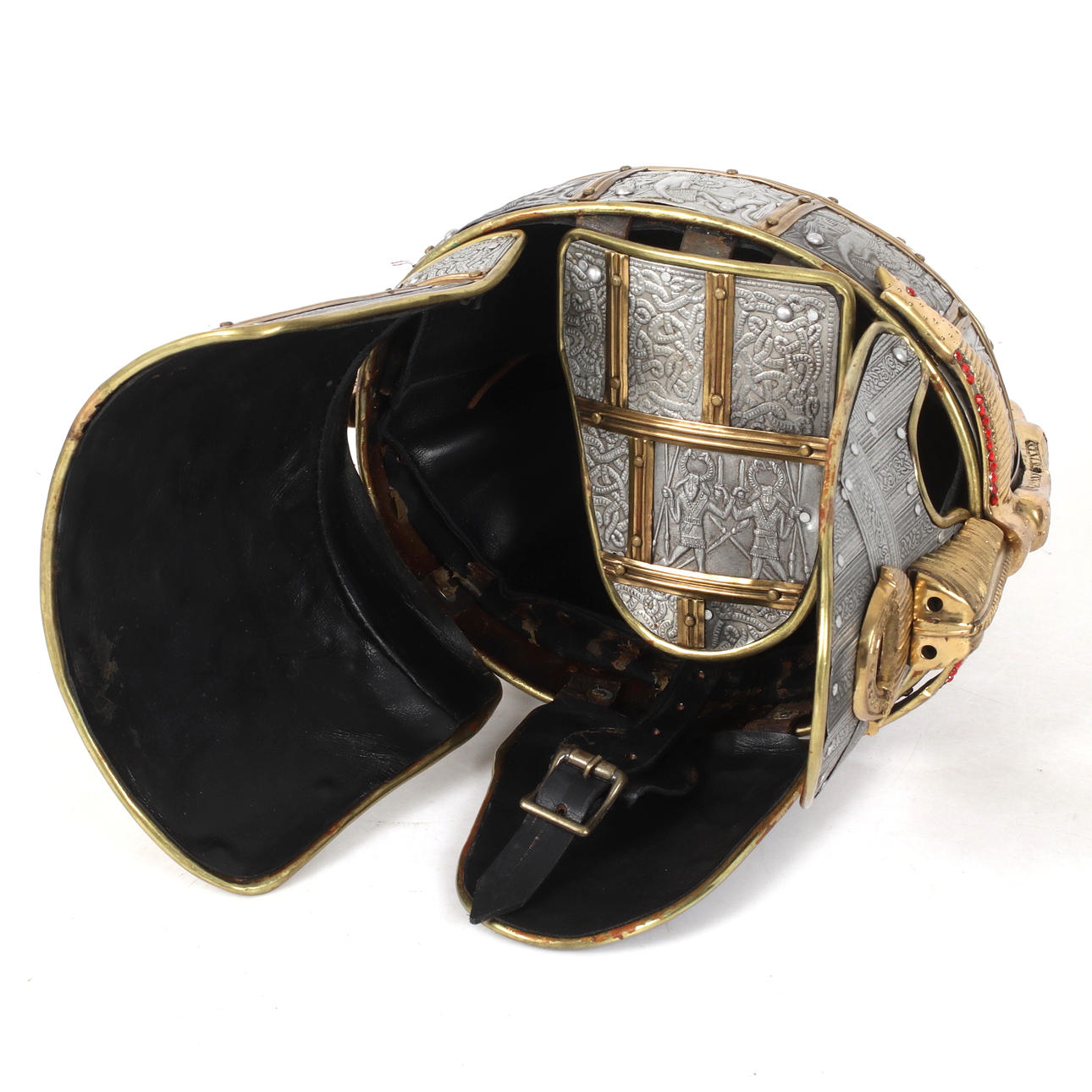 Metal frame including brass appliqués, glass beads, leather inner lining. Height 31, inner length approx. 23, inner width 20 cm.