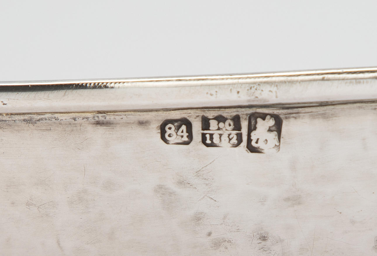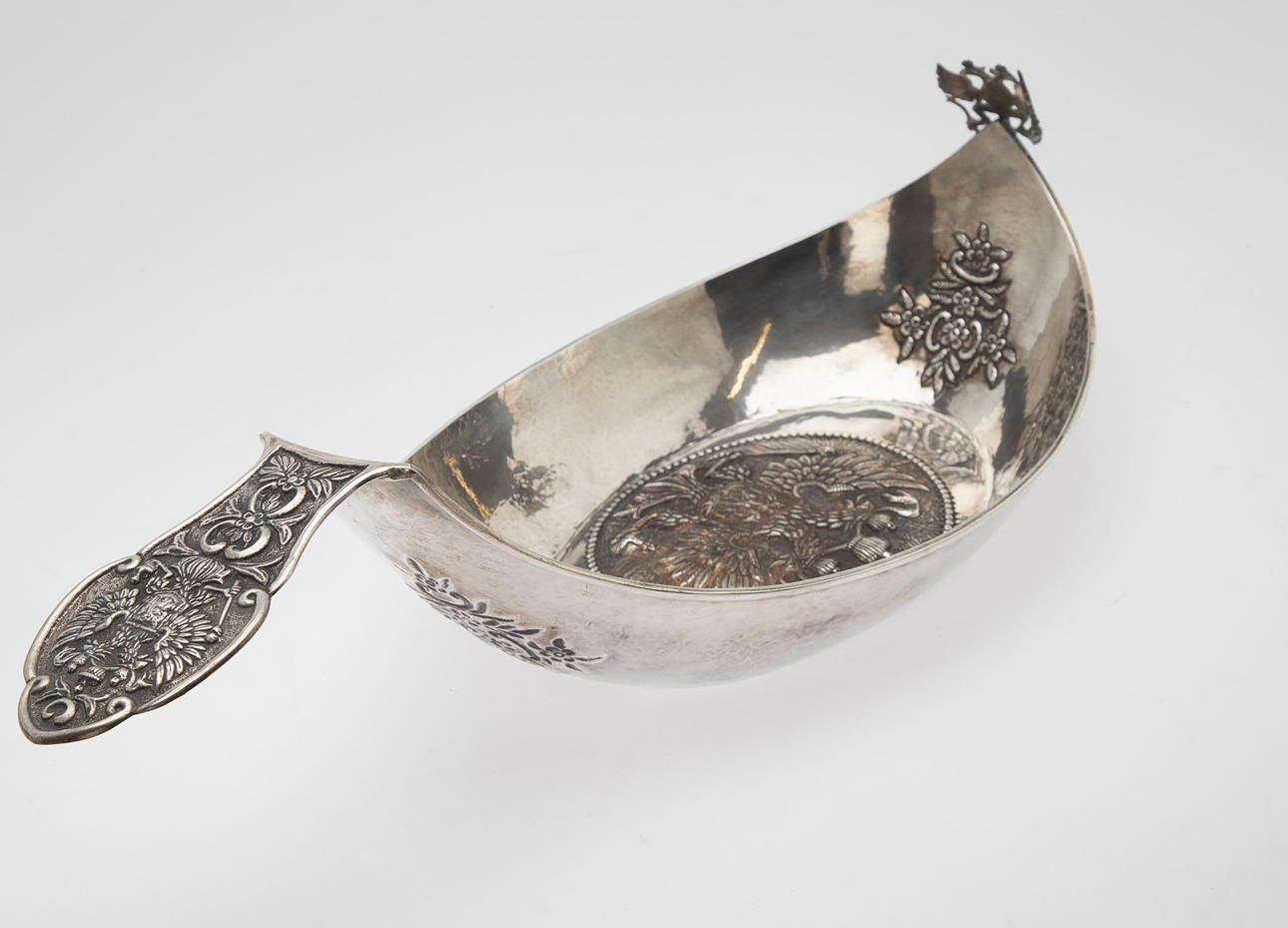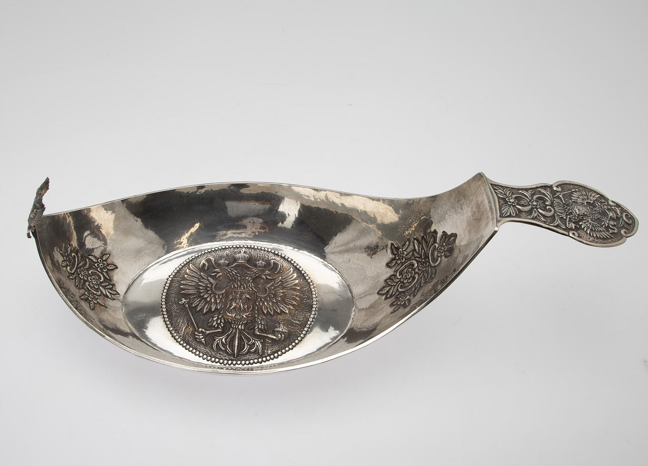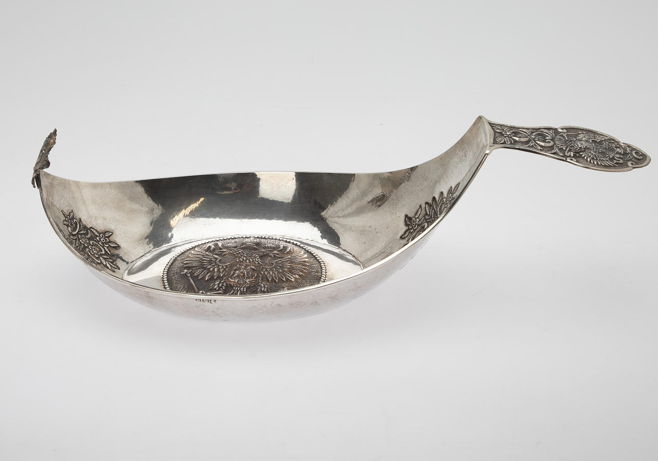 84 Zolotnik ((875 silver), carved and chiselled. Boat shape with angled walls and pointed sides. The Russian state emblem in relief in the round cartouche of the slightly curved mirror and on the horizontal handle. Applied, semi-plastic double-headed eagle figure on a narrow side. Silver stamp with city stamp and inspection by Victor Sawinkow (1855-1888). HxWxD: 13 x 46 x 20.5 cm, approx. 729g.