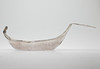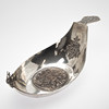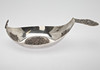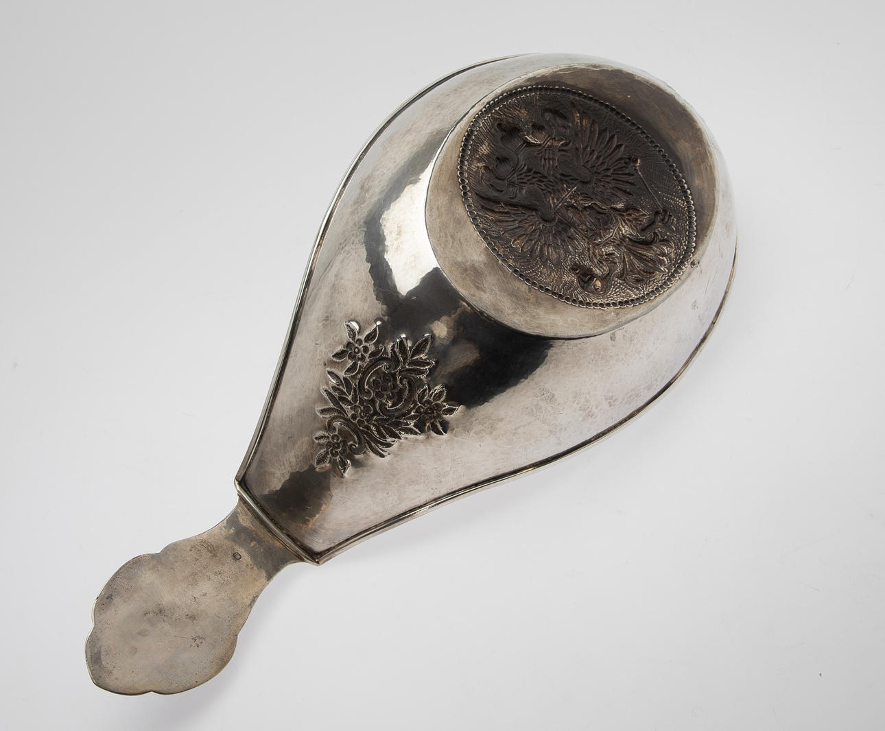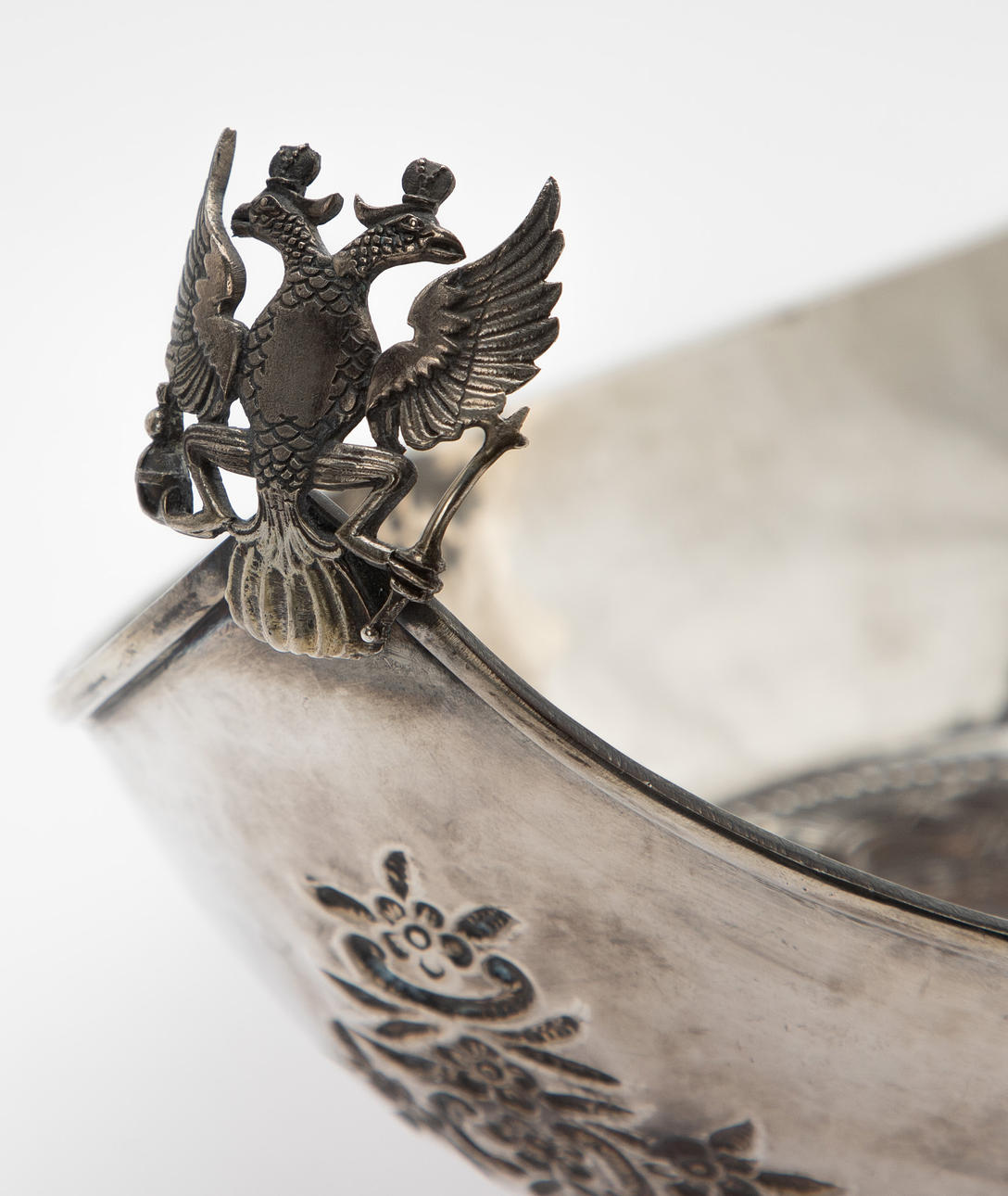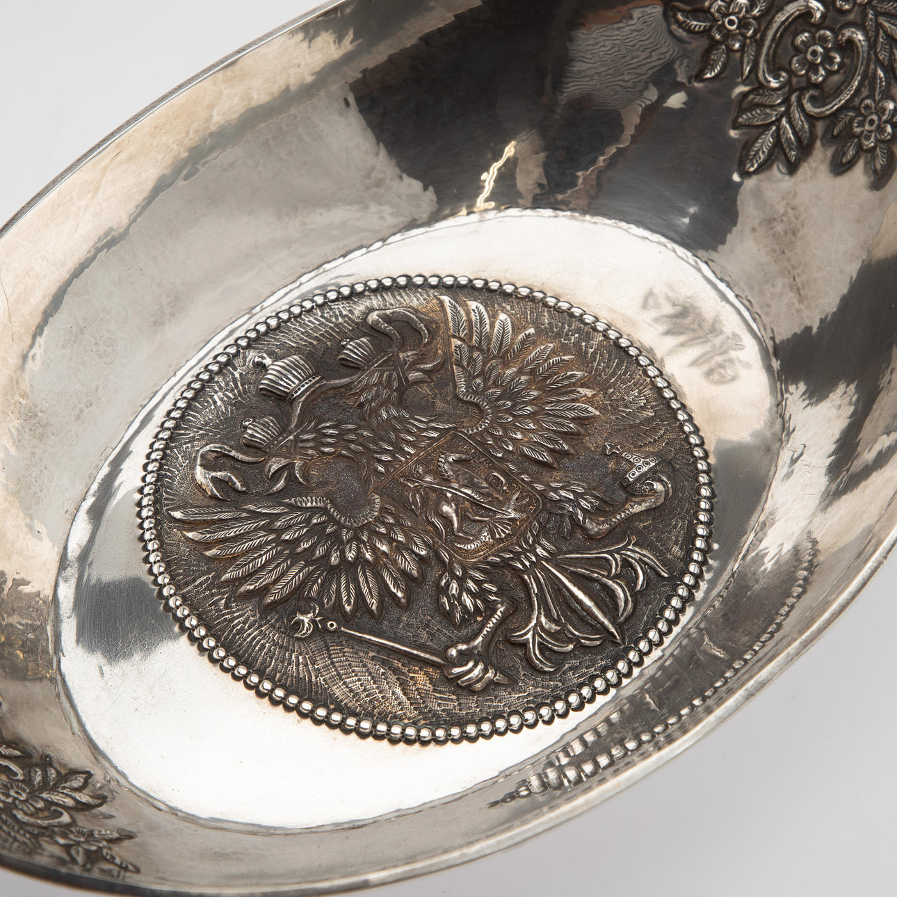84 Zolotnik ((875 silver), carved and chiselled. Boat shape with angled walls and pointed sides. The Russian state emblem in relief in the round cartouche of the slightly curved mirror and on the horizontal handle. Applied, semi-plastic double-headed eagle figure on a narrow side. Silver stamp with city stamp and inspection by Victor Sawinkow (1855-1888). HxWxD: 13 x 46 x 20.5 cm, approx. 729g.