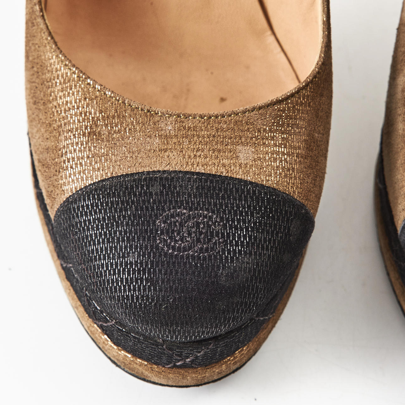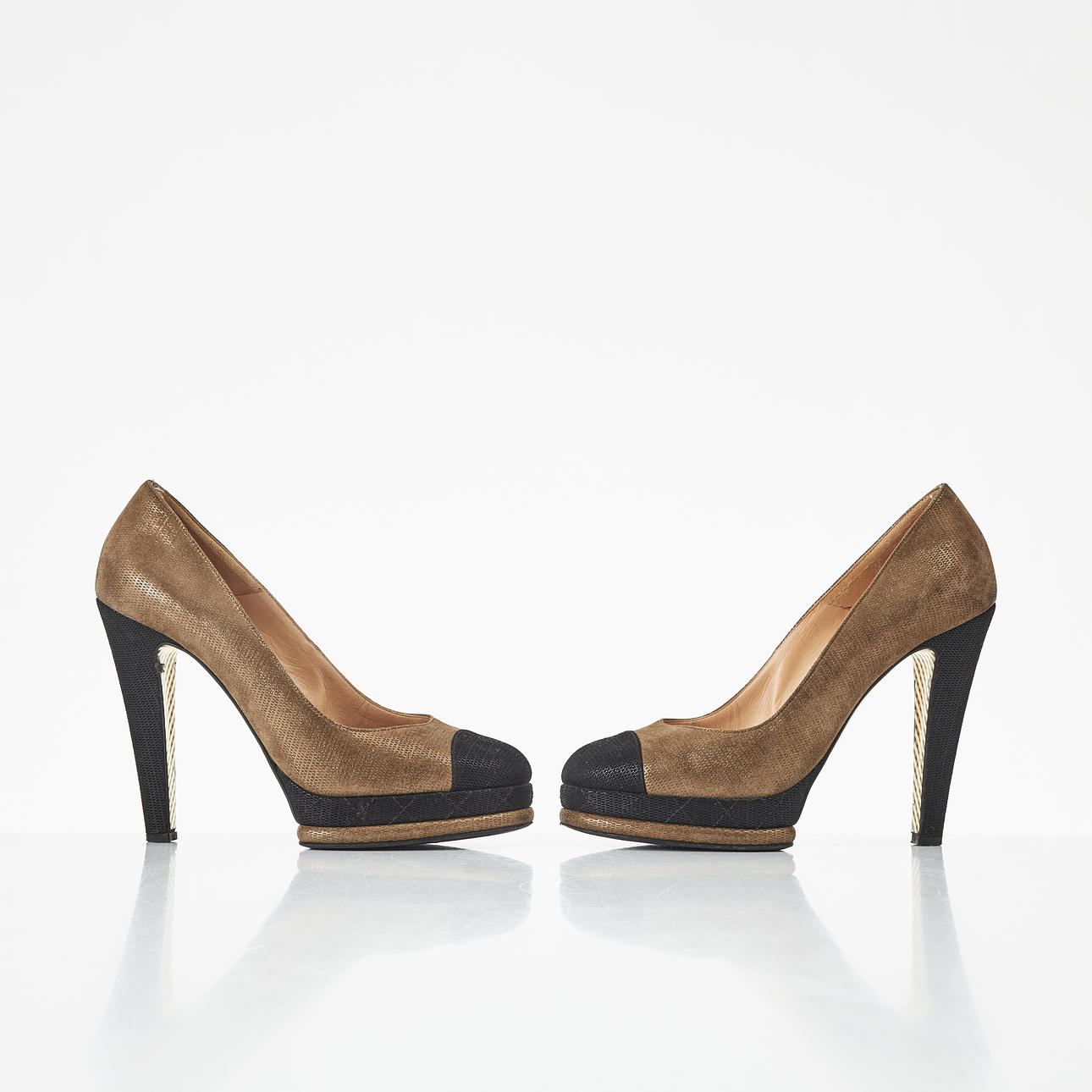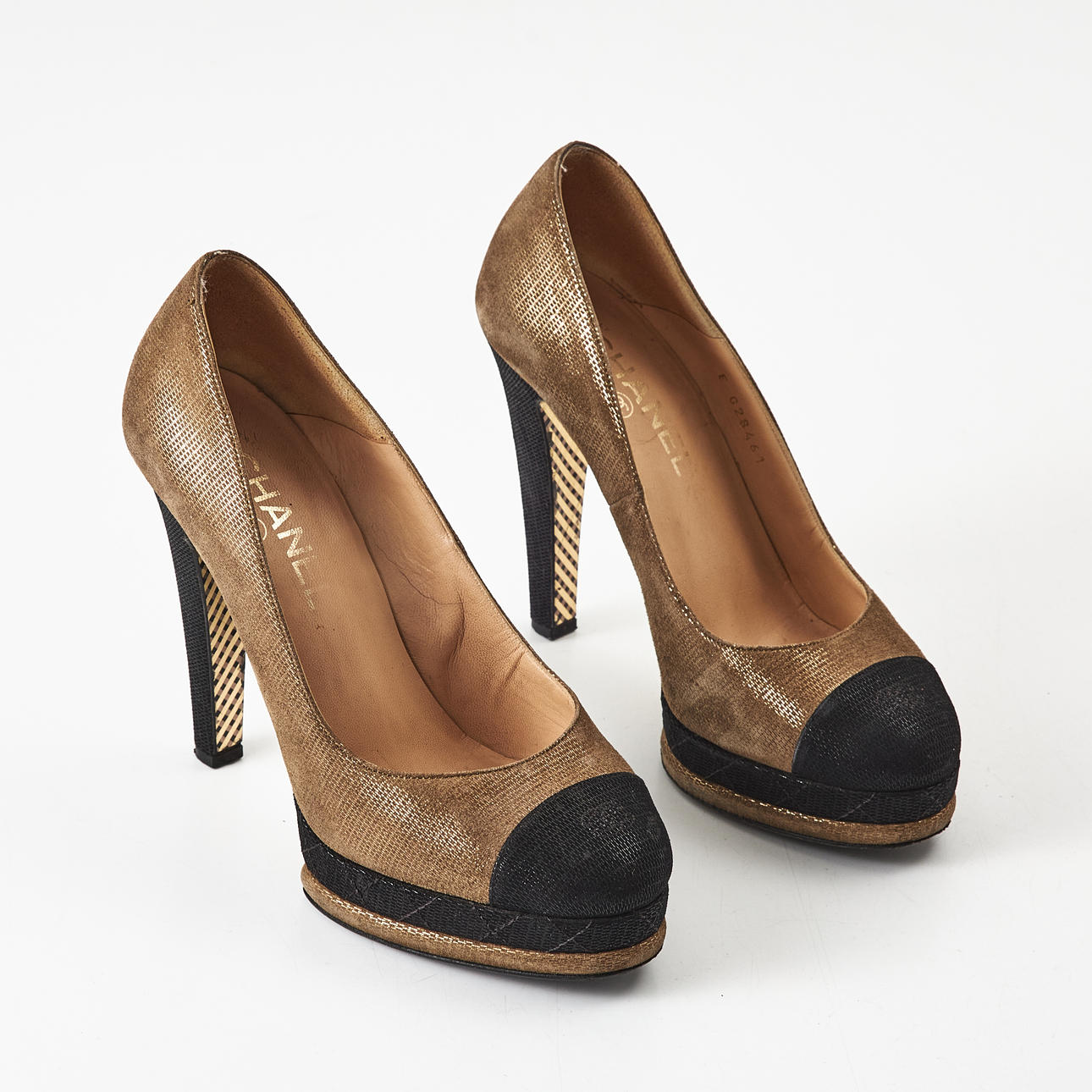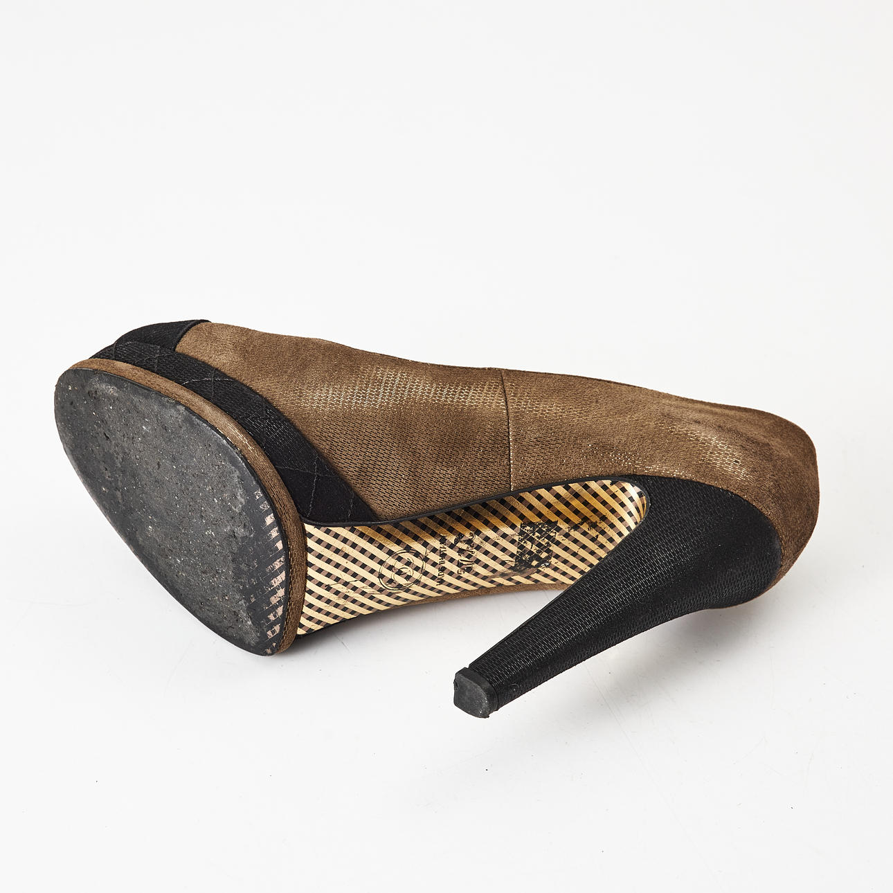 Metallic olive green and black textured suede, toe cap with CC logo, platform sole 2 cm, heel height 11.5 cm, IT size 37 1/2 according to label.