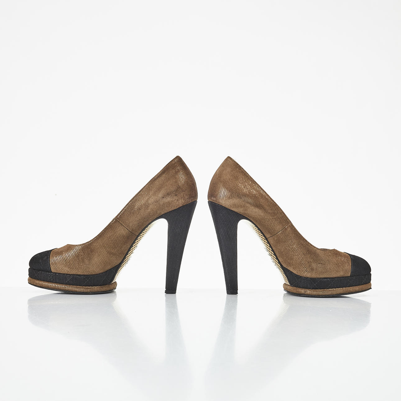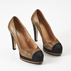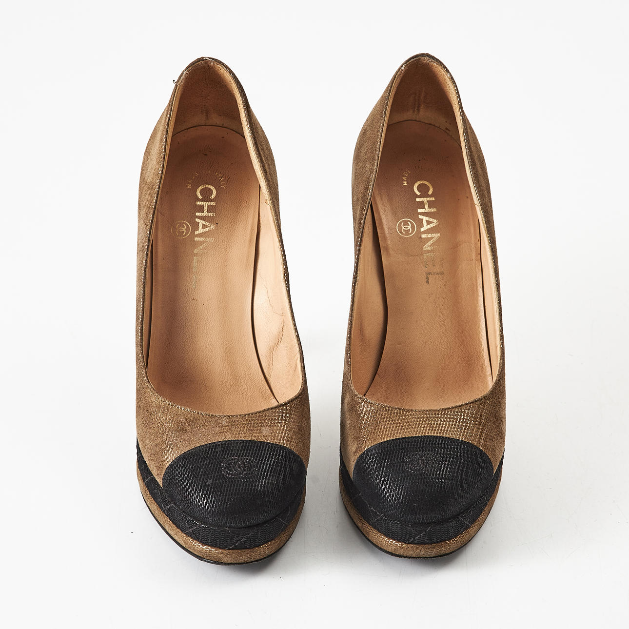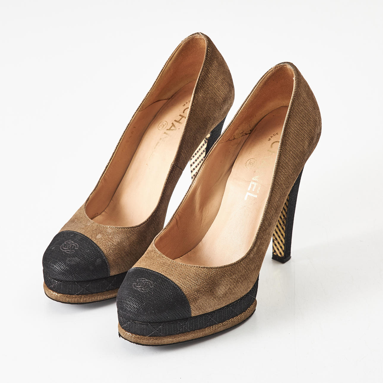 Metallic olive green and black textured suede, toe cap with CC logo, platform sole 2 cm, heel height 11.5 cm, IT size 37 1/2 according to label.