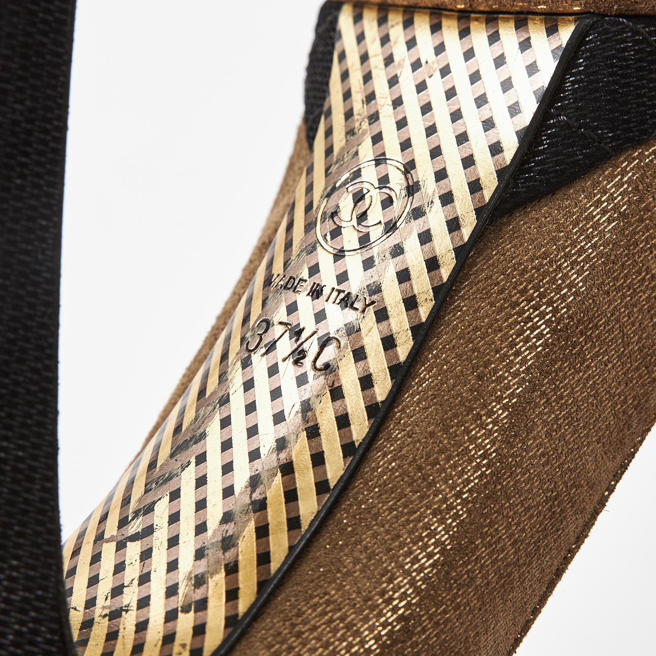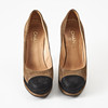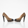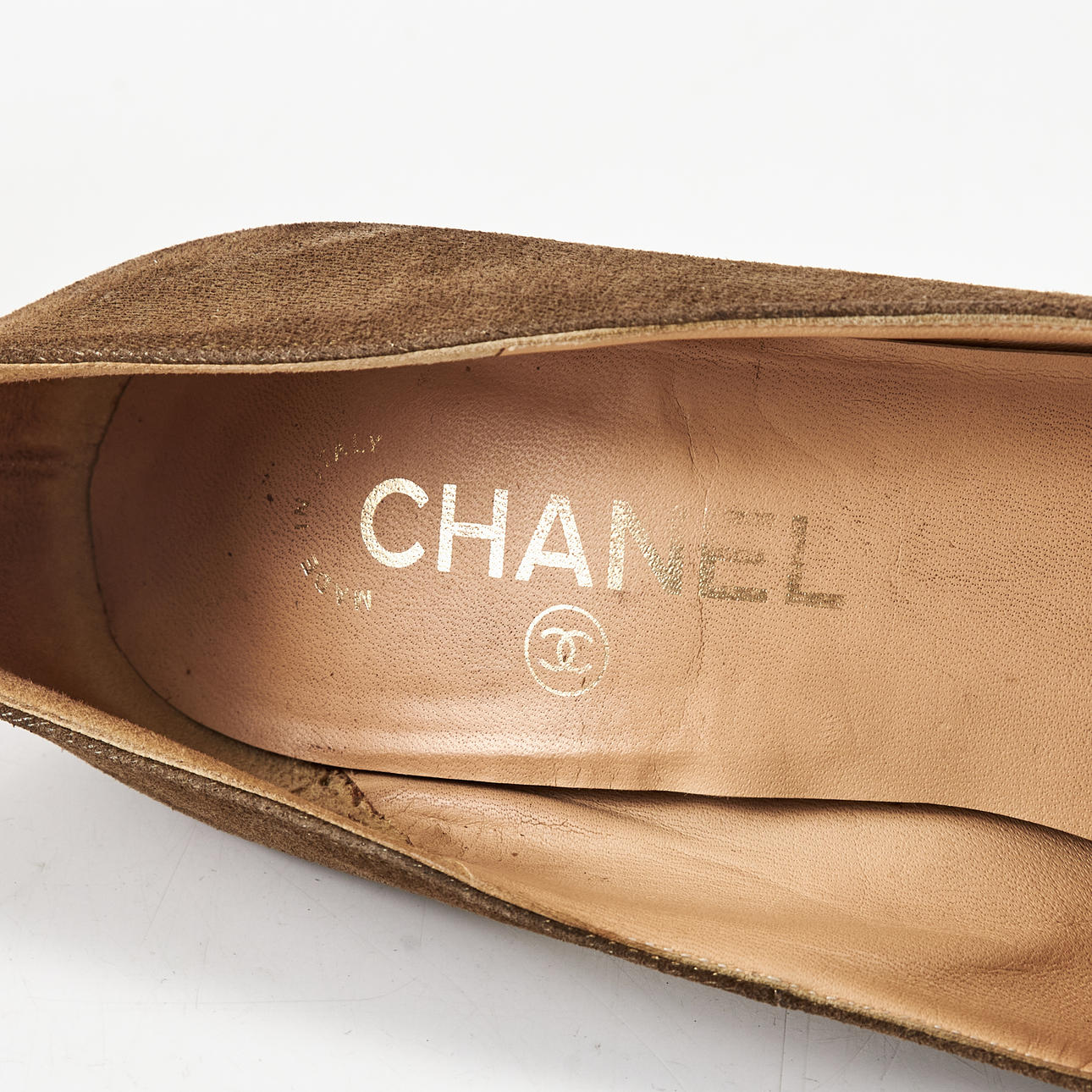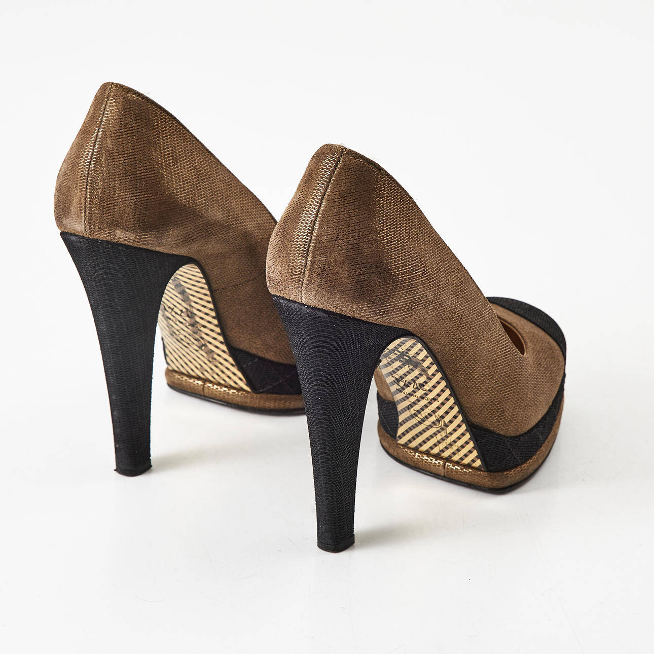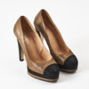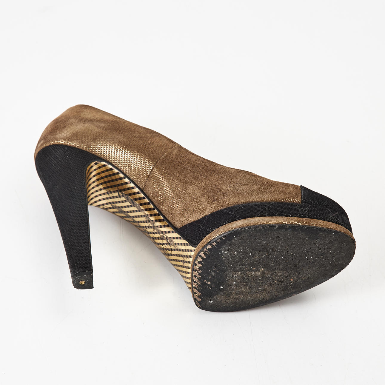 Metallic olive green and black textured suede, toe cap with CC logo, platform sole 2 cm, heel height 11.5 cm, IT size 37 1/2 according to label.