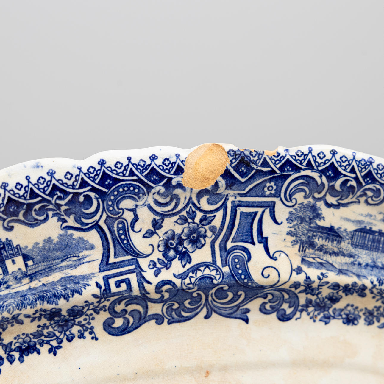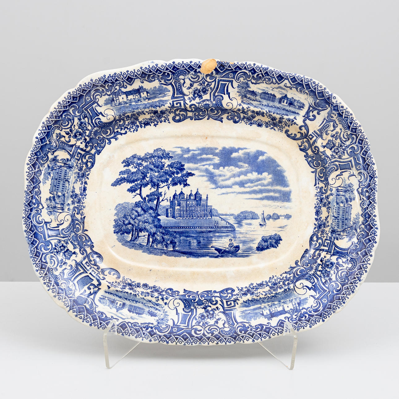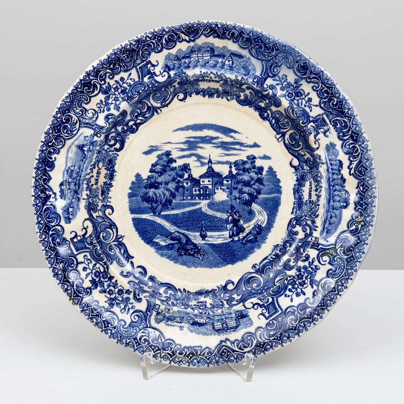 White background with blue floral decor and castle.