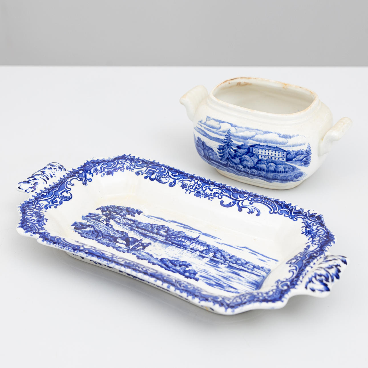 Normal wear and tear to harder wear, marks, chips, stains, damage, cracks, glaze damage, discolorations, sugar bowl has no cover.