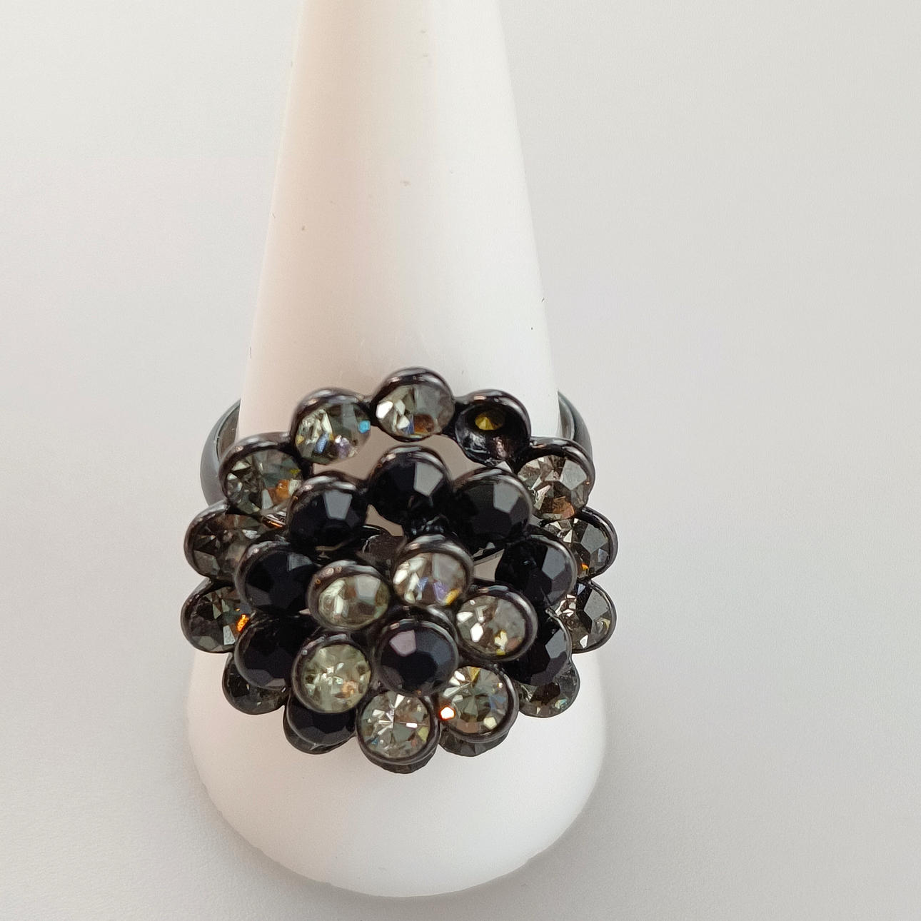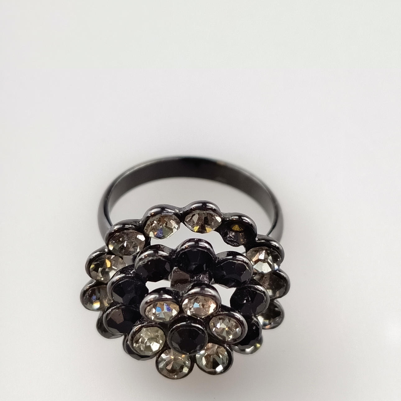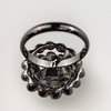 round three-tiered ring head, set with faceted black onyxes and rock crystals, flower in the middle, diameter Ring head 20 mm, black lacquered socket, ring size: 5 (19mm-DM.), weight approx. 8.7 g.
