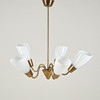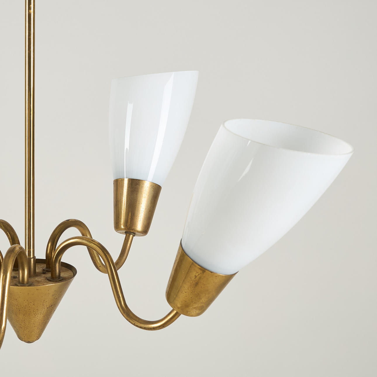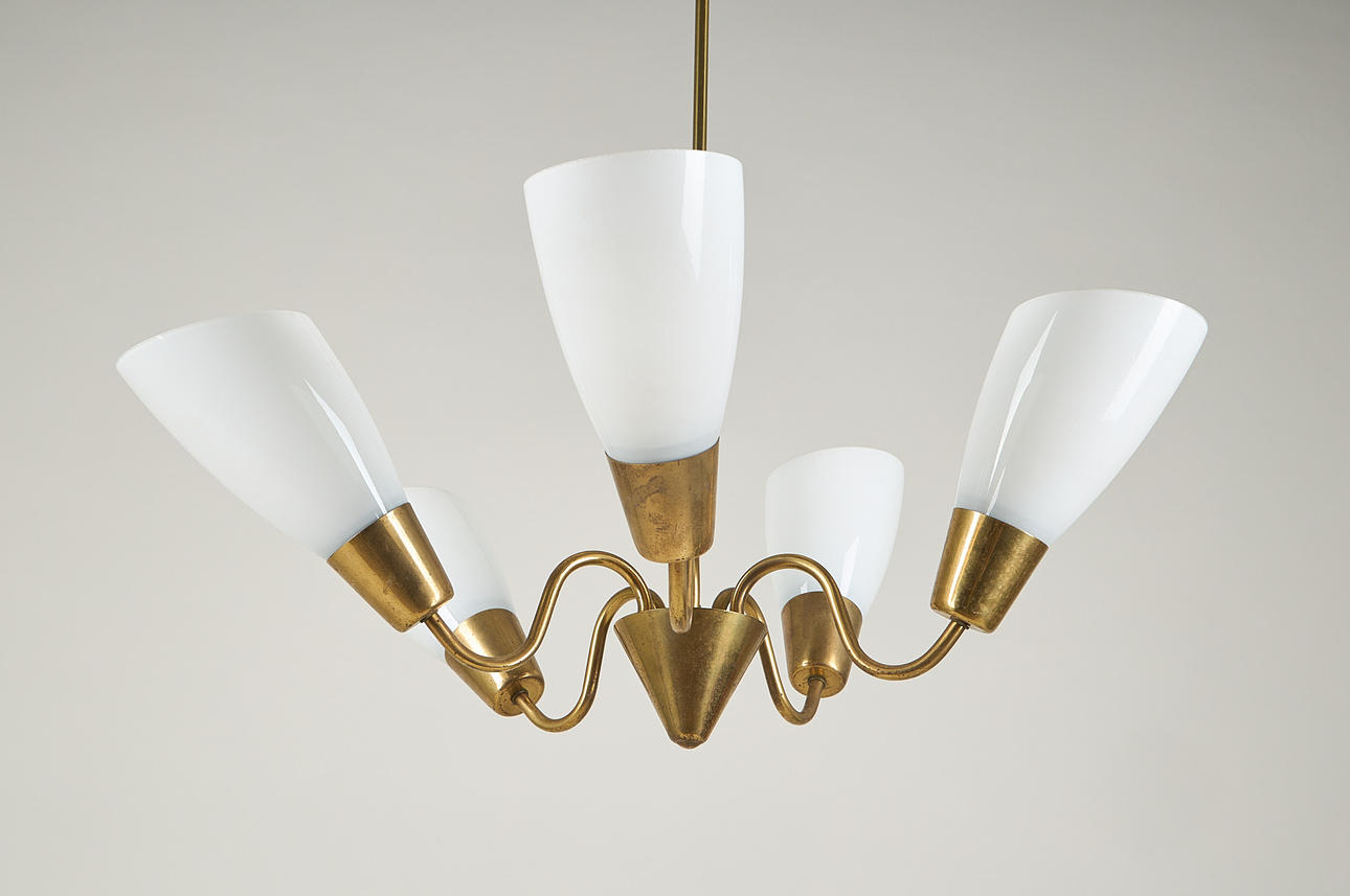 Brass frame, five glass cups. Height approx. 60 cm. Diameter 72 cm.