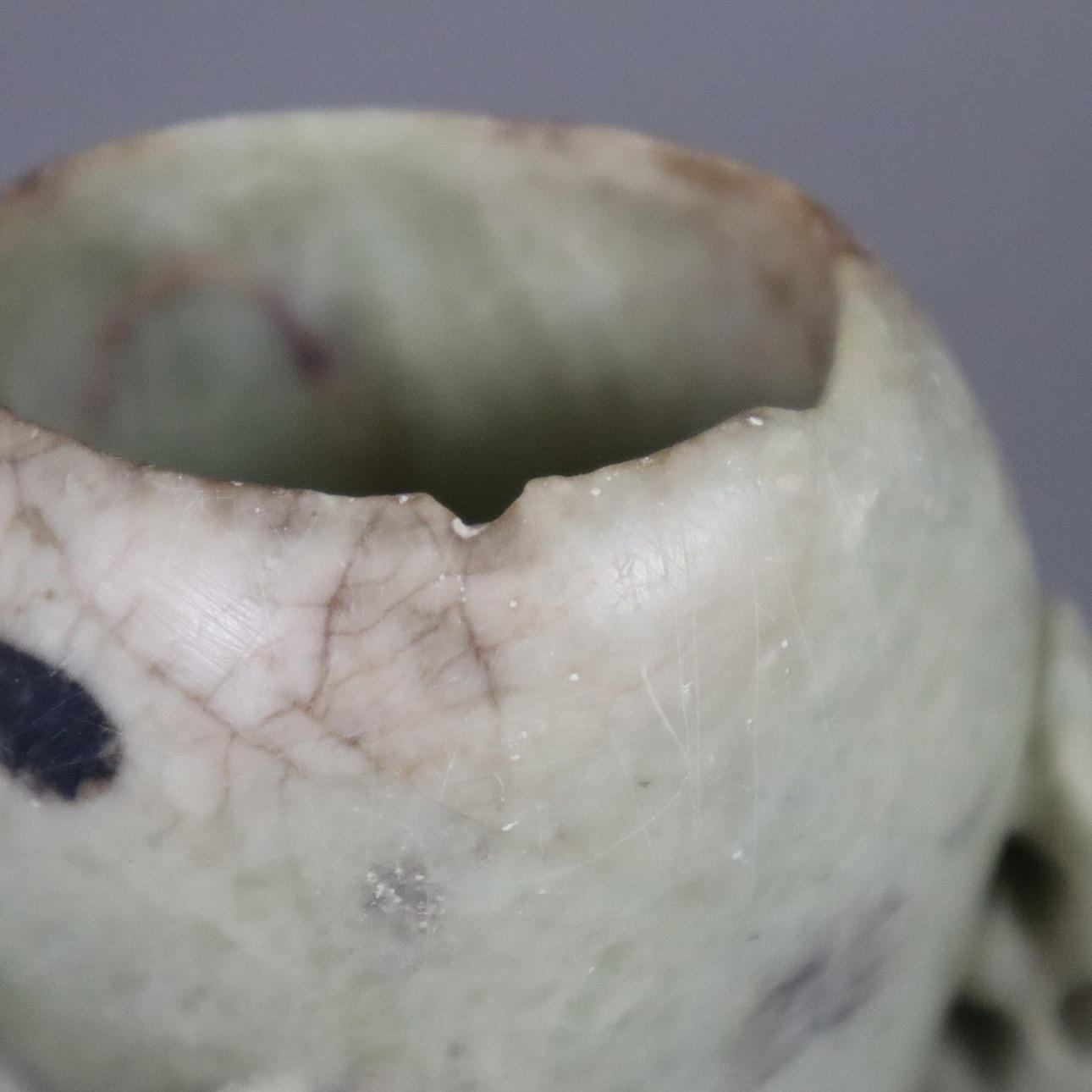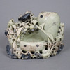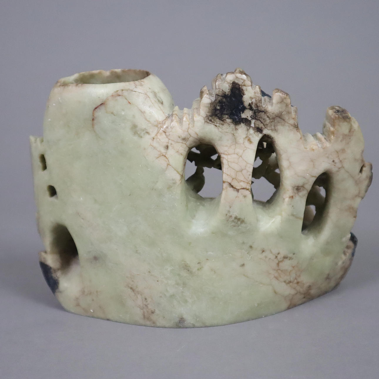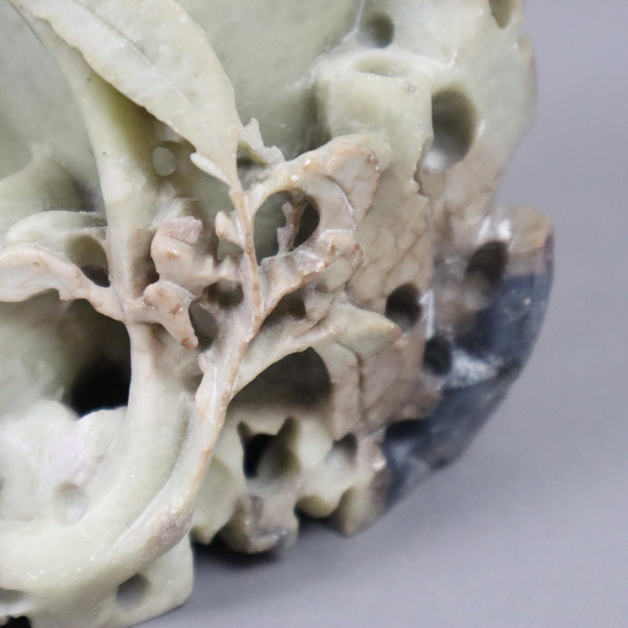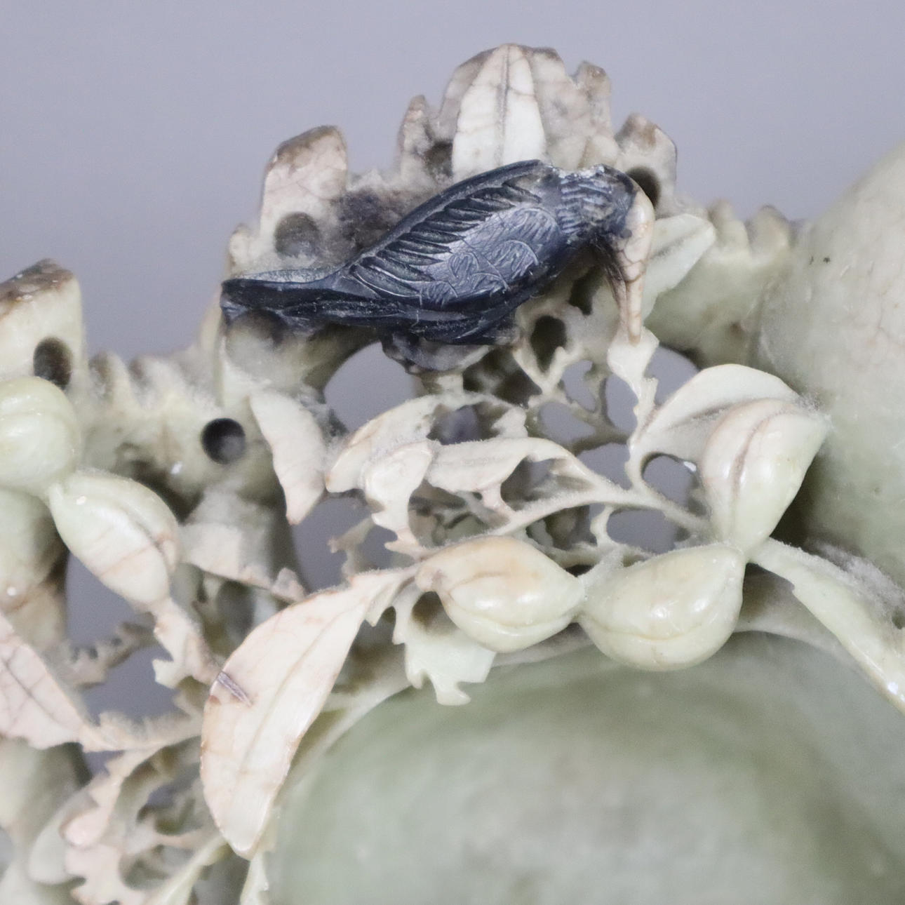 Soapstone, finely cut with fruit-bearing tree branches and bird, 12.5 x 16 cm, weight approx. 1042 g.