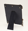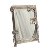 A pewter Art Nouveau style mirror, depicting a lady in a long dress and various flowers, and with a bevelled glass plate. With an easel back support, unmarked. 37cms high.