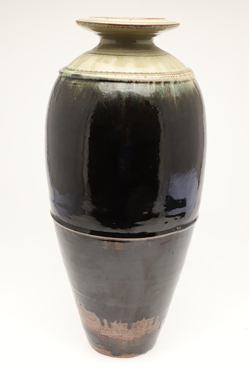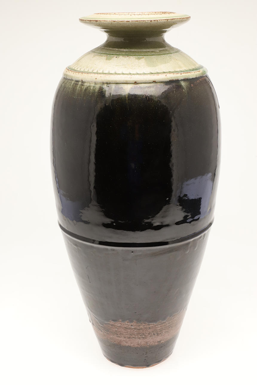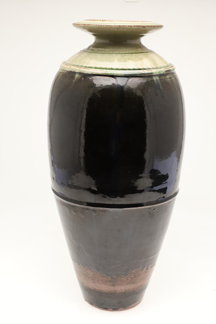 A large stoneware bottle shaped vase with raised bands, with a celadon ash glaze to the rim and neck, the body with a dark tenmoku glaze. Unmarked, 62cms high