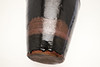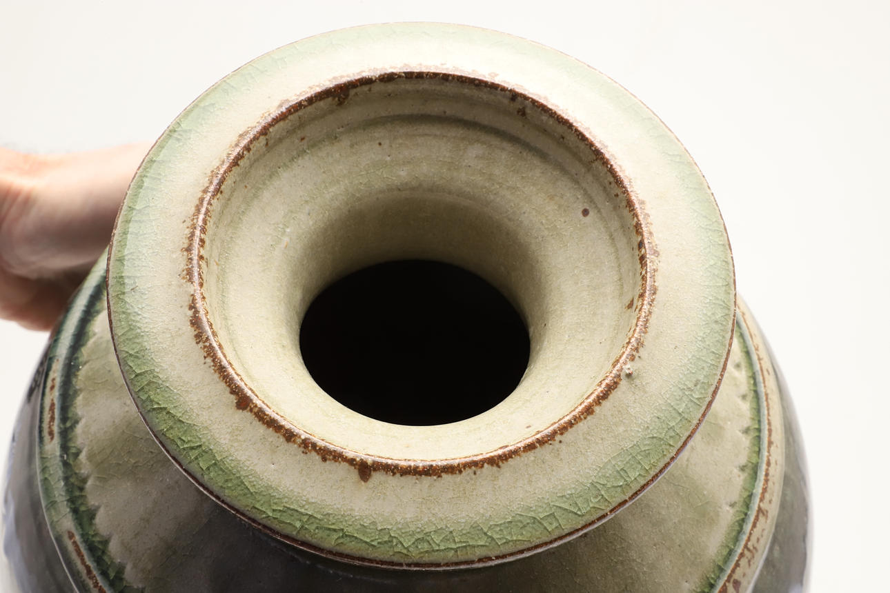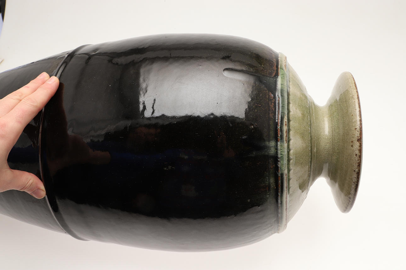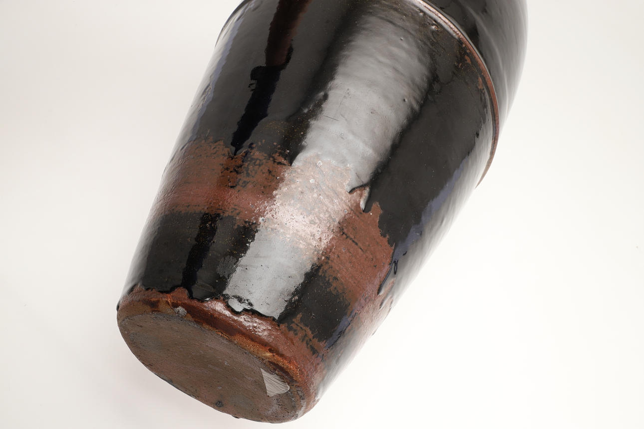A large stoneware bottle shaped vase with raised bands, with a celadon ash glaze to the rim and neck, the body with a dark tenmoku glaze. Unmarked, 62cms high