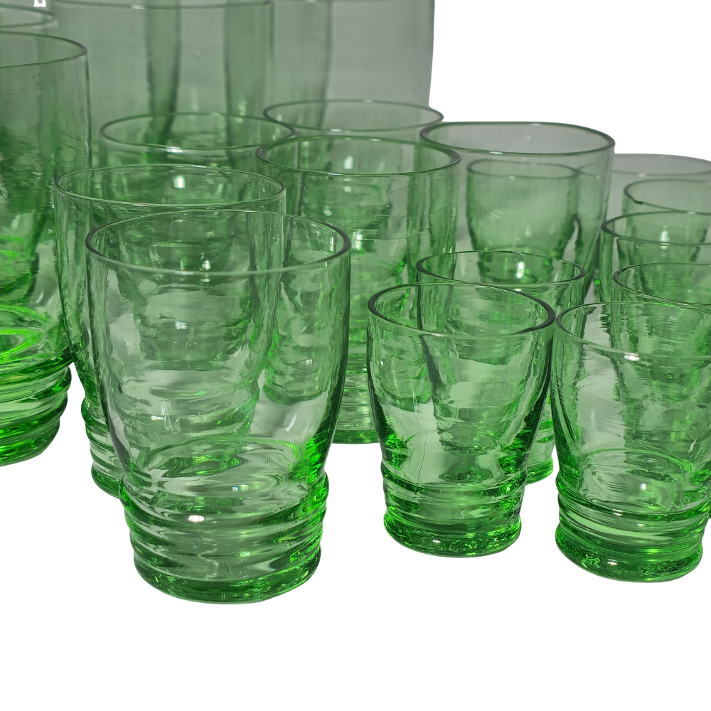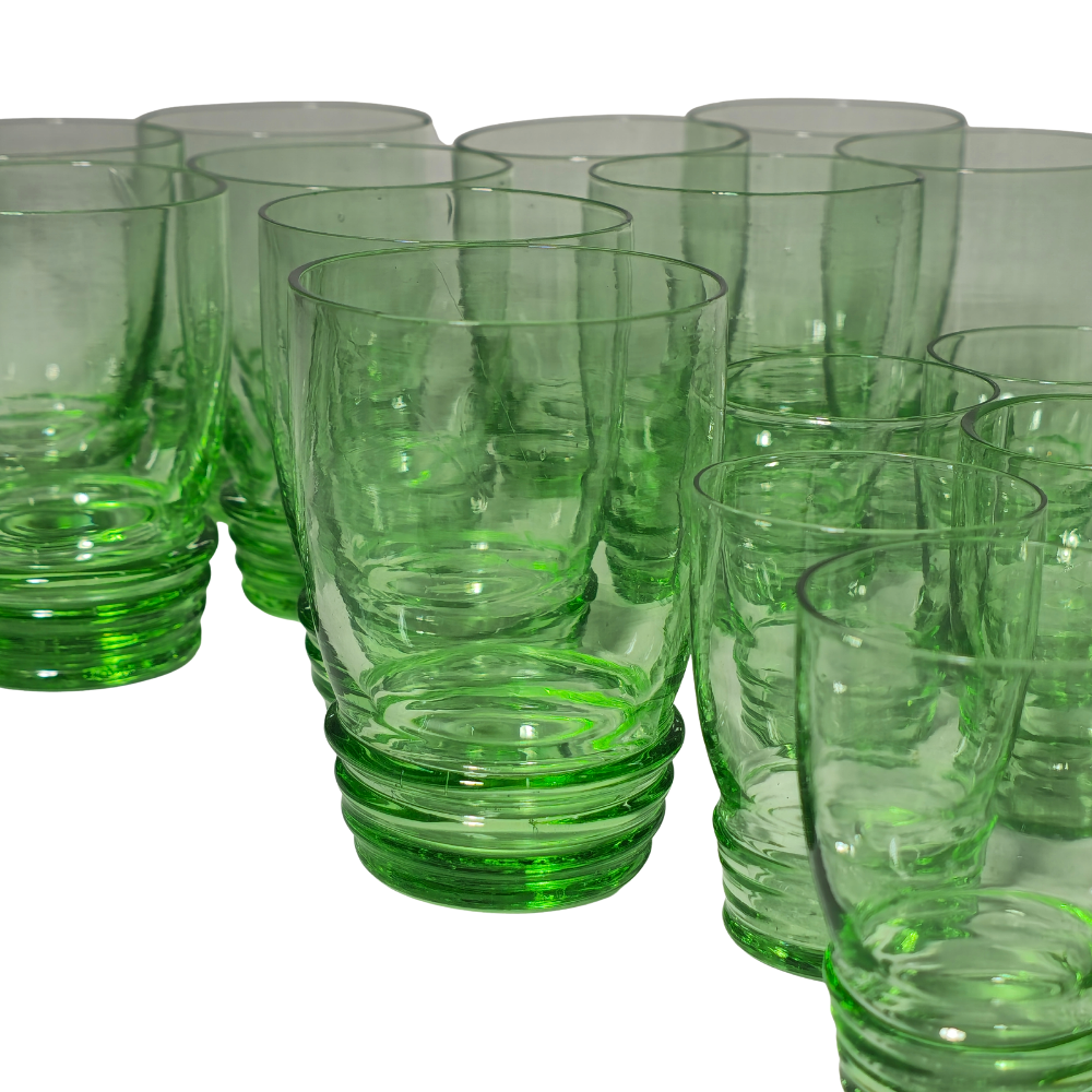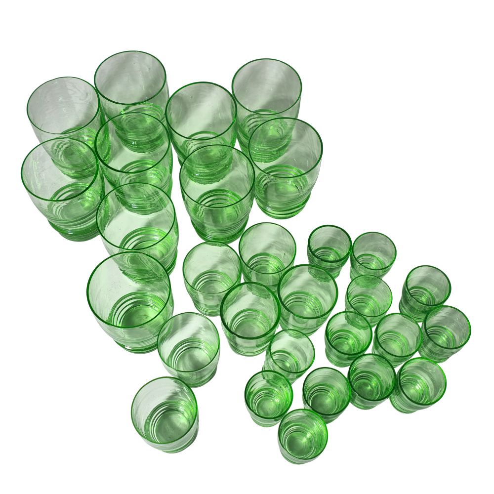 ASSORTED GREEN LIQUEUR GLASSES.