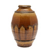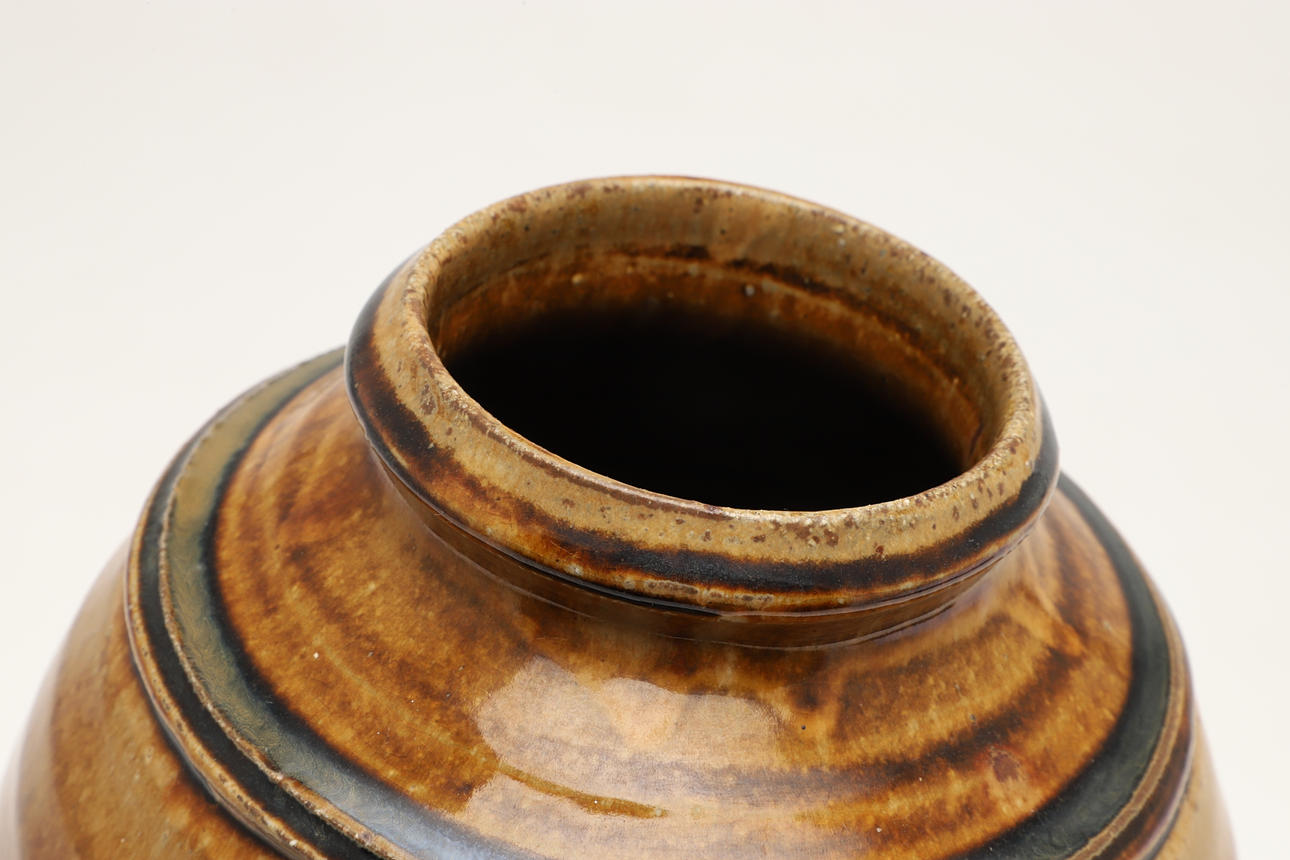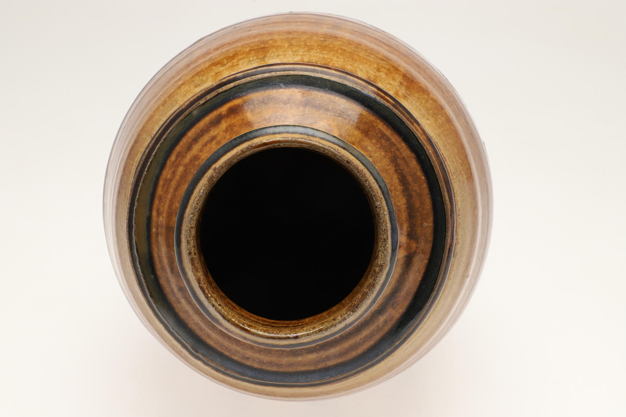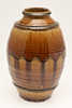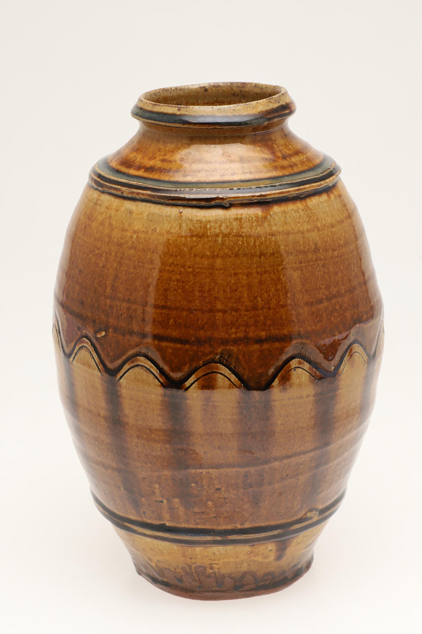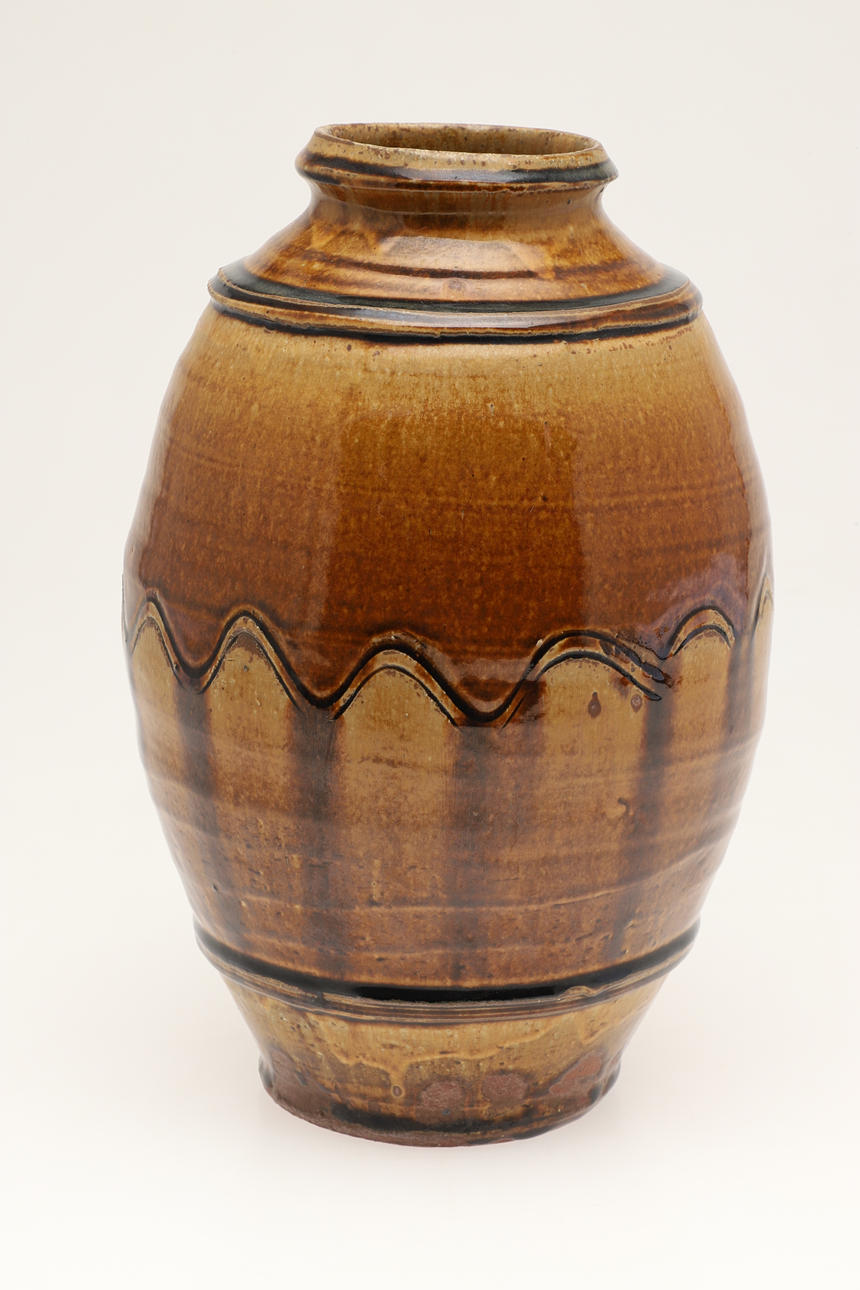Probably by Mike Dodd, the stoneware vase with raised and incised decoration and with a yellow and brown glaze. Unmarked, 33.5cms high