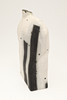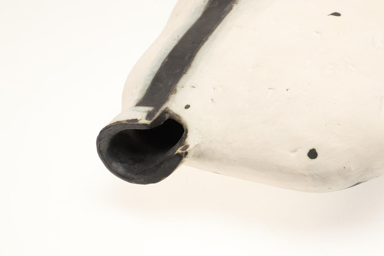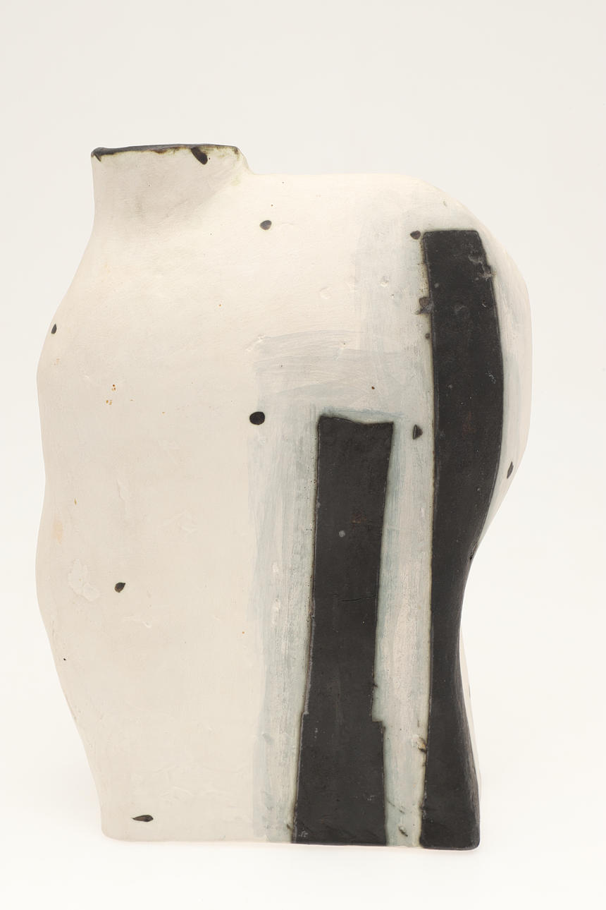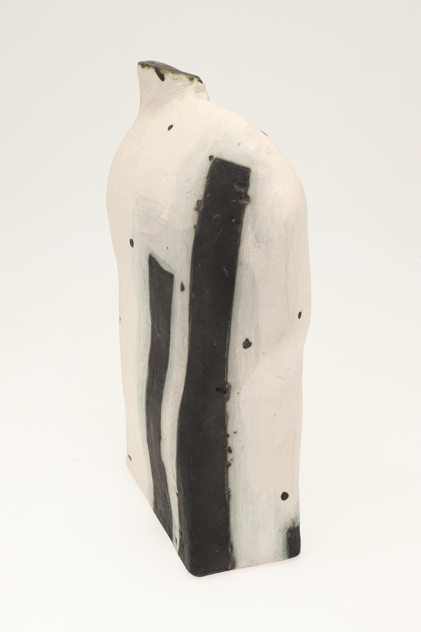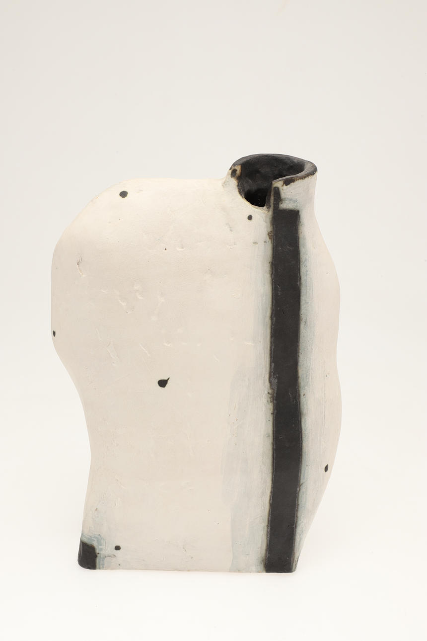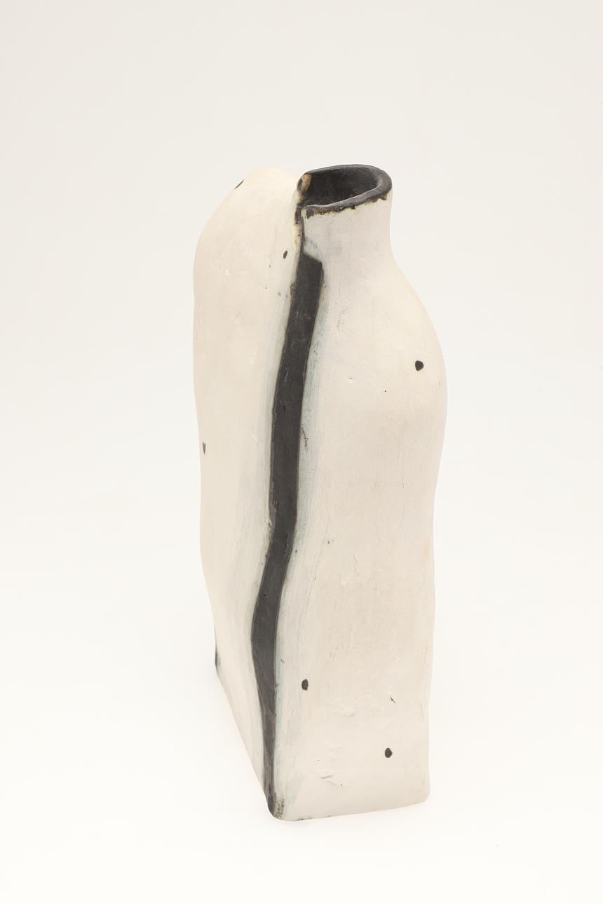 The handbuilt black and white vase with a small aperture and curved sides. Painted signature to the base. 31cms high, 21cms across at widest point.