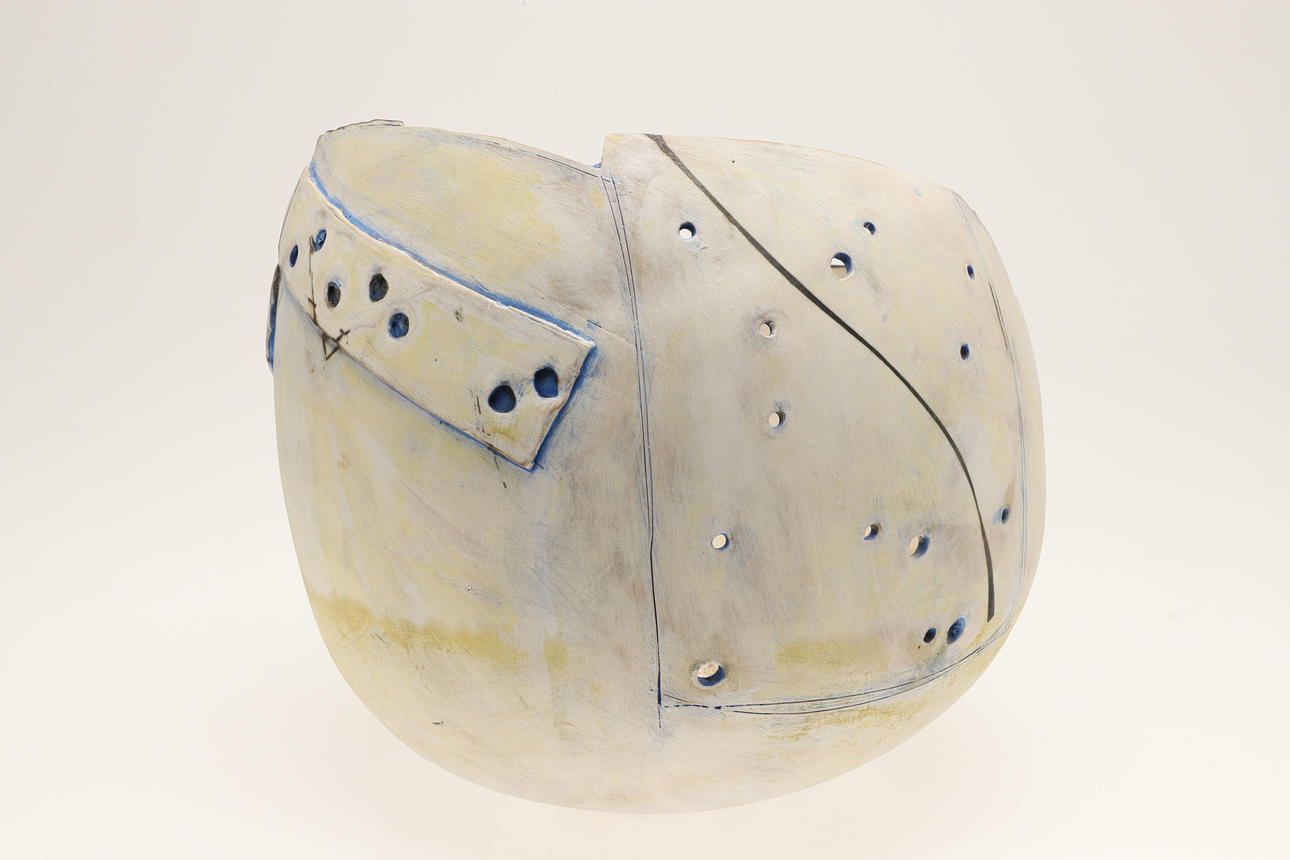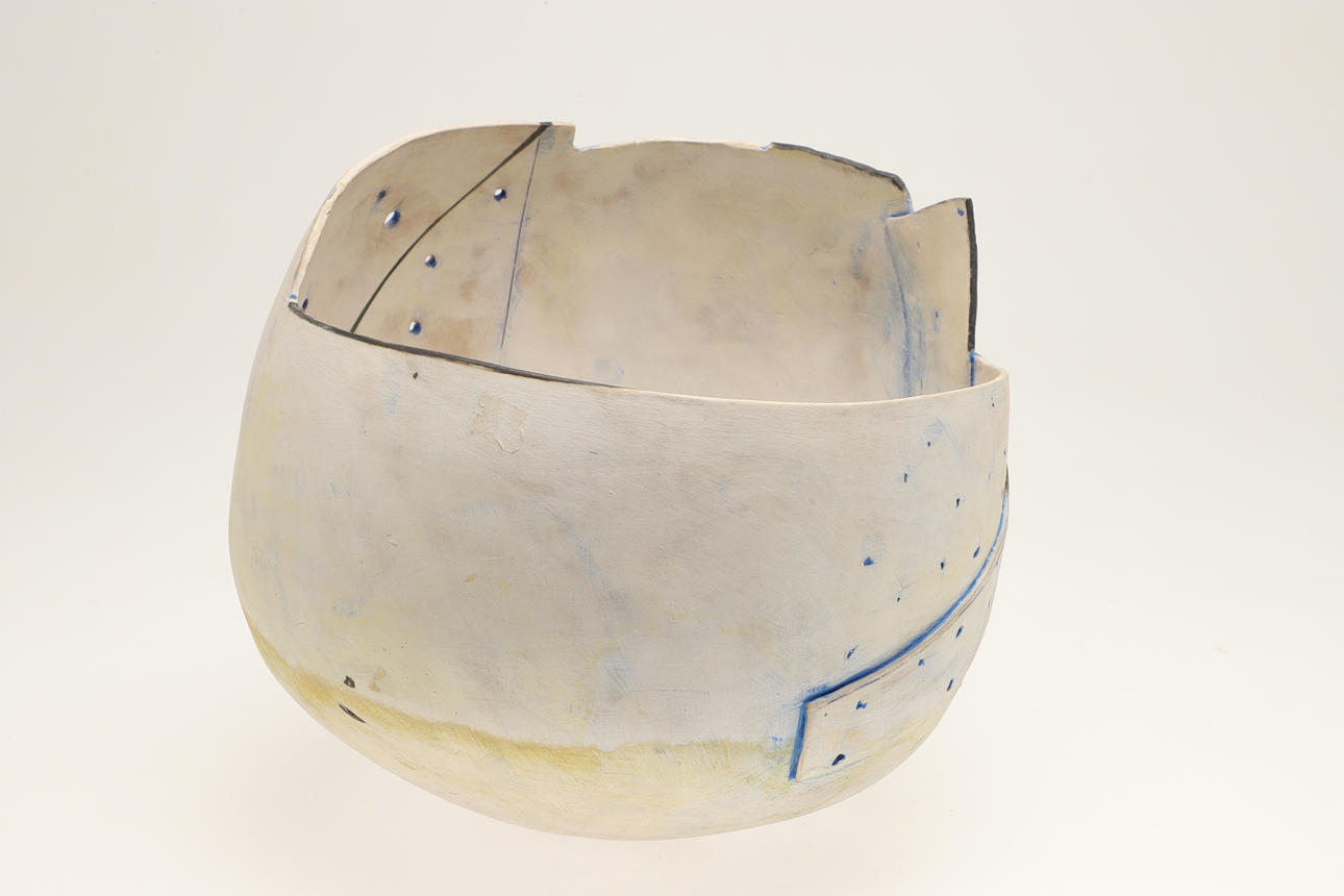 The large handbuilt bowl of circular shape with an angular and curved rim, pierced with a variety of holes and with some painted decoraion. Signed and dated 85. 30cms high, approx 30cms diameter