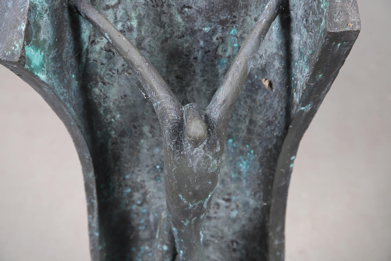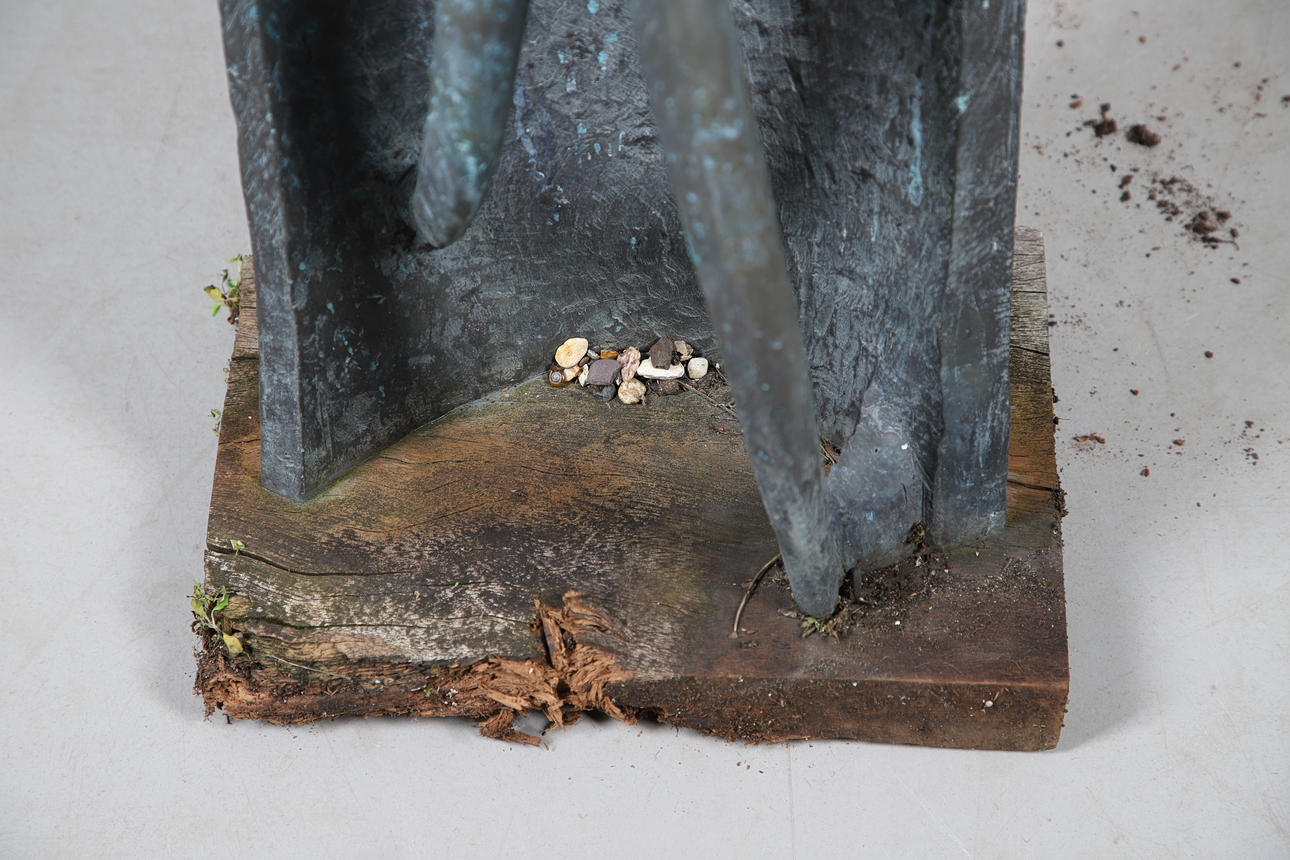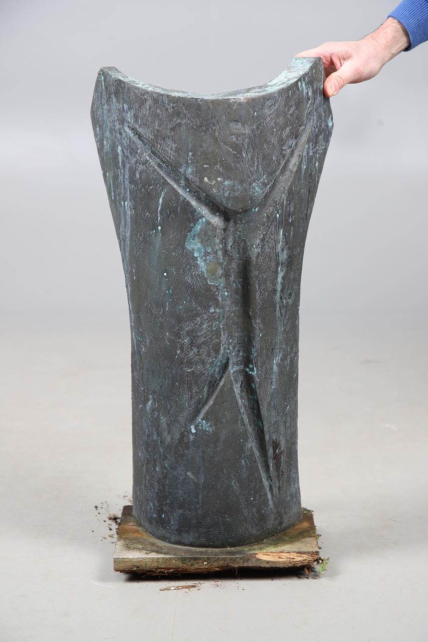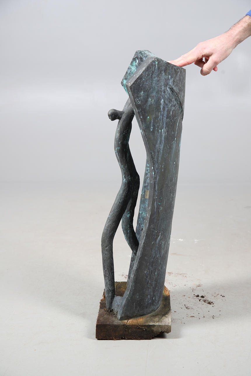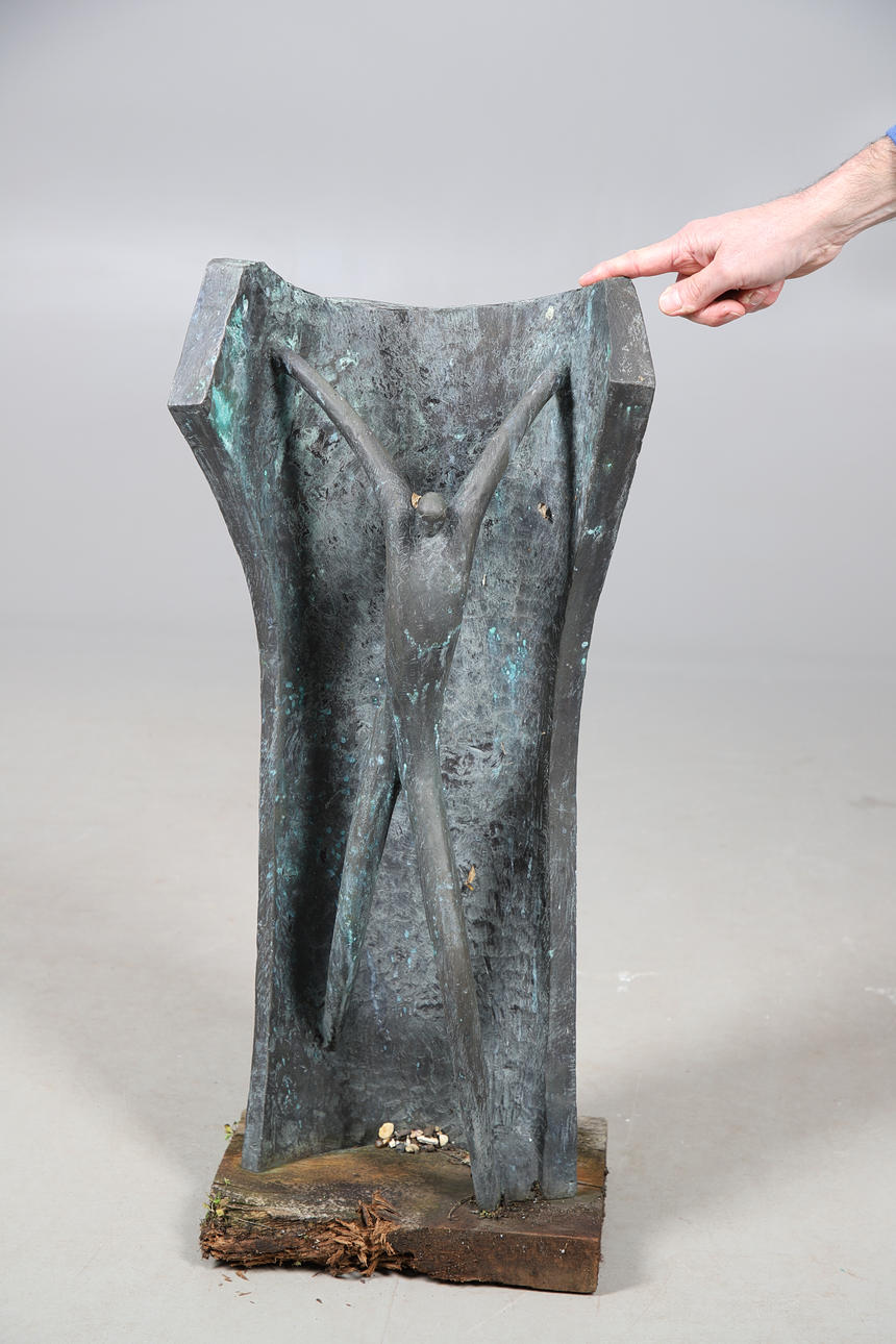 This has been used outside, so the wooden plinth has some losses and staining over time, the sculpture does not stand upright on its own because of the losses to the wood, it would need to be secured to the ground. The bronze also with some changes of colour over time.