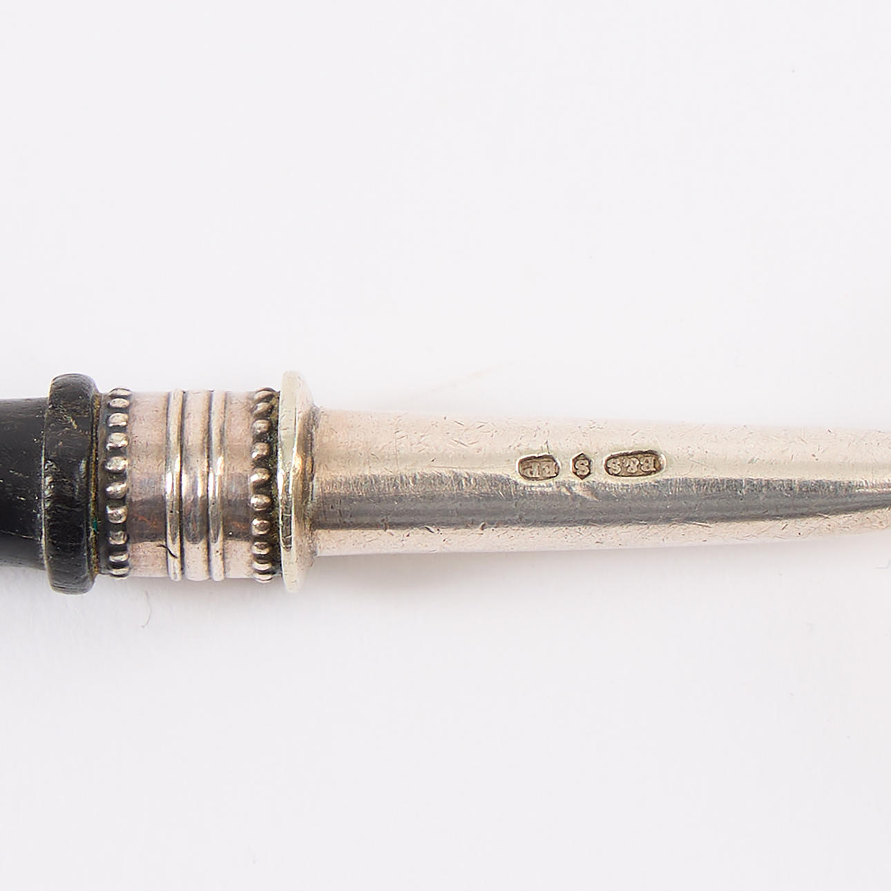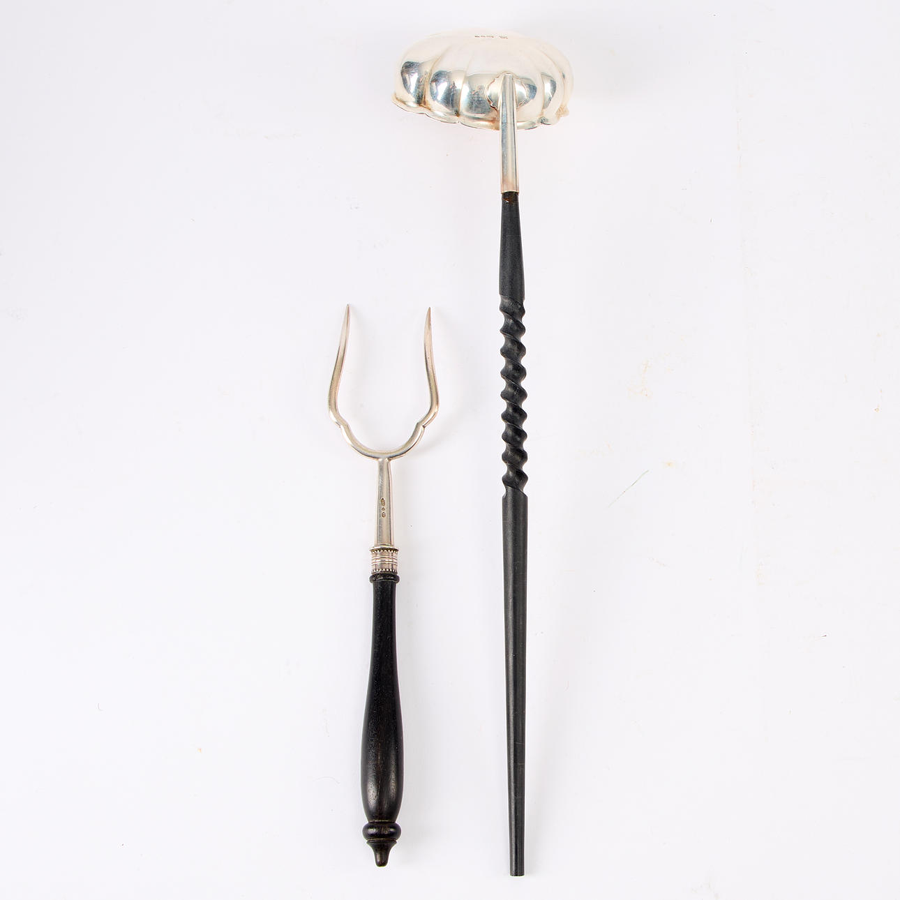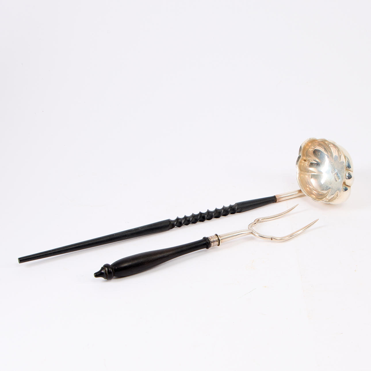 Silver sauce spoon with English stamps, wooden handle. The fork of the plait with a wooden shank. Weight of the ladle about 53 g, L about 32 cm.
