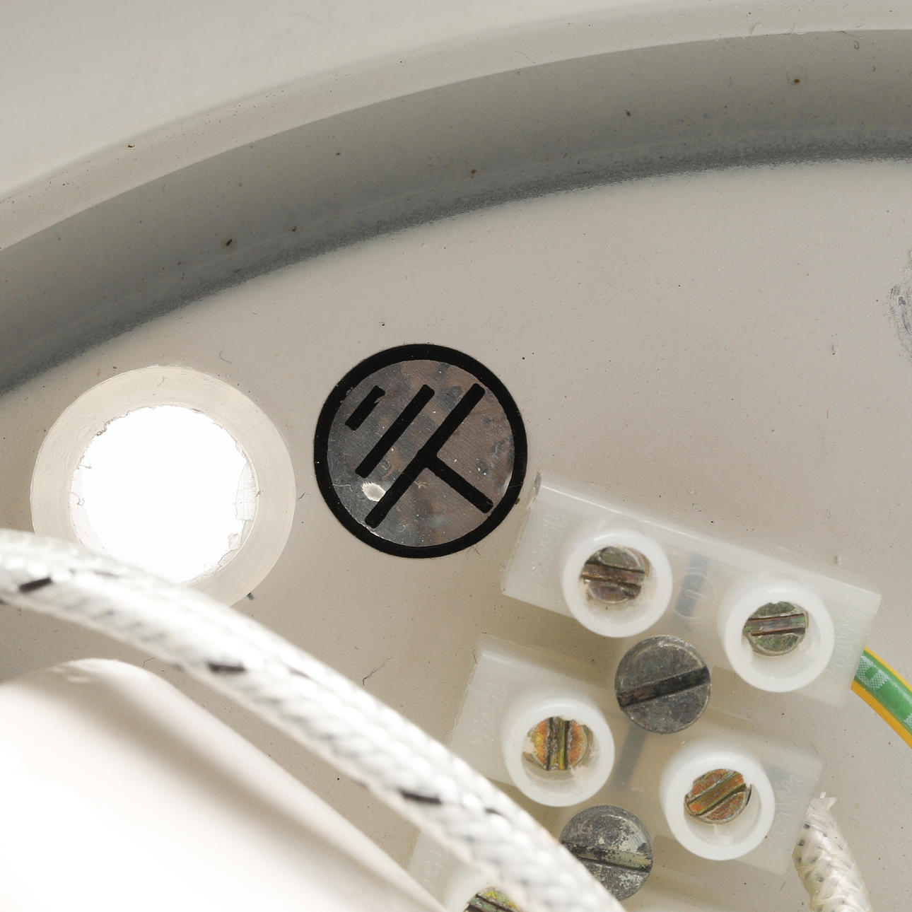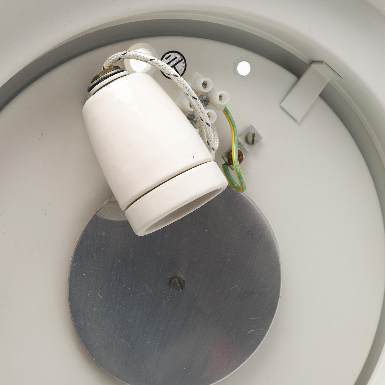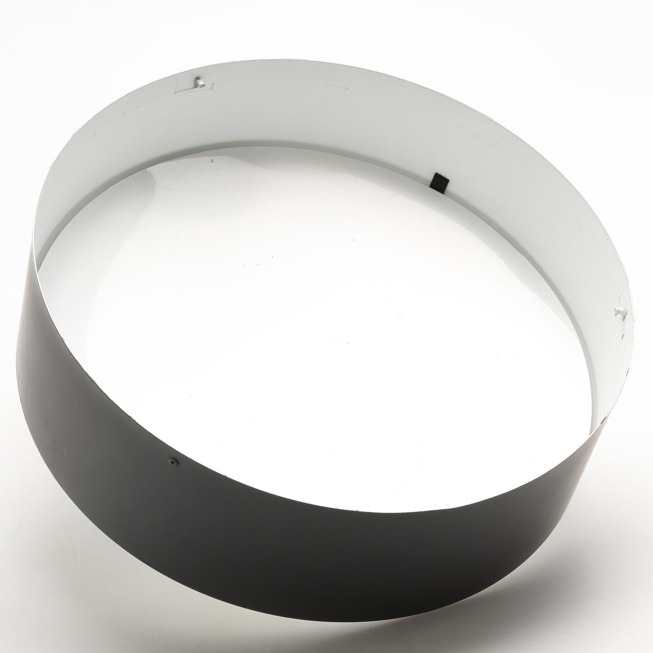 Lacquered metal. Opal glass undershield. Labeled. Diameter 30, height 12 cm.